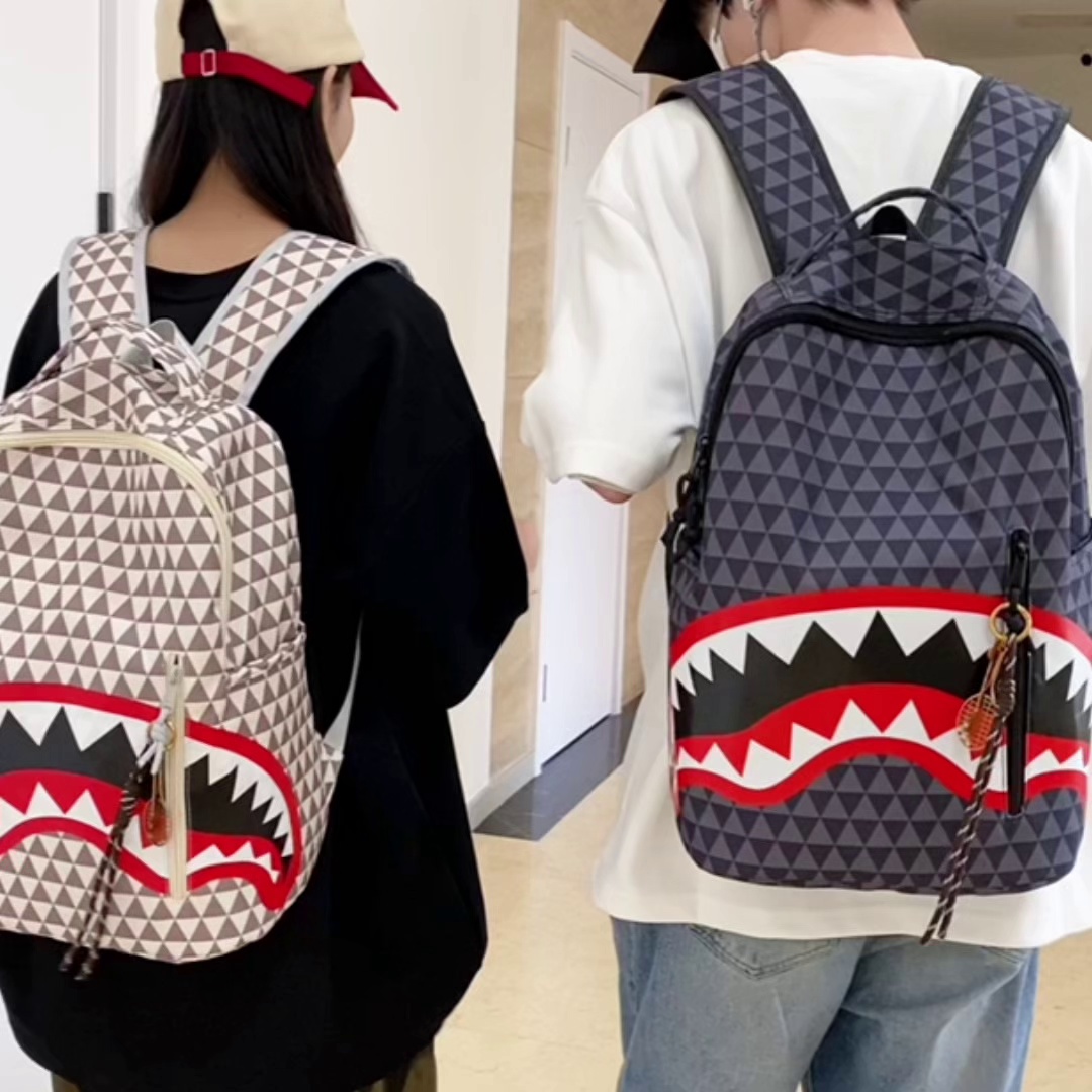 男士双肩包旅行包时尚格子背包学生书包大容量鲨鱼包街头潮流背包