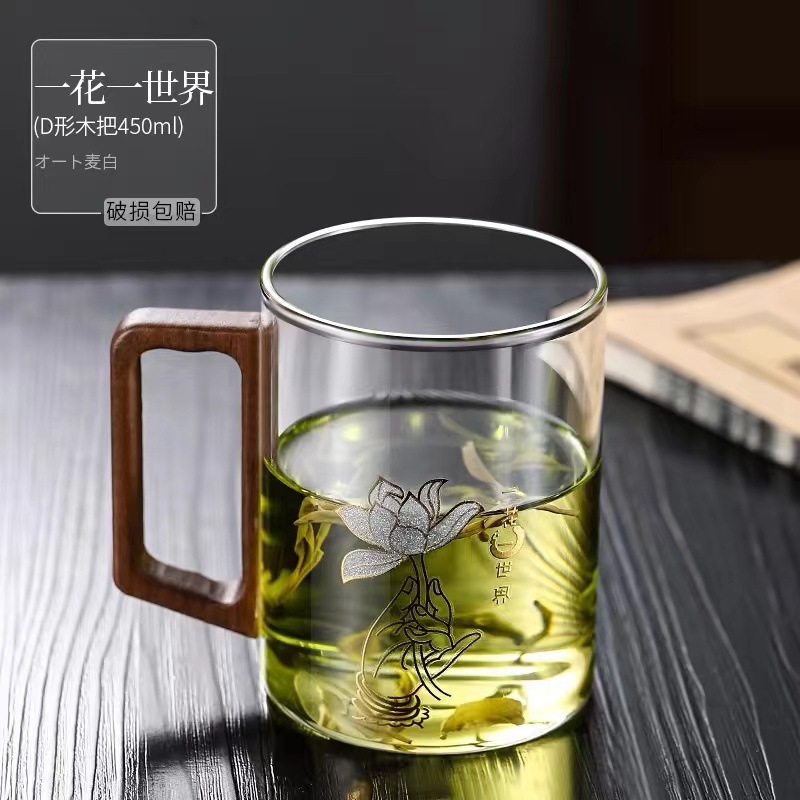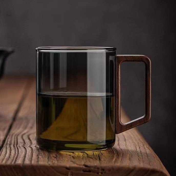 高硼硅耐高温透明玻璃绿茶杯胡桃木把手带盖绿茶杯办公室喝水茶杯