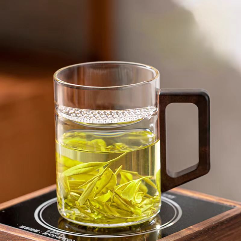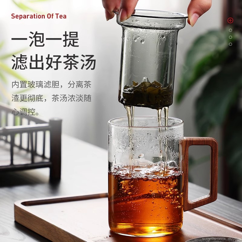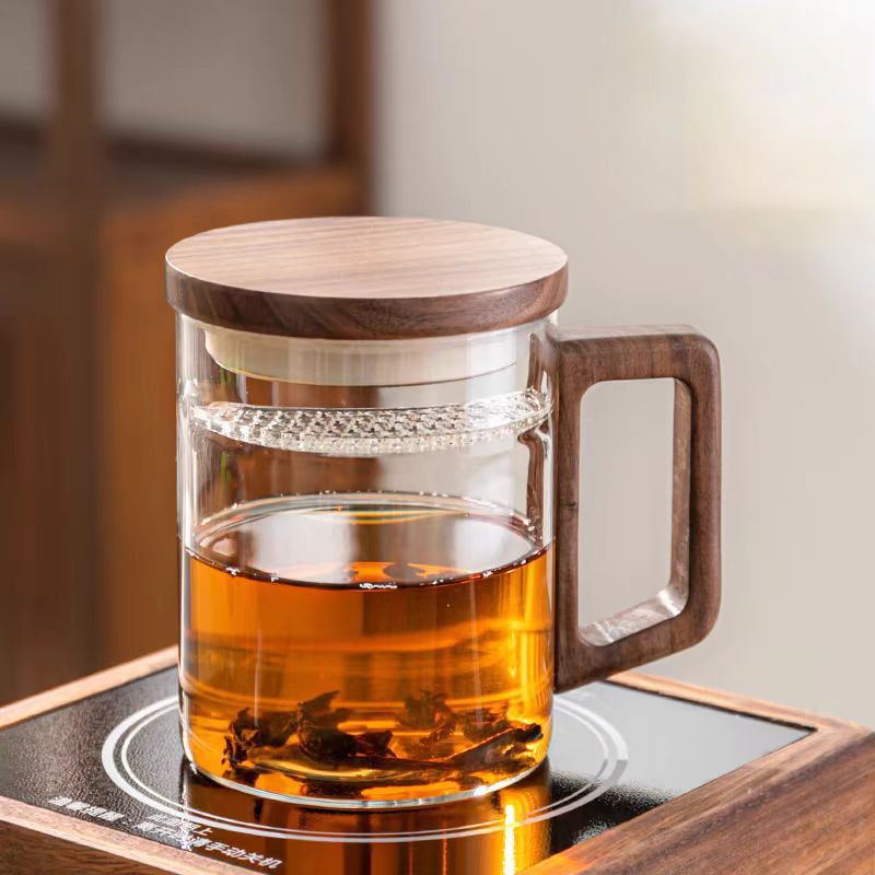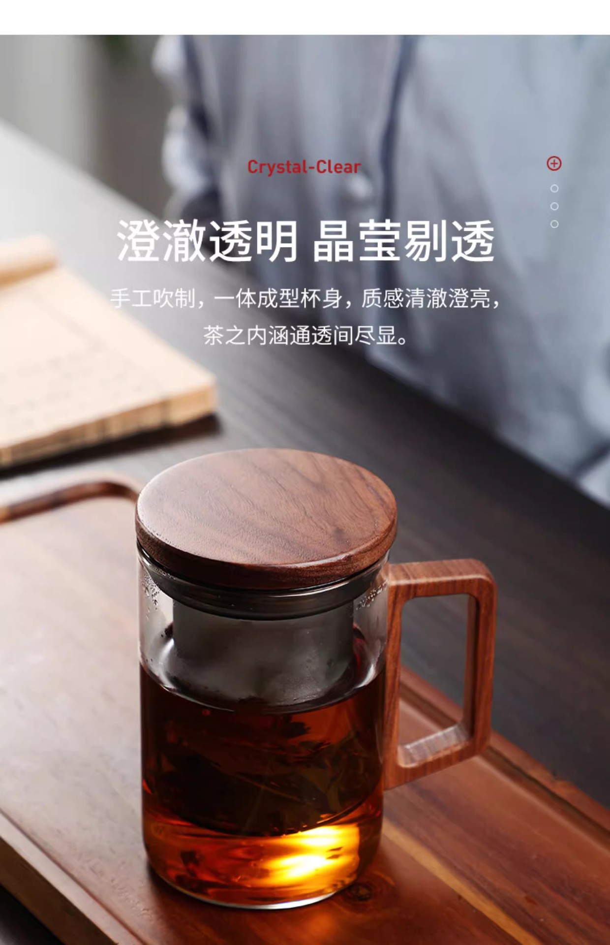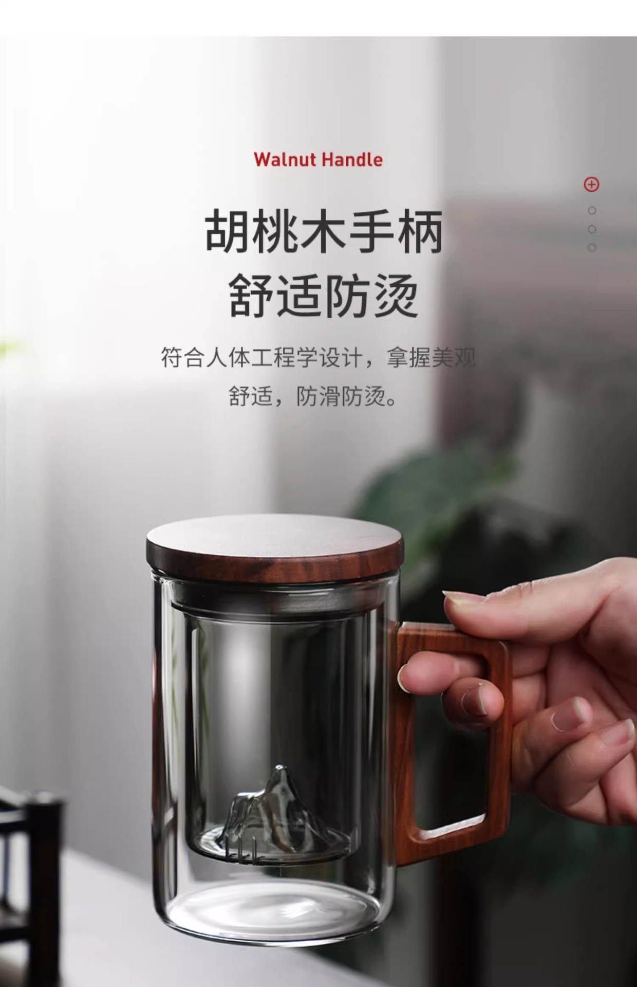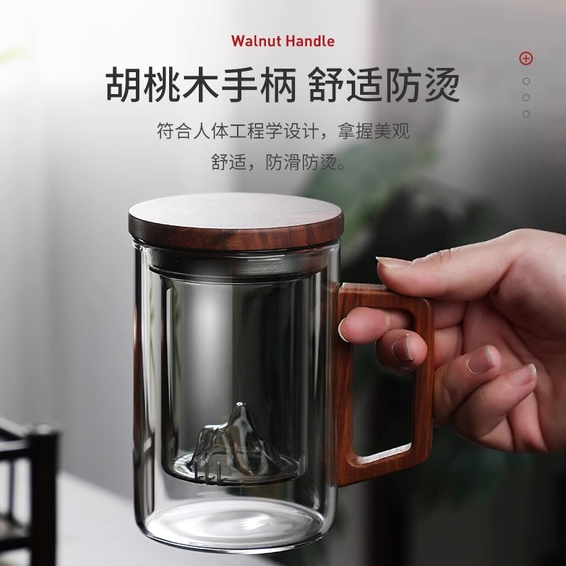 胡桃木把手茶水分离杯木盖子泡茶杯新中式绿茶杯办公三件杯喝水杯