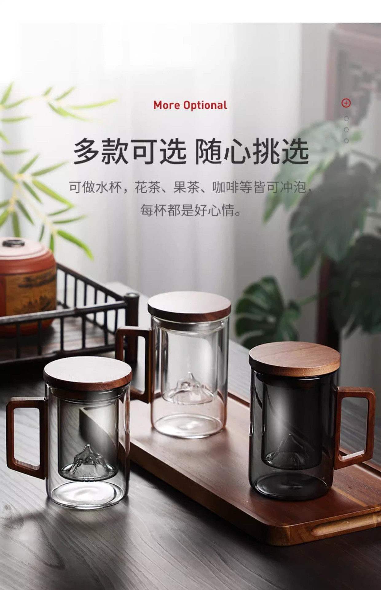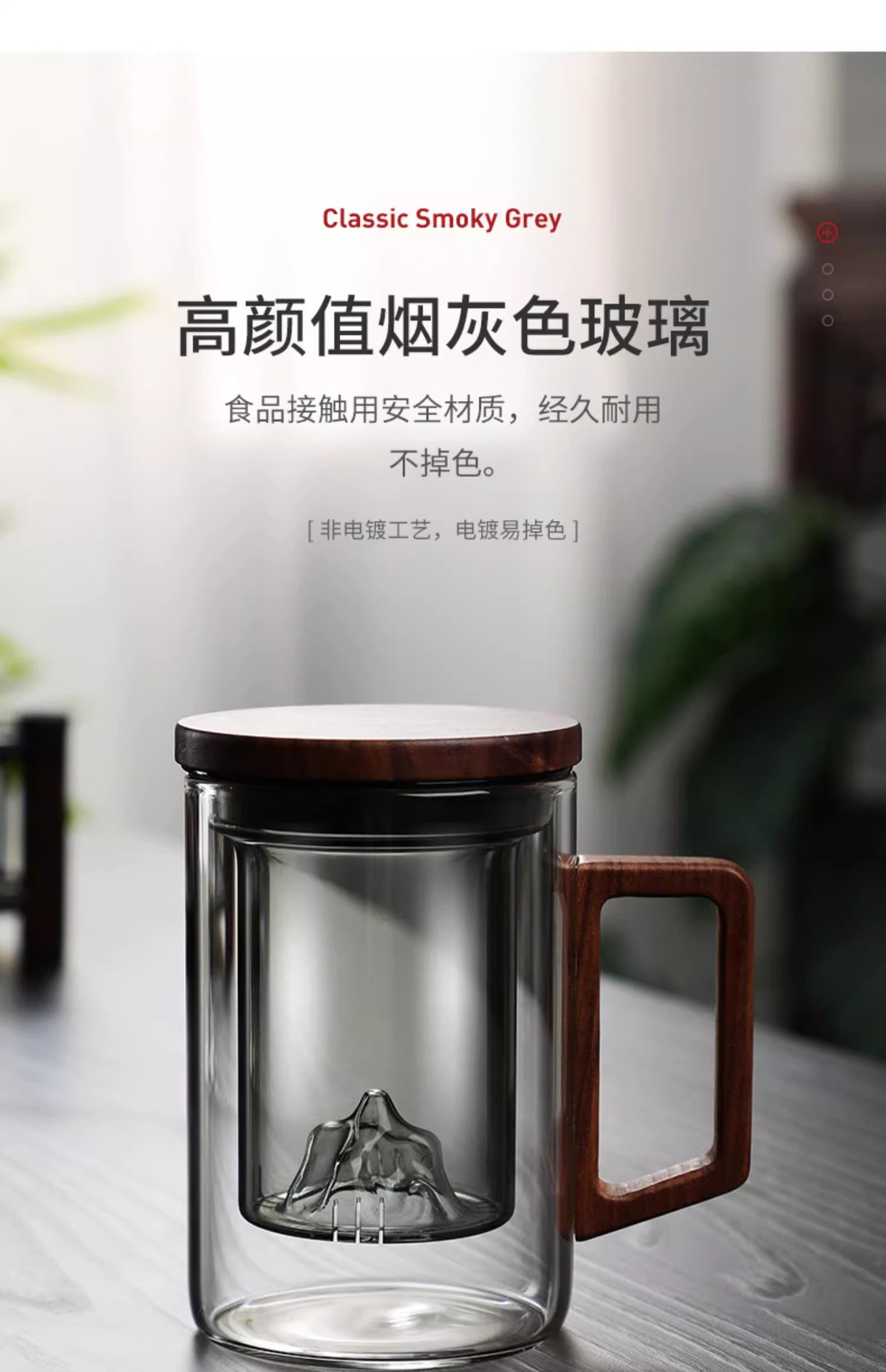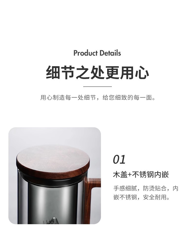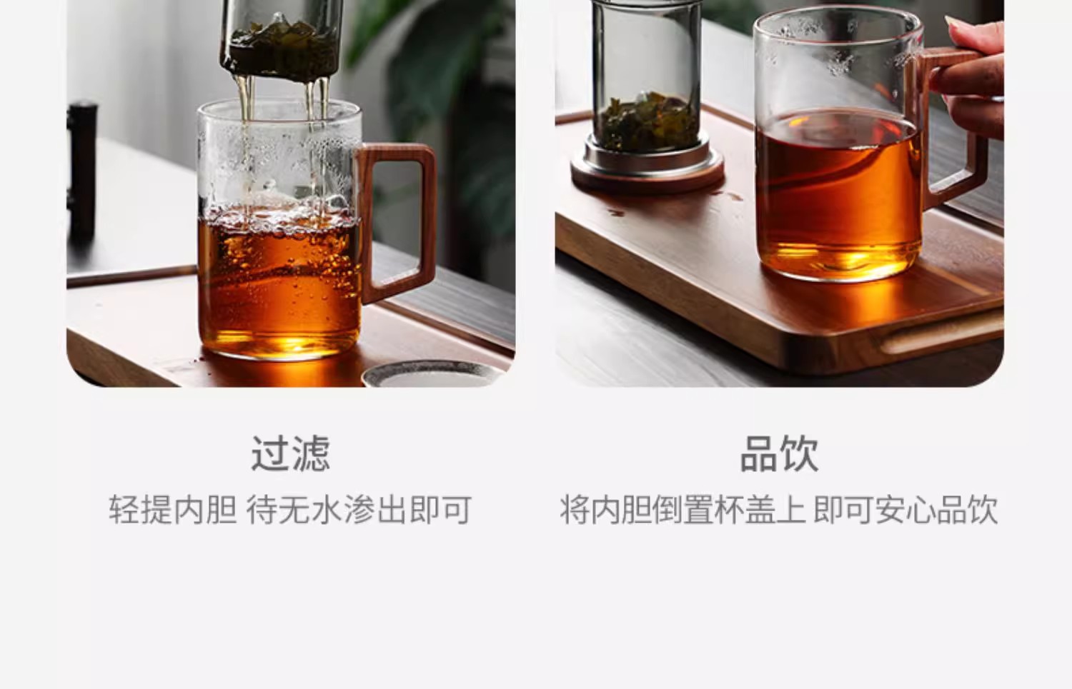 胡桃木把手茶水分离杯木盖子泡茶杯新中式绿茶杯办公三件杯喝水杯