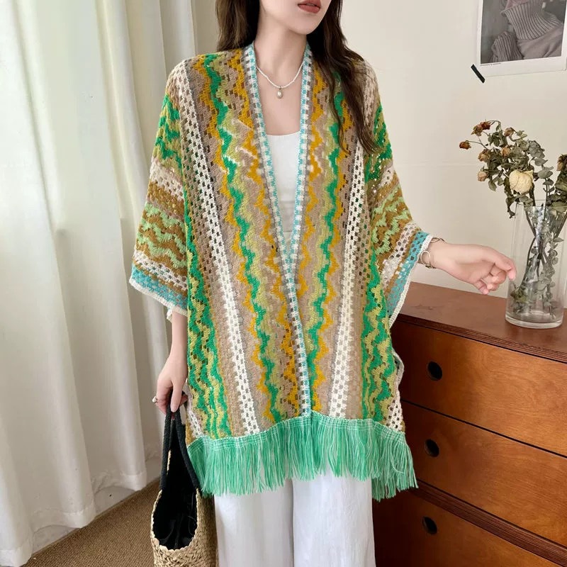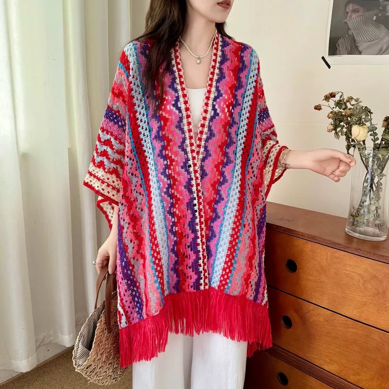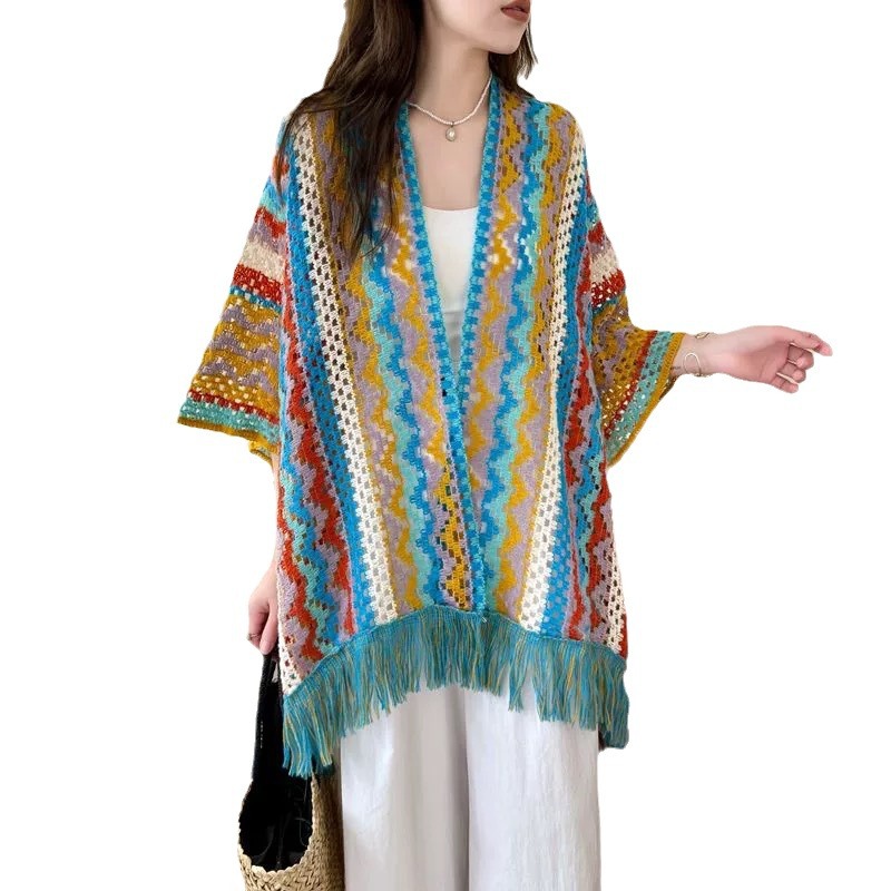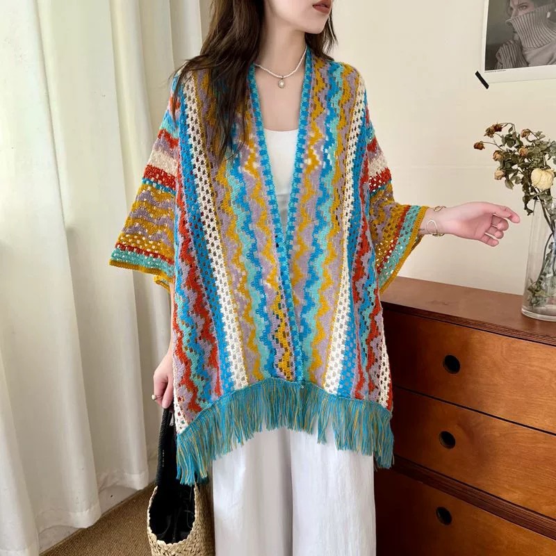 新款楼控波纹披肩民族风彩色条纹流苏针织披肩女云南旅游穿搭批发