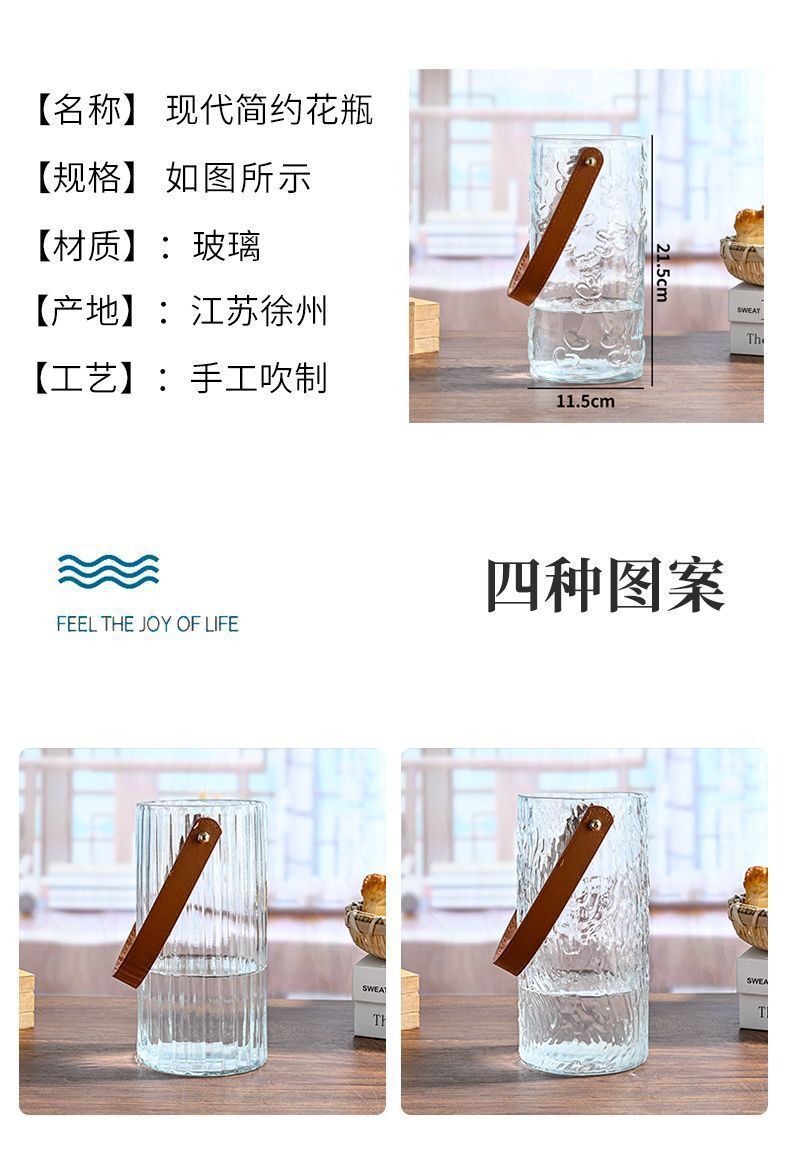 北欧简约ins风皮革手提玻璃花瓶透明富贵竹水培花盆鲜花插摆件