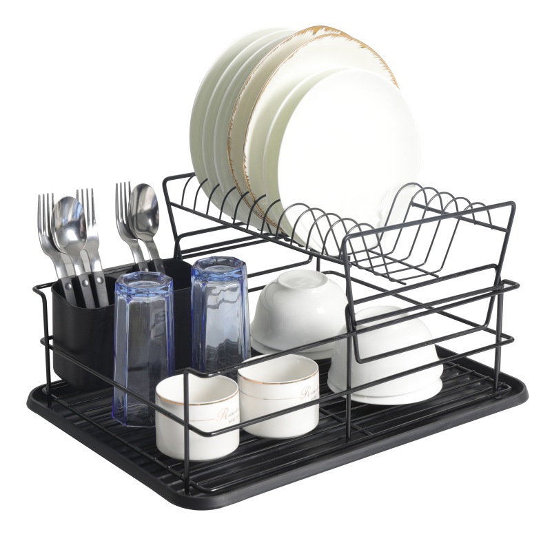 双层黑色带水盘的厨房沥水架多功能厨房收纳置物架铁线餐具碗碟架