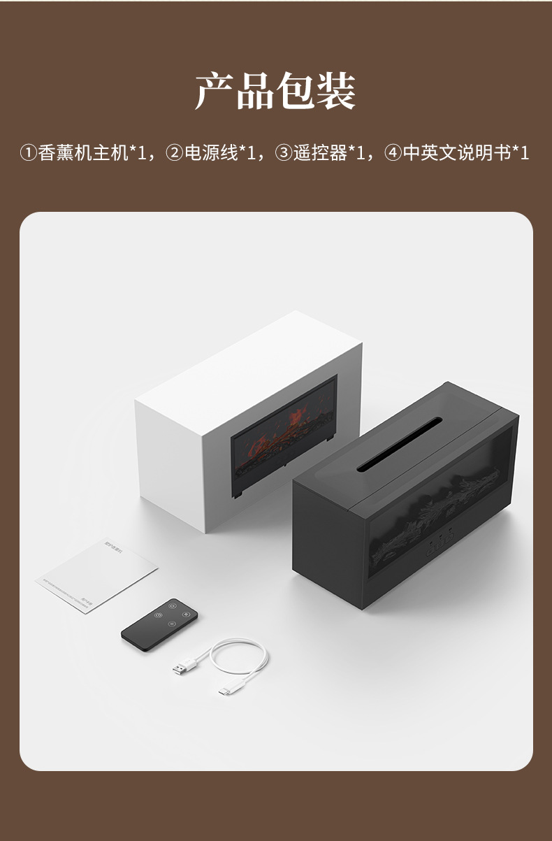 产品附带配件明细:香薰机主机*1、Typec电源线*1、遥控器*1、八国说明书*1