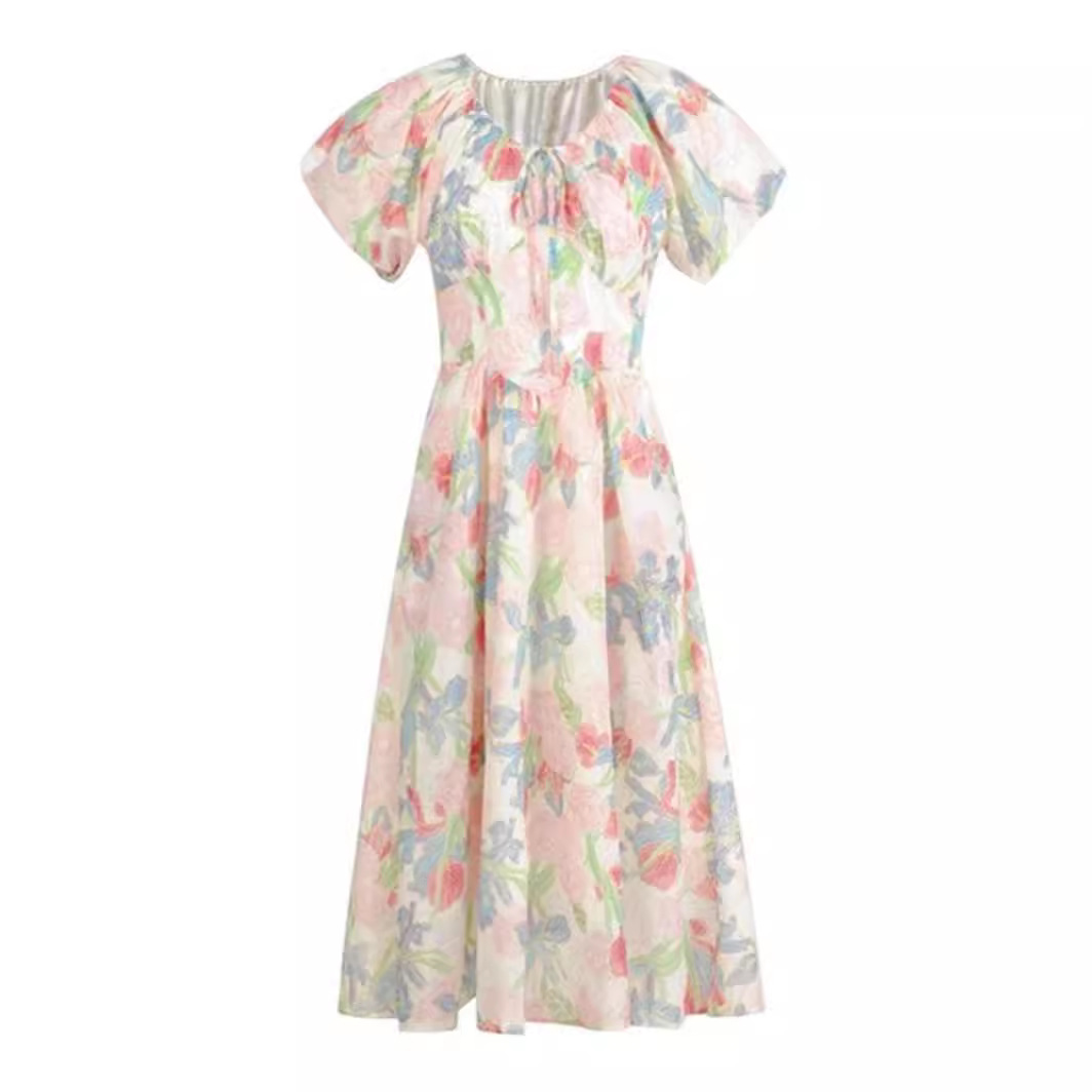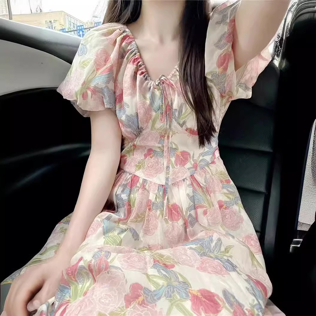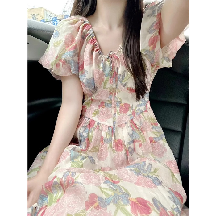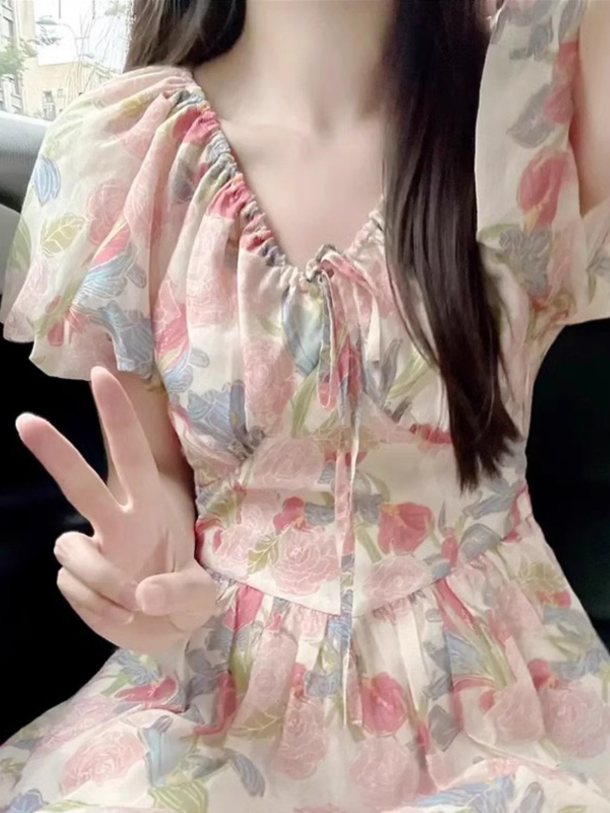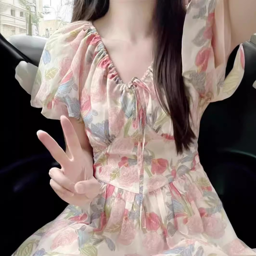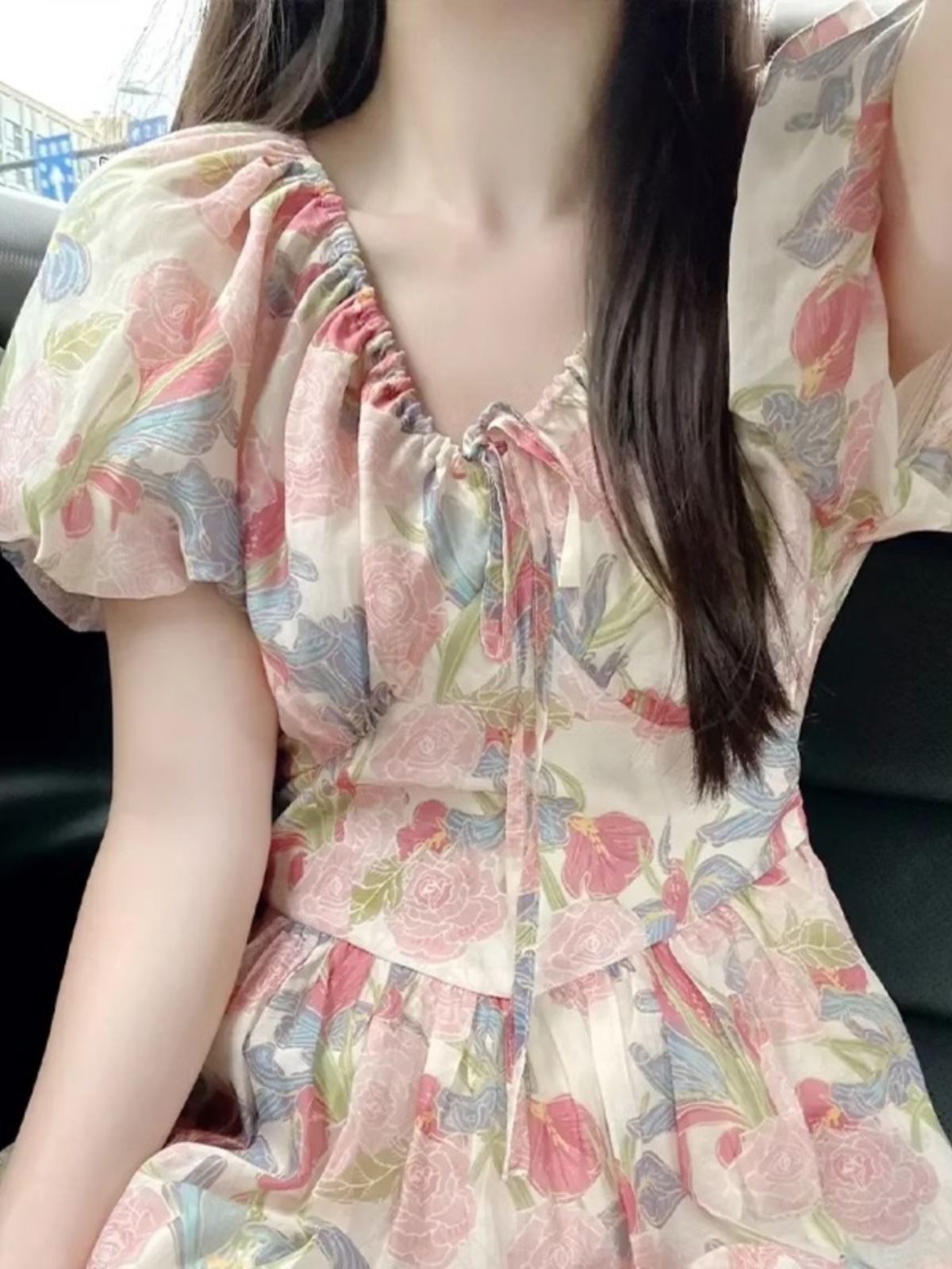 夏季新款衣服女装多巴胺茶歇法式桔梗穿搭气质粉色短袖连衣裙子女