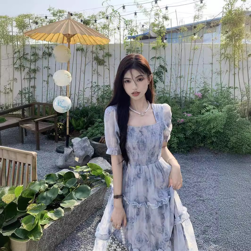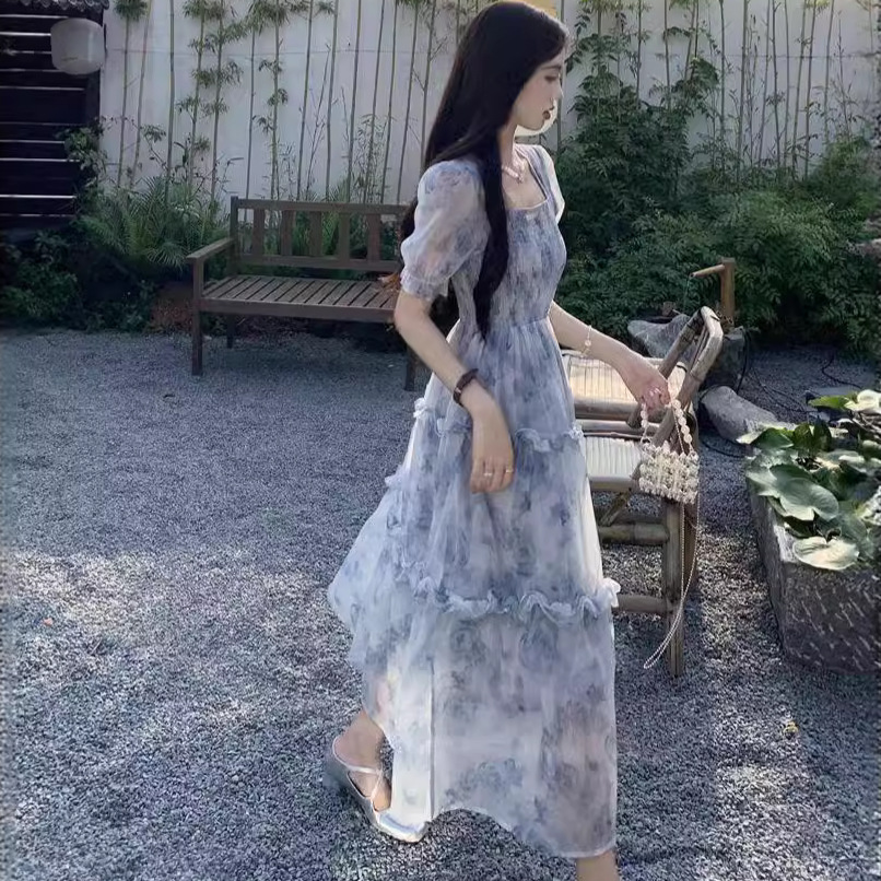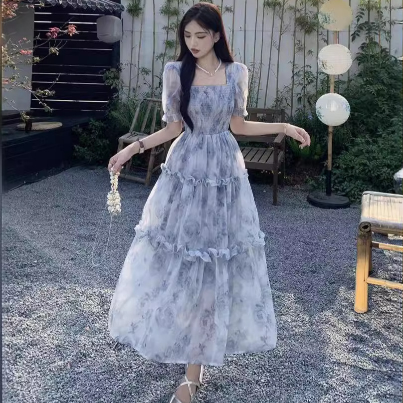 复古方领碎花连衣裙女夏季2025新款超仙森系收腰显瘦木耳边长裙子