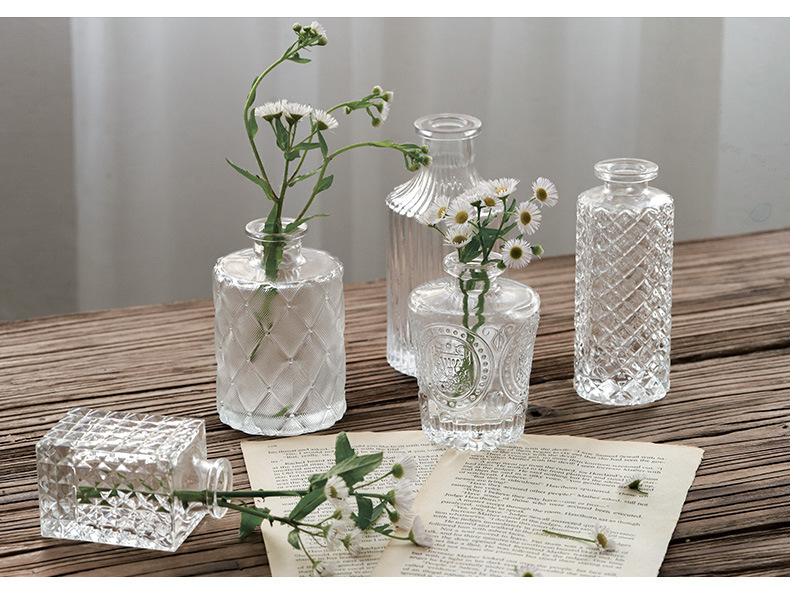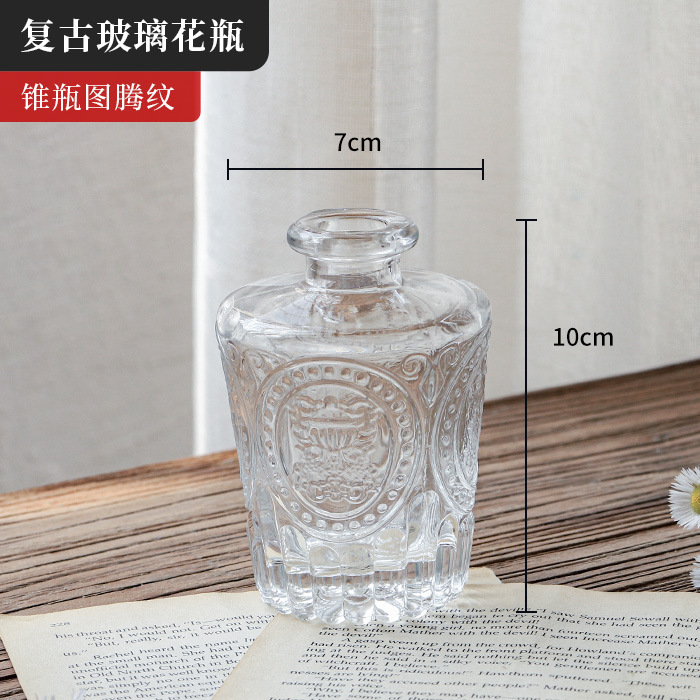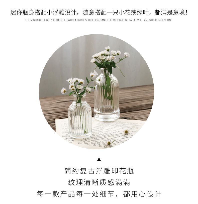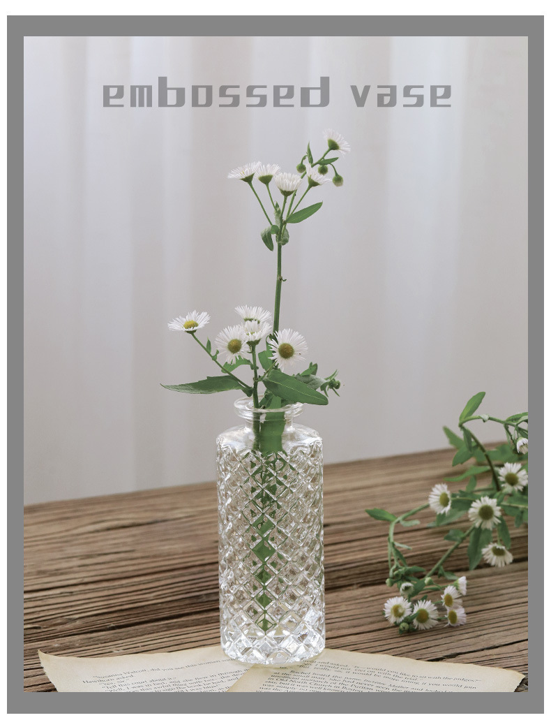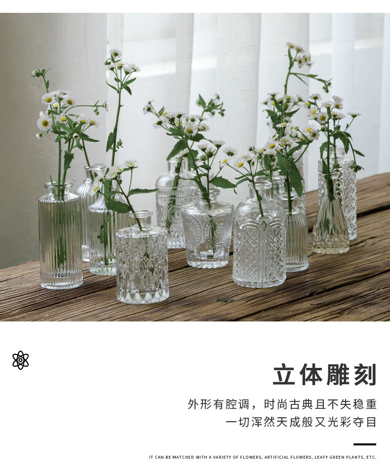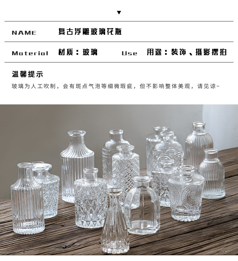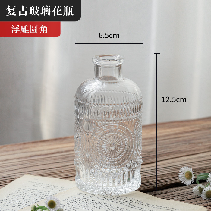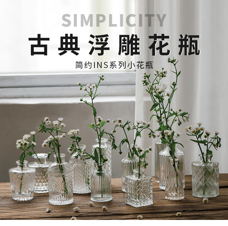家居卧室装饰摆件插花器复古浮雕玻璃花器ins风透明玻璃花瓶