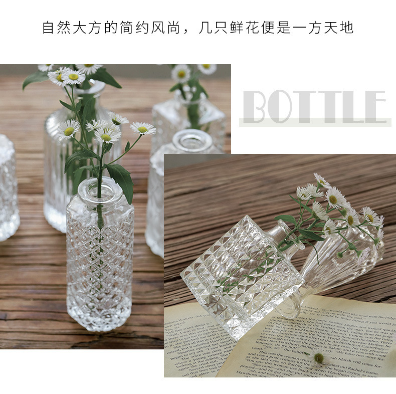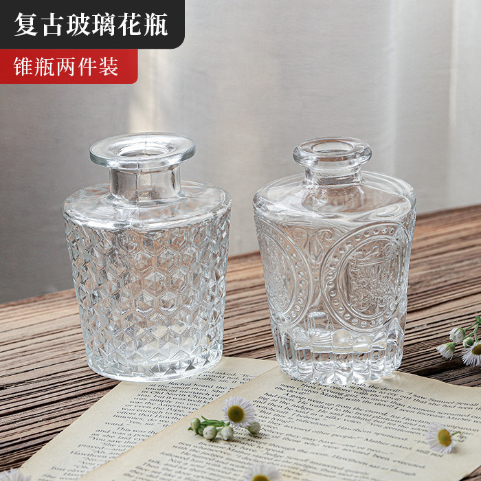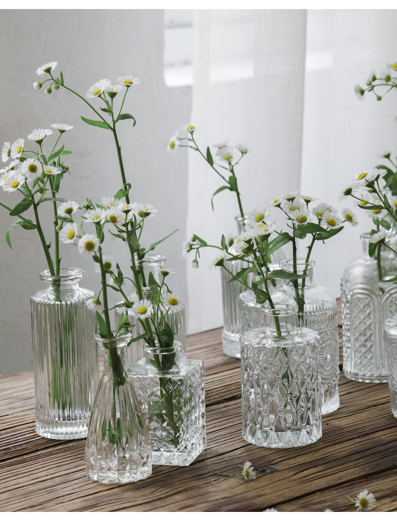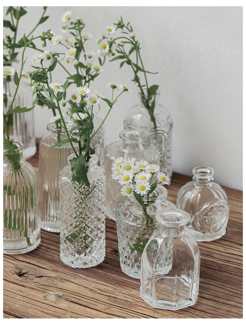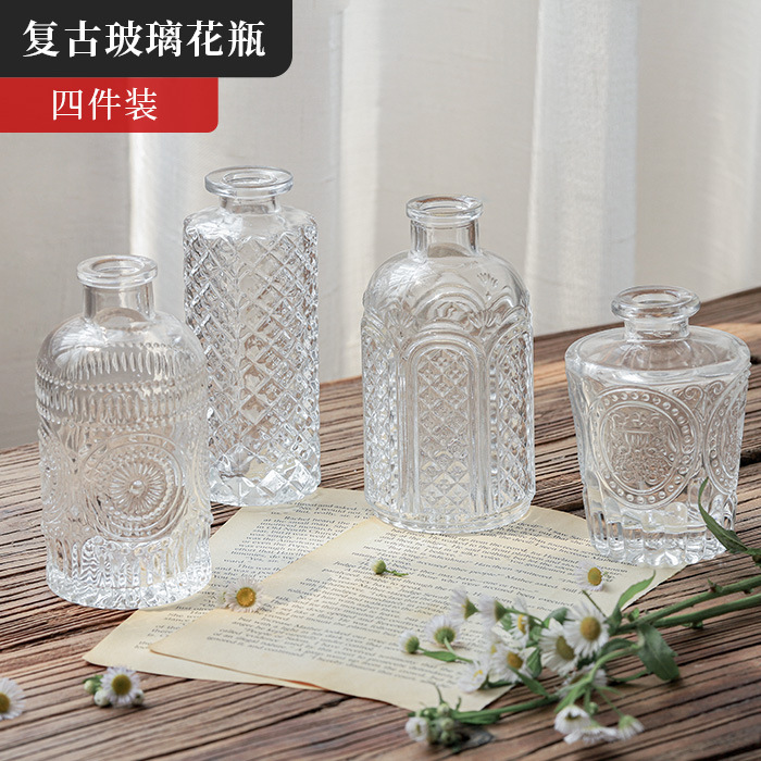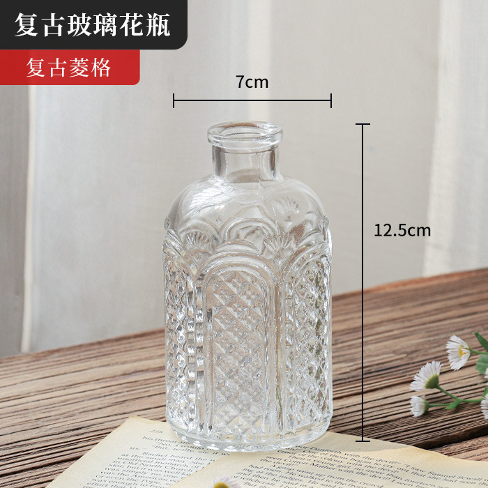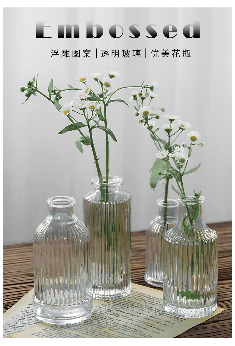 家居卧室装饰摆件插花器复古浮雕玻璃花器ins风透明玻璃花瓶