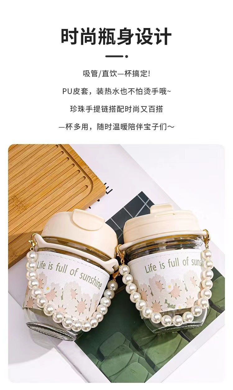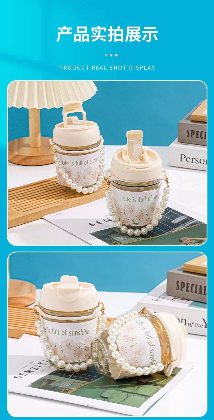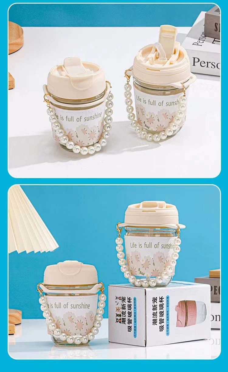 代发包邮珍珠手链双饮杯ins高颜值伴手礼杯子便携带吸管玻璃水杯