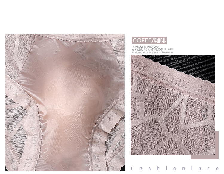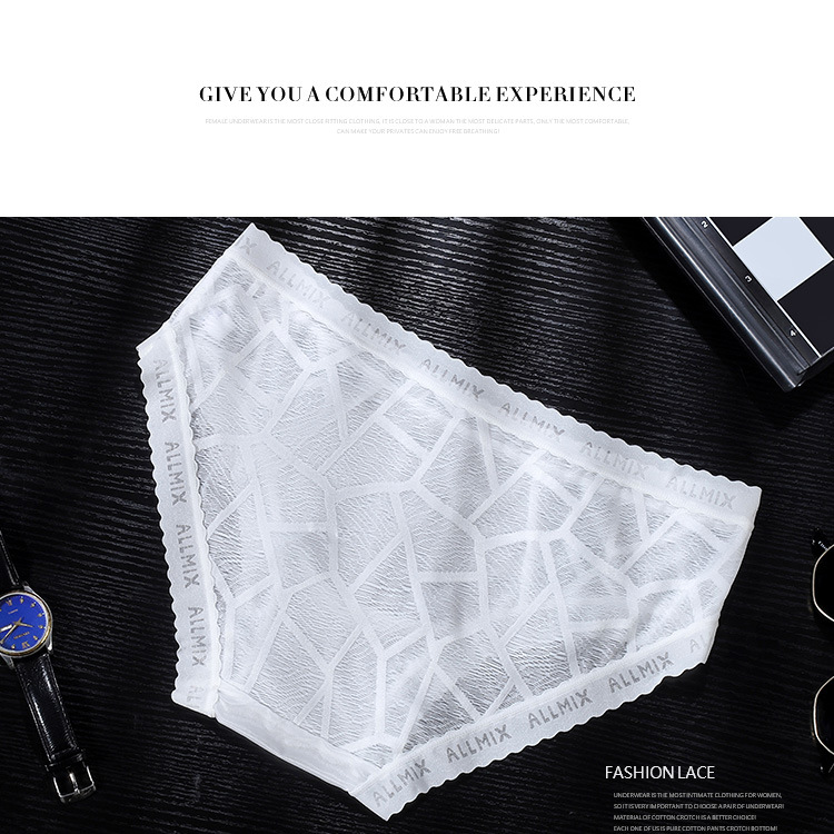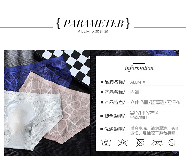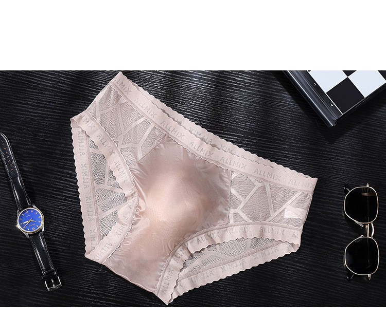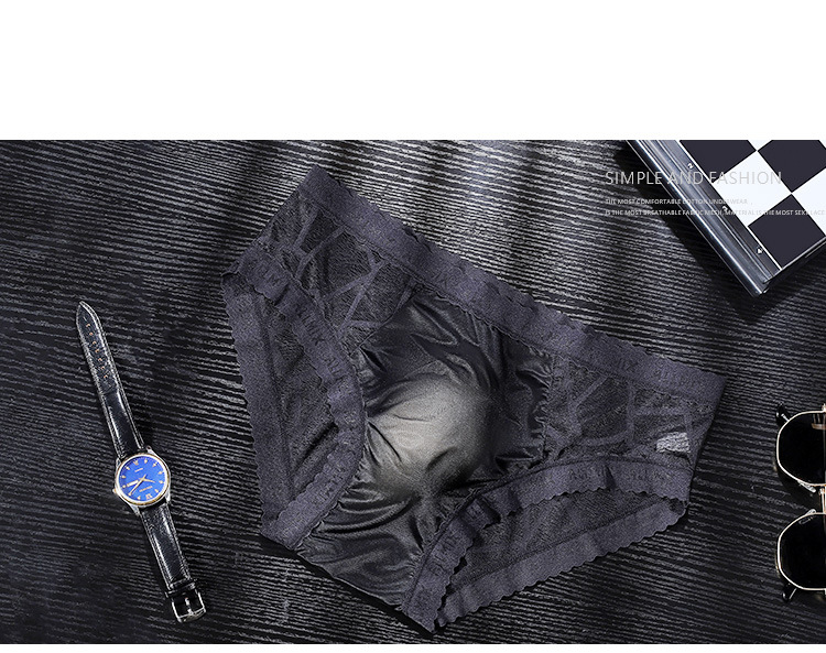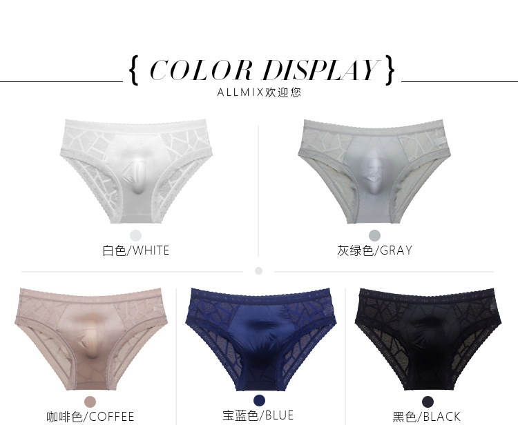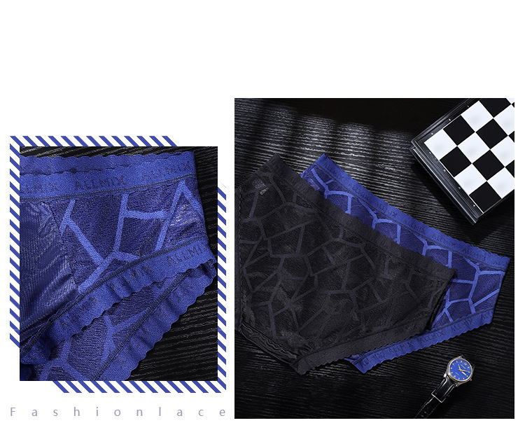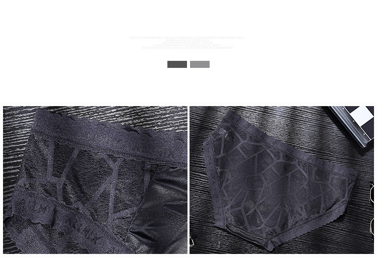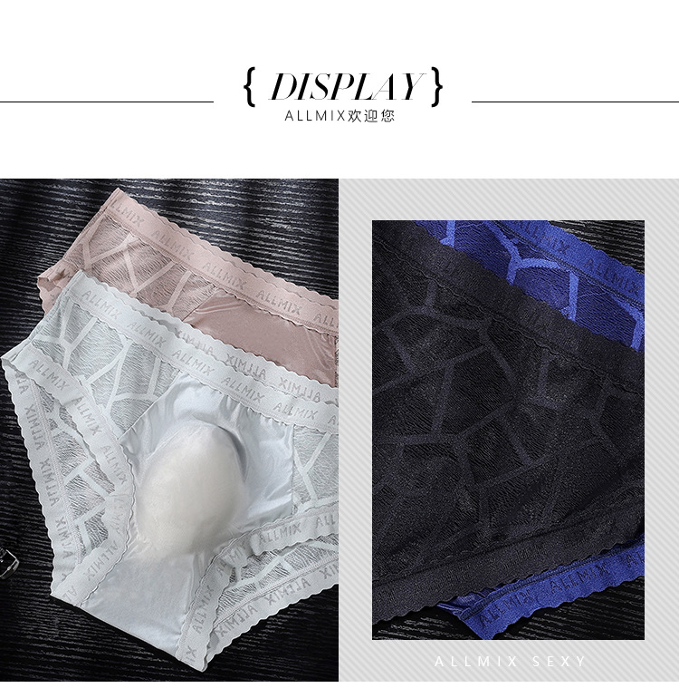 跨境外贸男士内裤3D凸囊性感字母半透明冰丝镂空蕾丝薄款三角裤