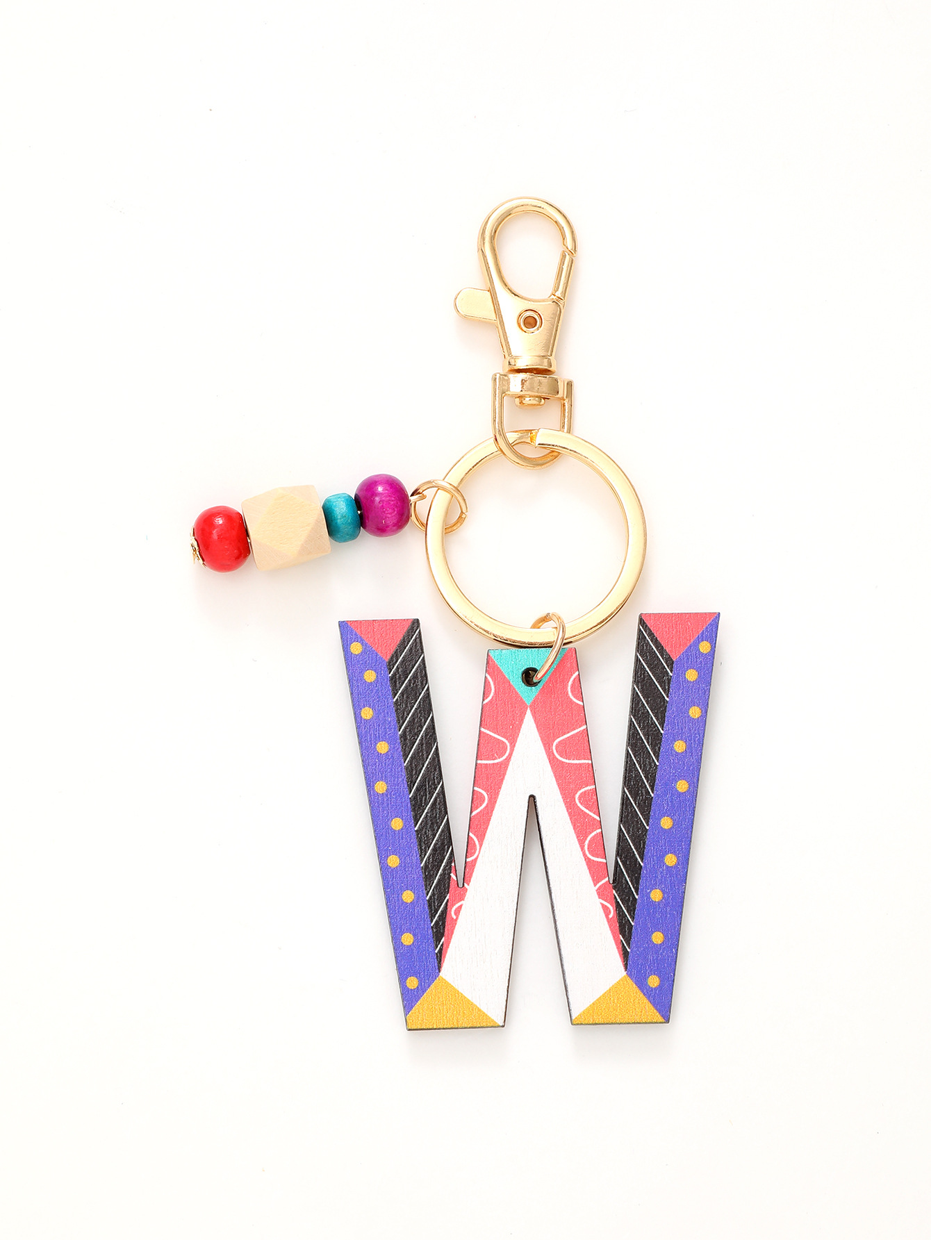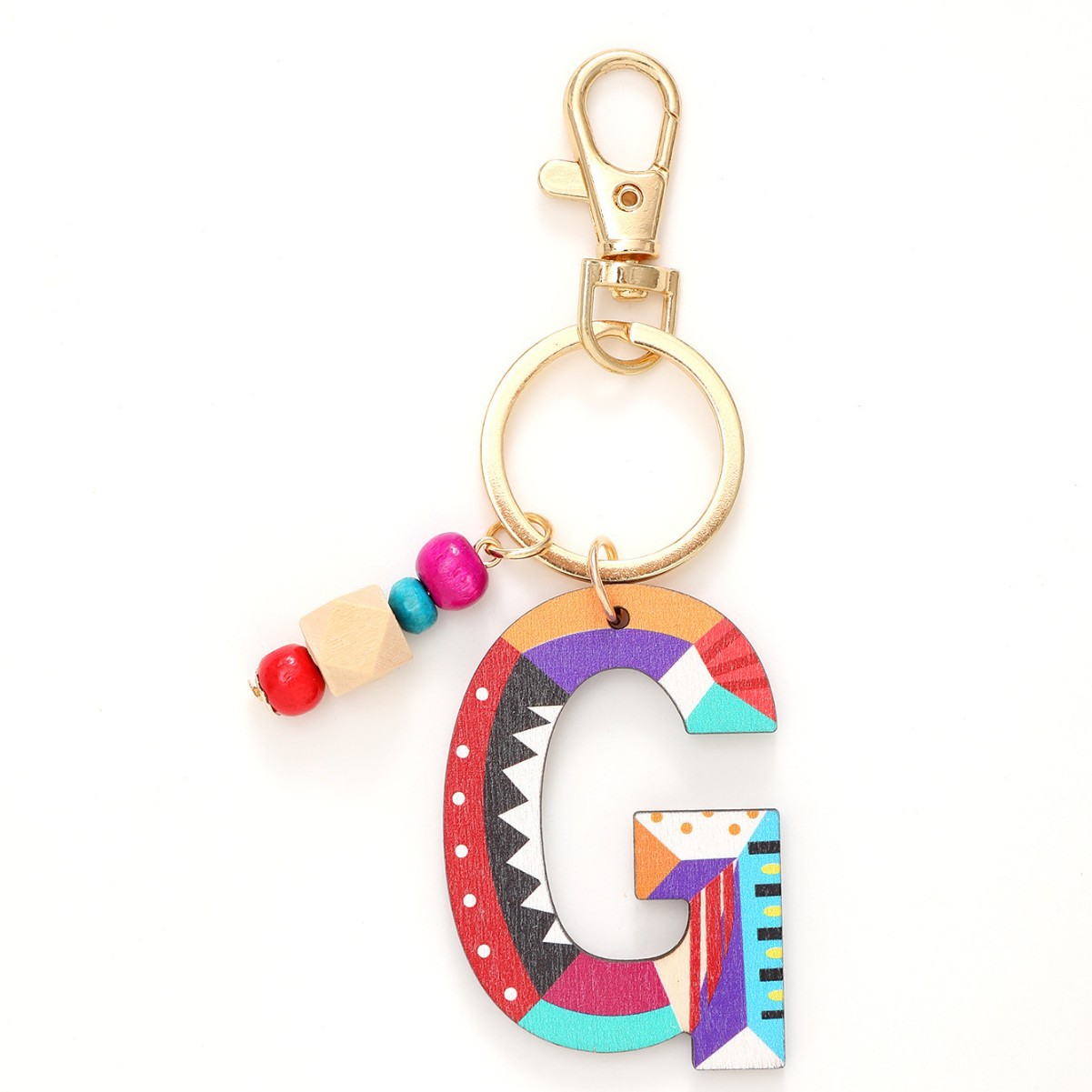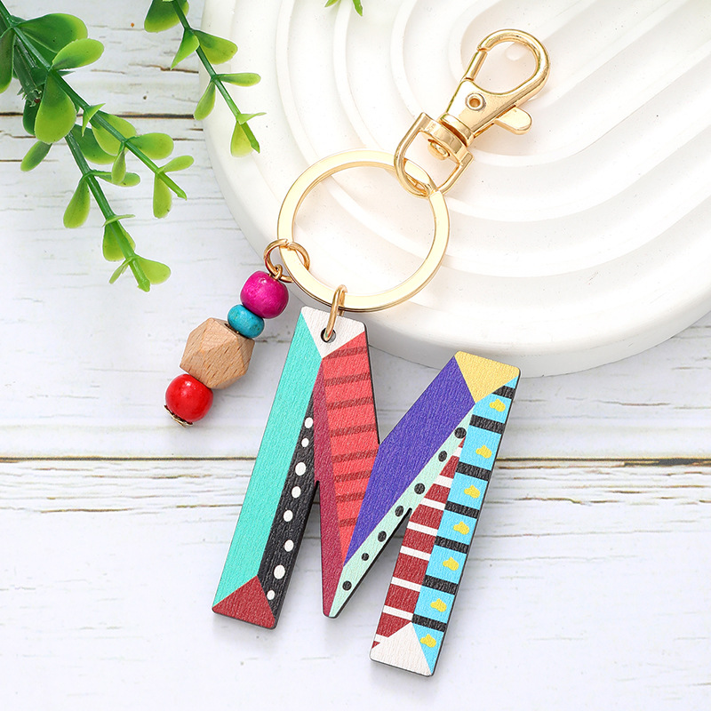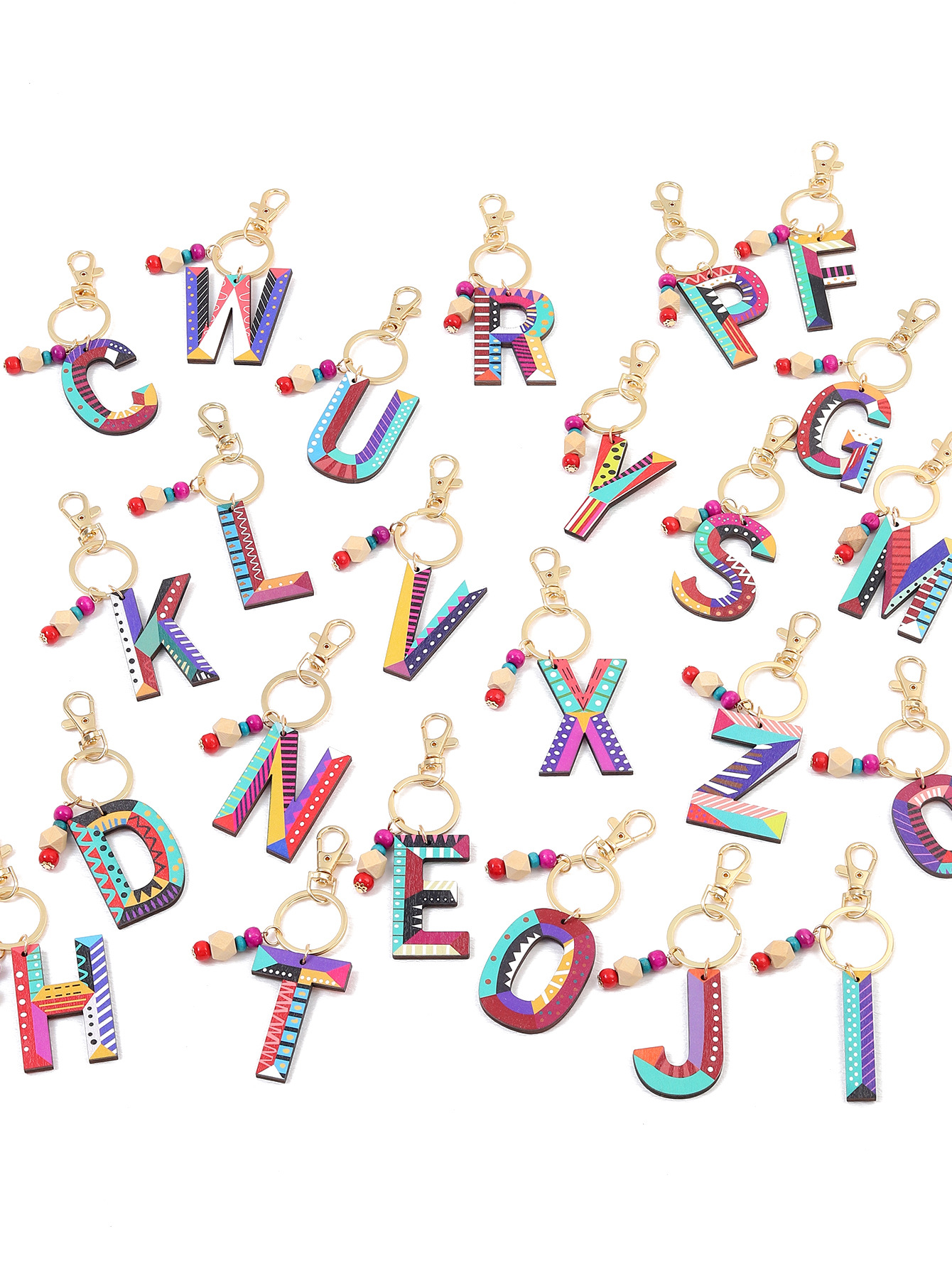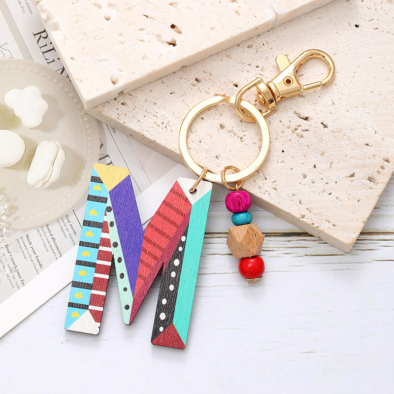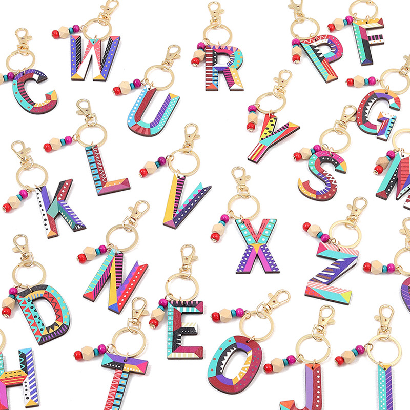 新款度假风彩色木质木珠26字母钥匙扣钥匙链包挂配饰跨境亚马逊