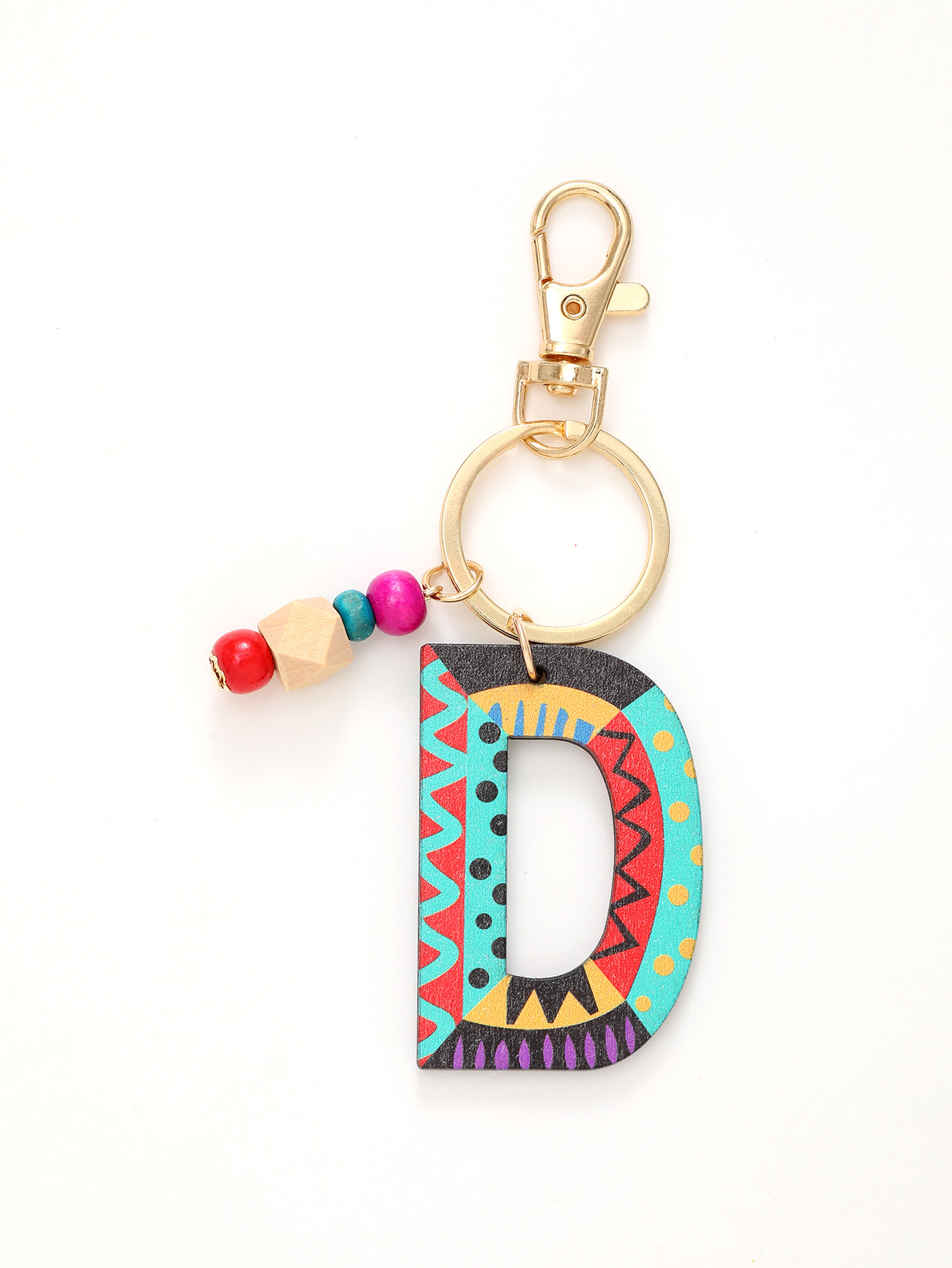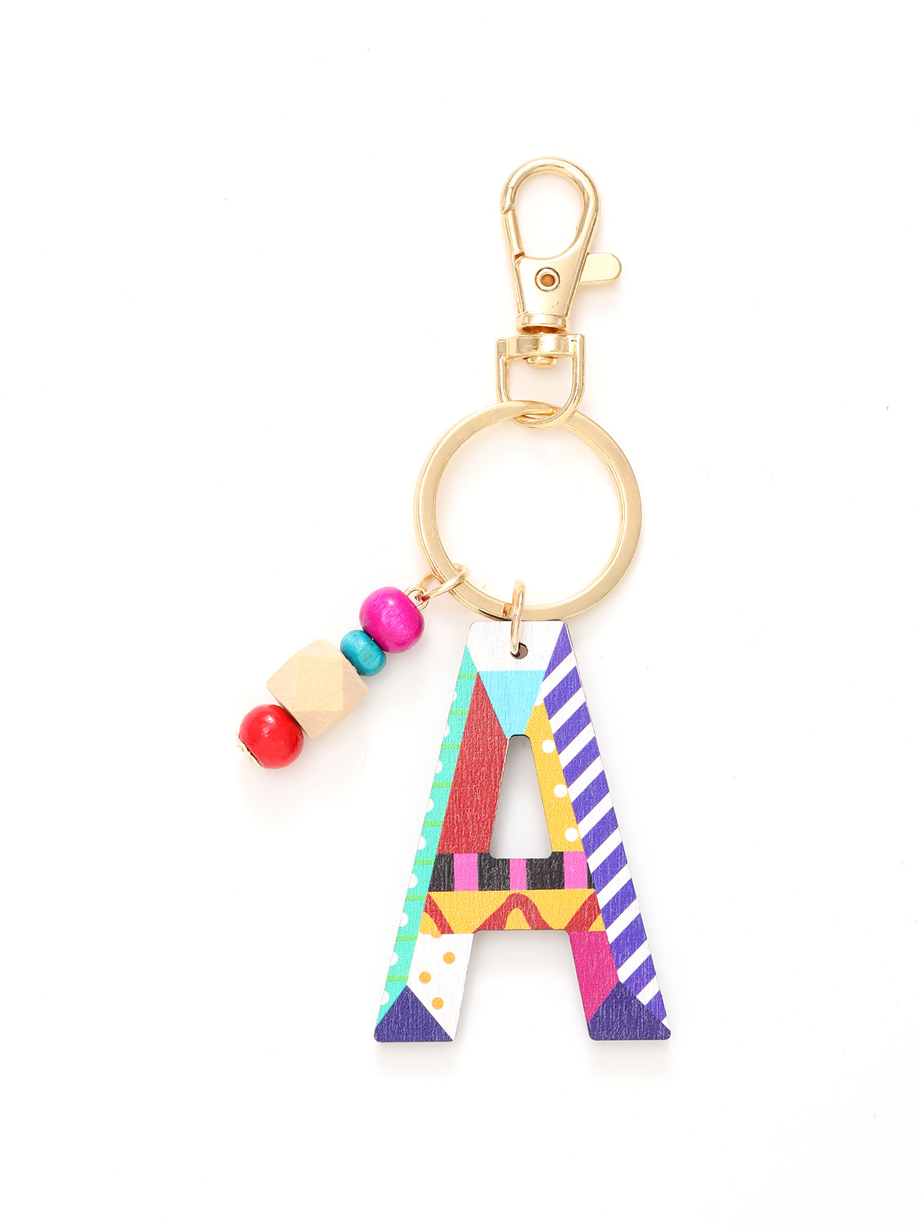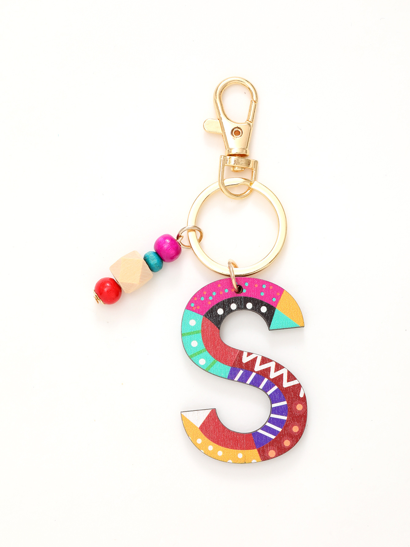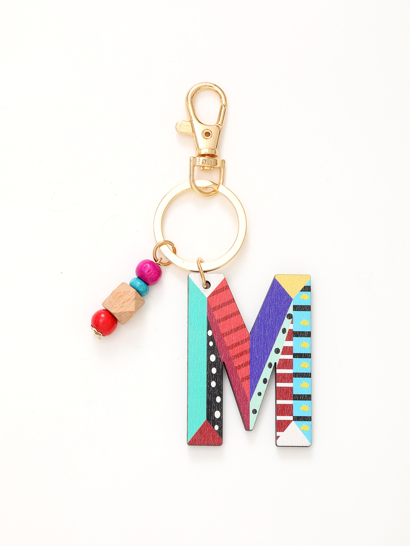 新款度假风彩色木质木珠26字母钥匙扣钥匙链包挂配饰跨境亚马逊