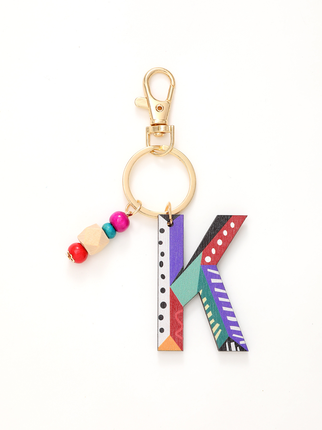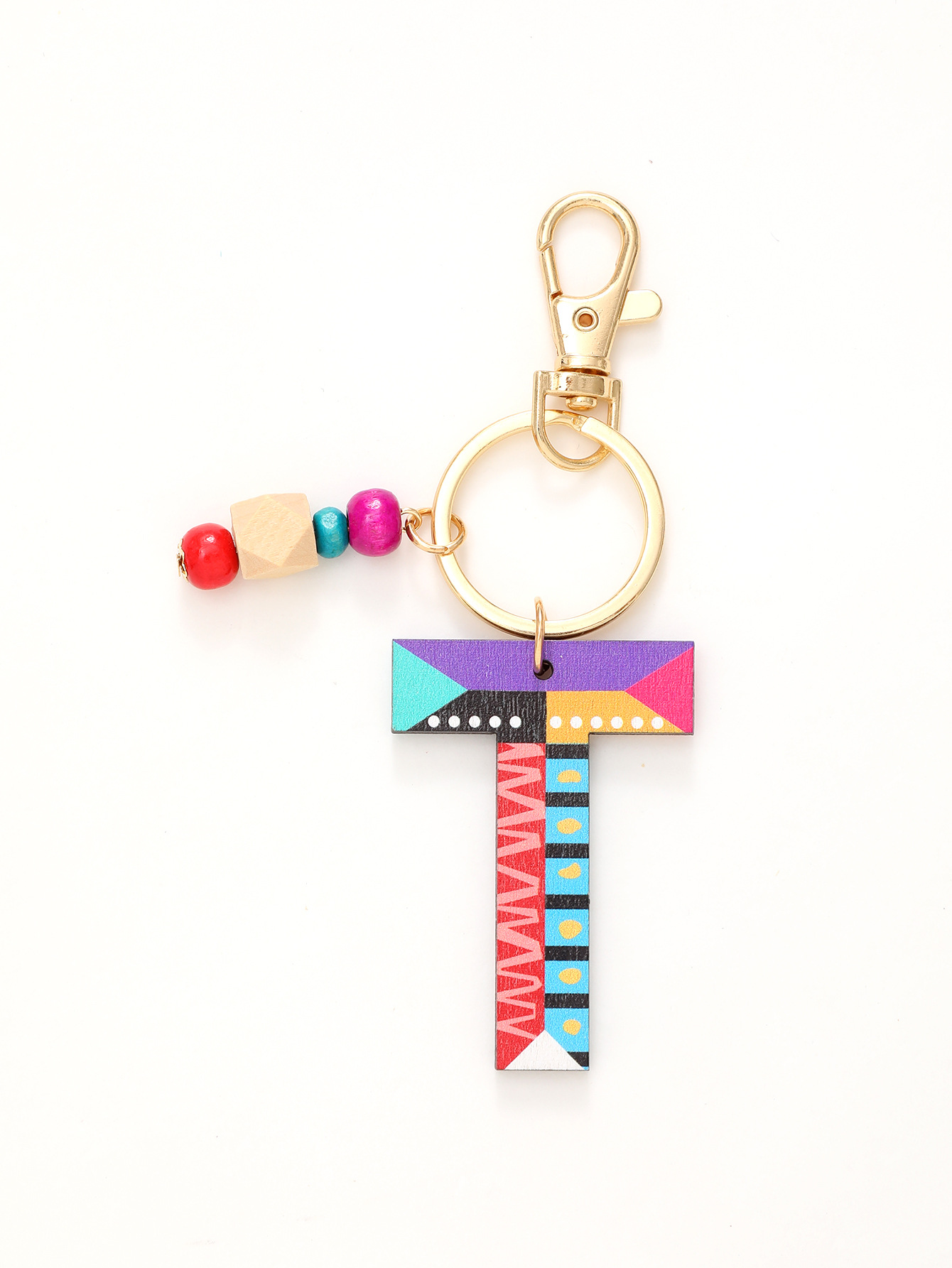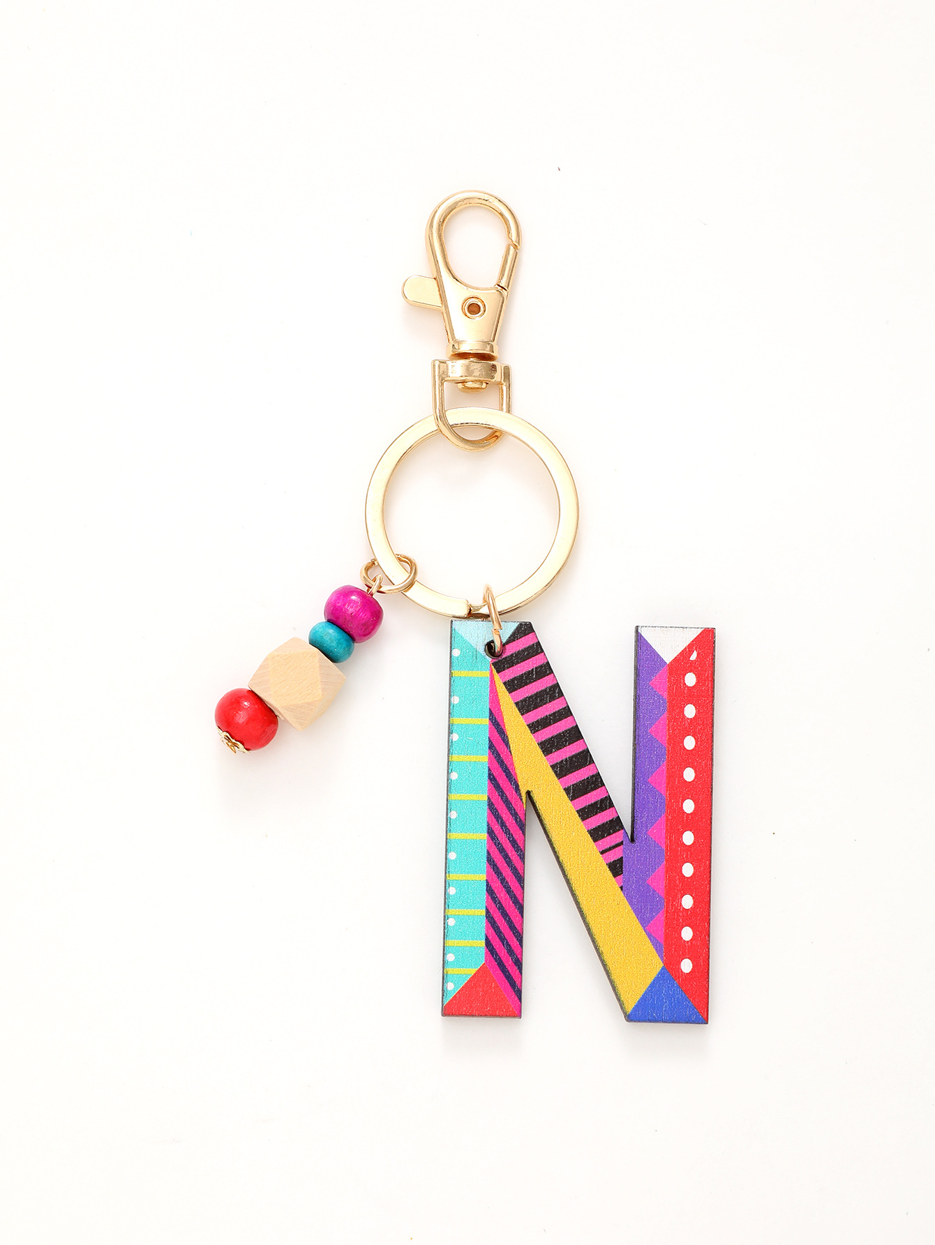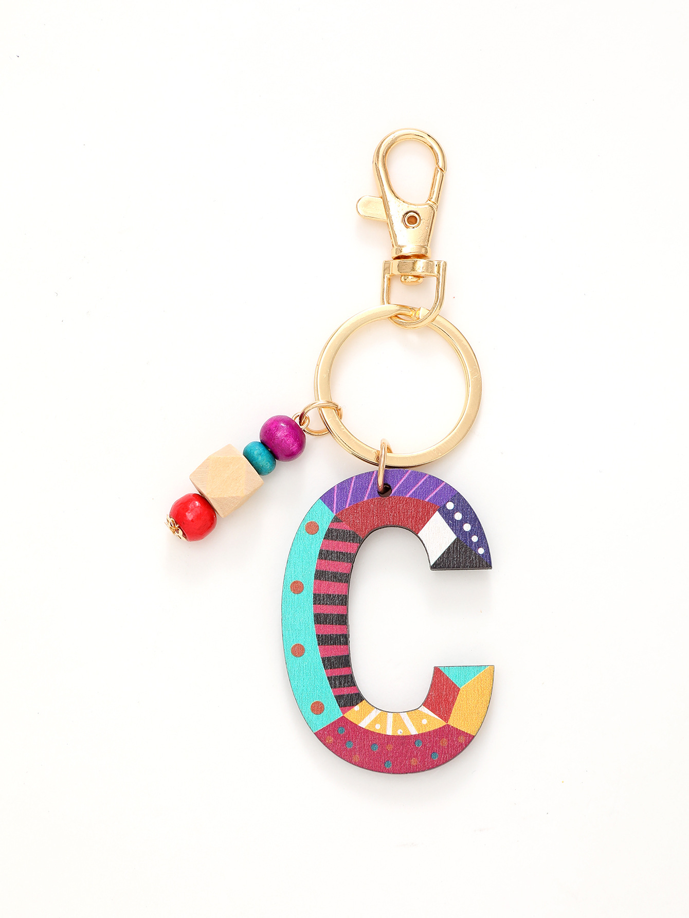 新款度假风彩色木质木珠26字母钥匙扣钥匙链包挂配饰跨境亚马逊