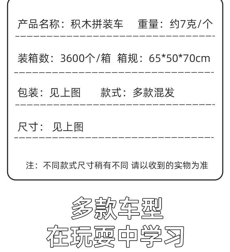 儿童积木拼装车六款 创意拼插DIY玩具幼儿园礼品学生奖品地推玩具