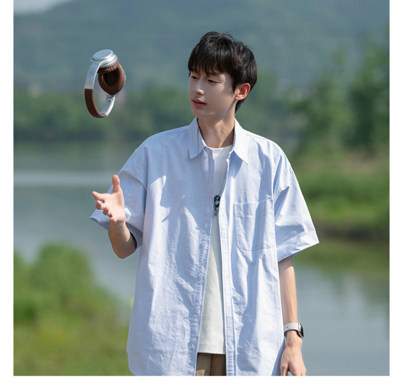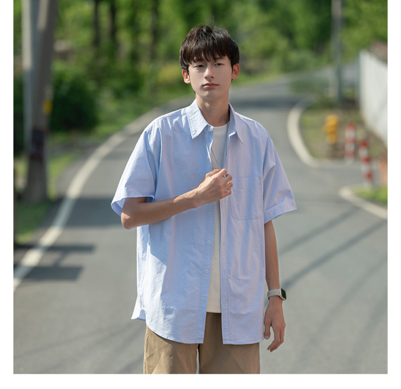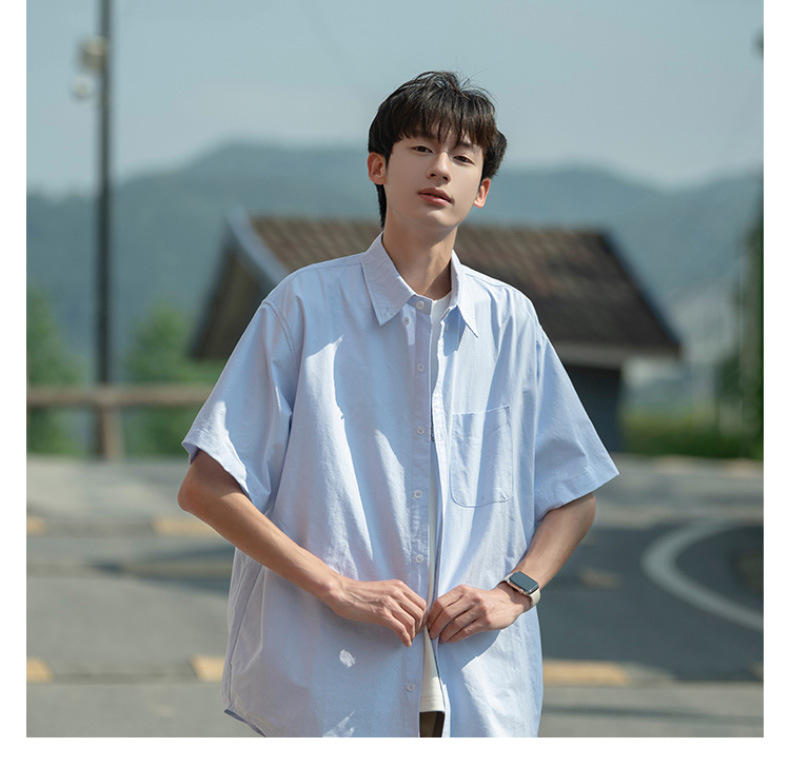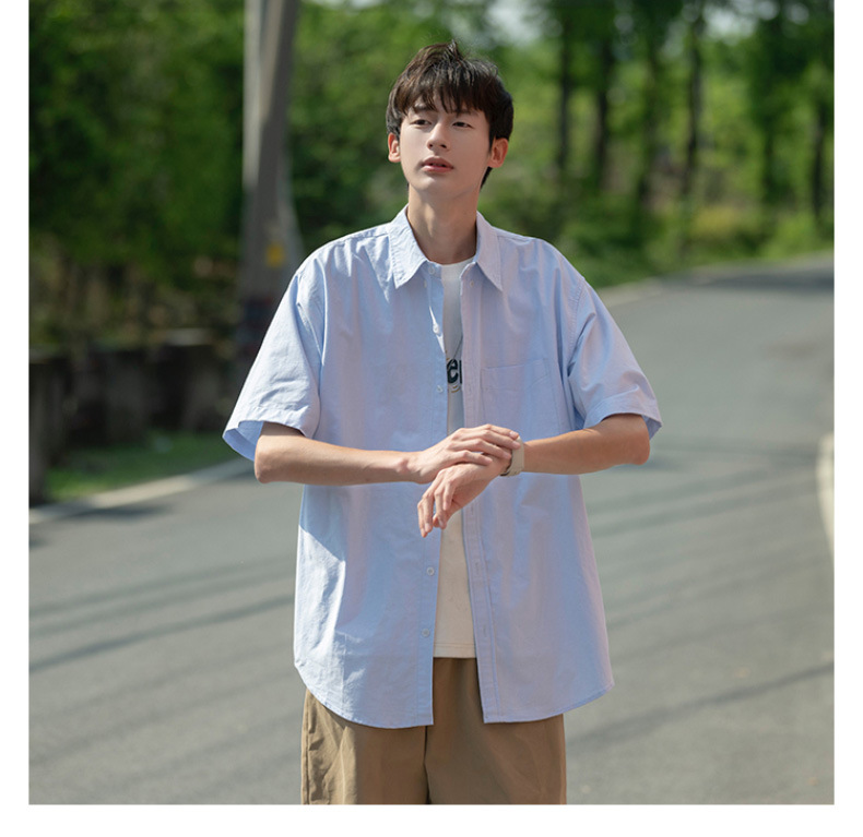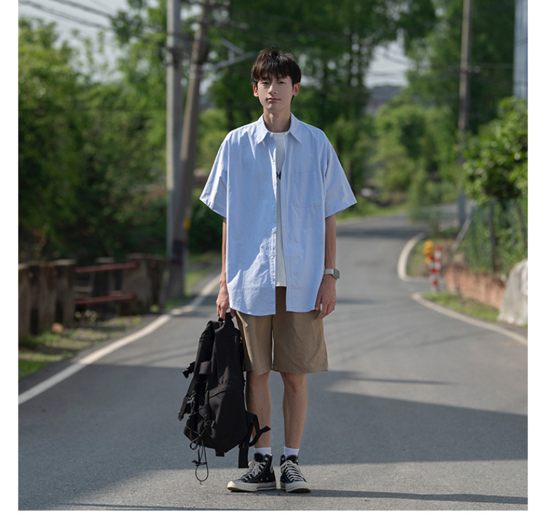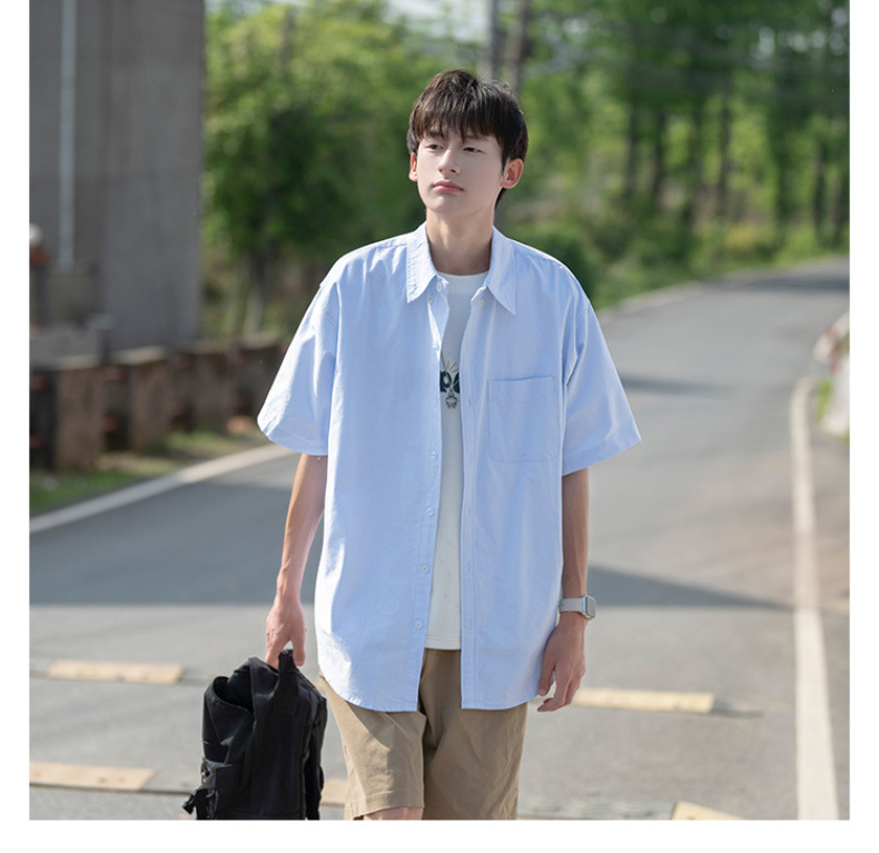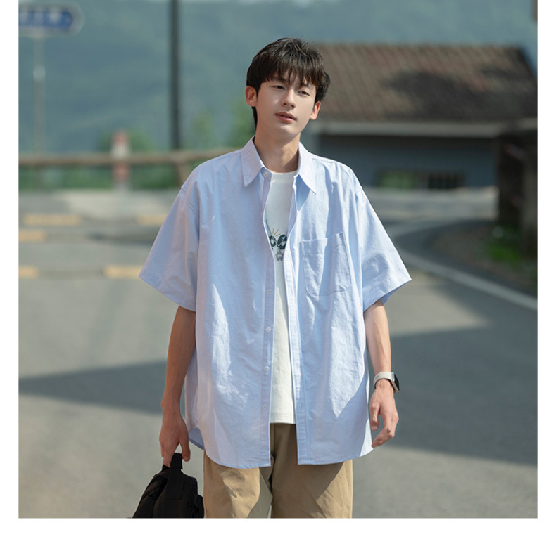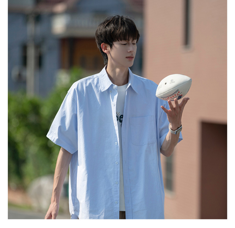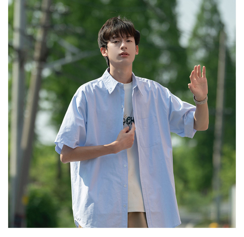 NICEVOW浅蓝色休闲短袖衬衫男夏季宽松日系上衣青少年衬衣外套