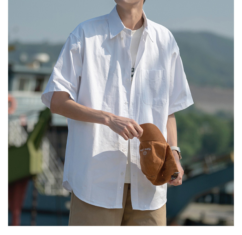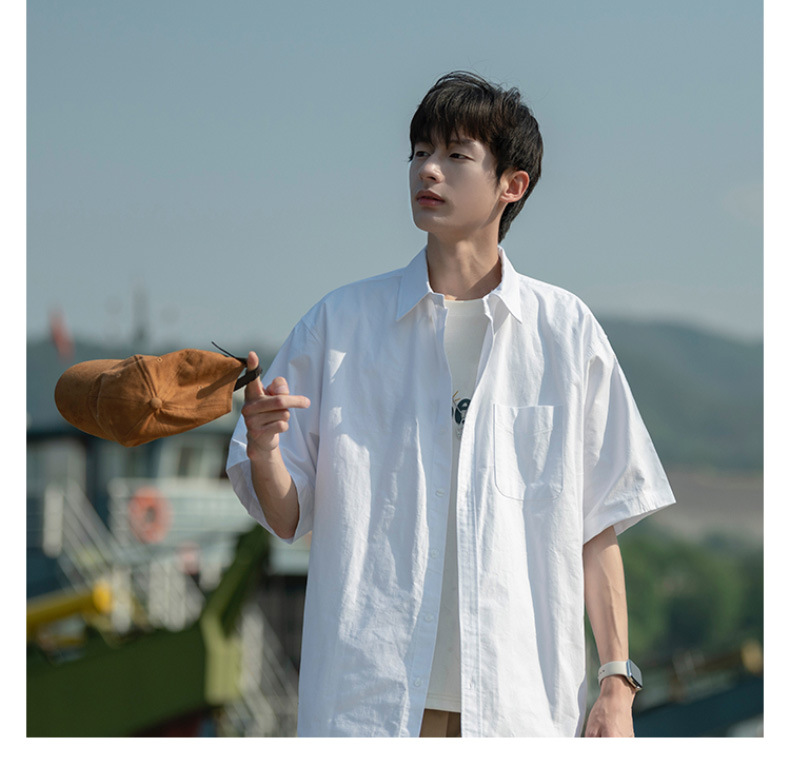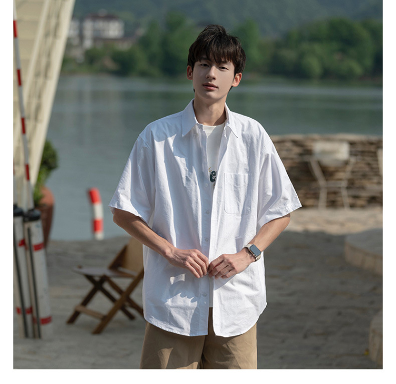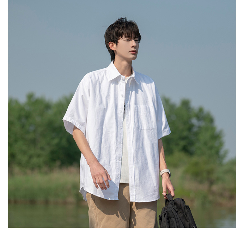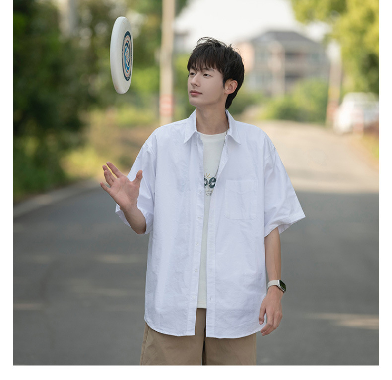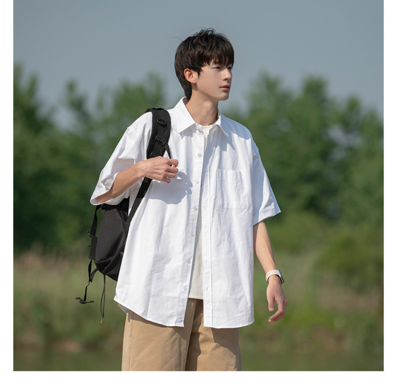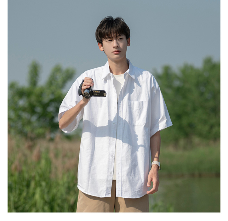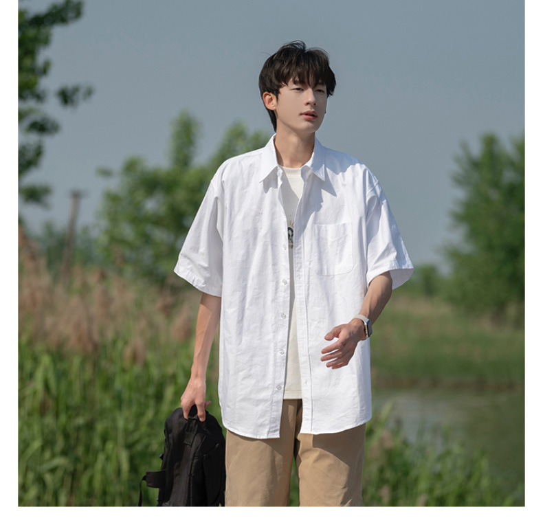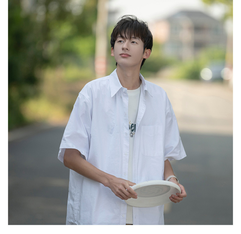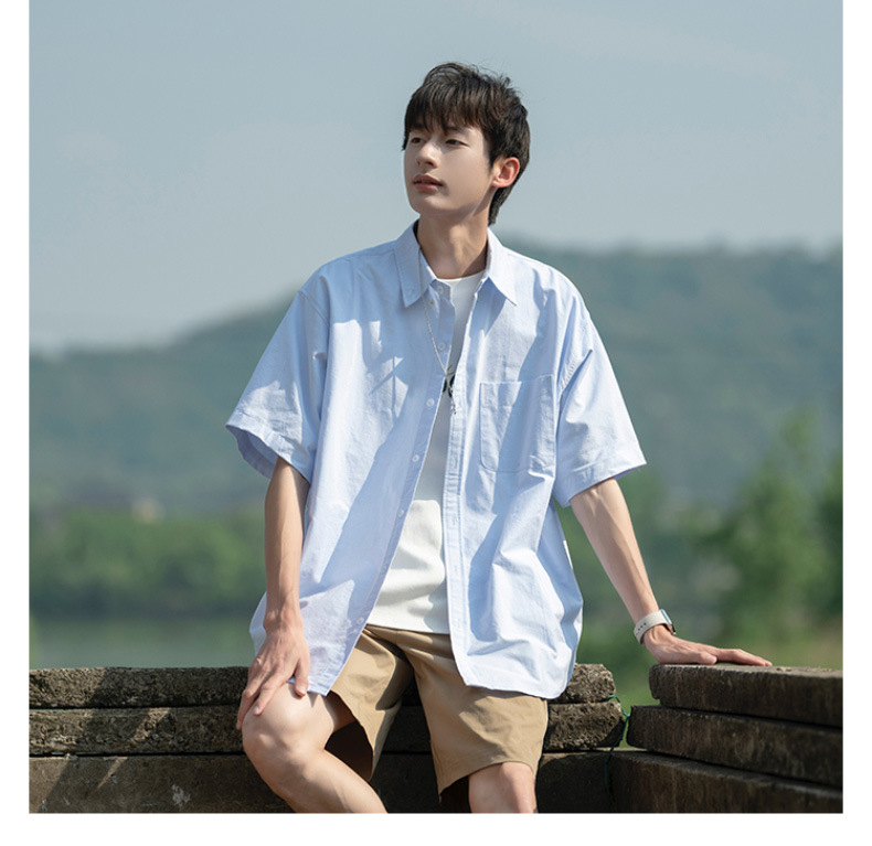 NICEVOW浅蓝色休闲短袖衬衫男夏季宽松日系上衣青少年衬衣外套