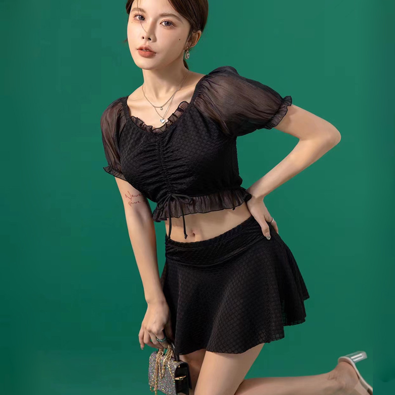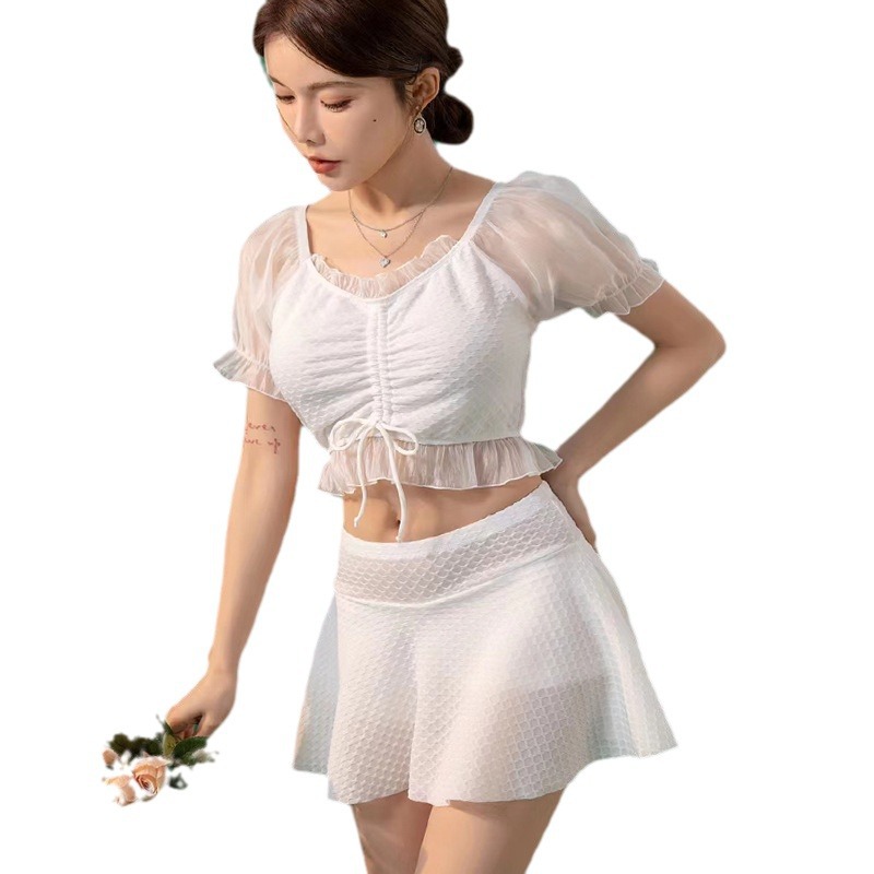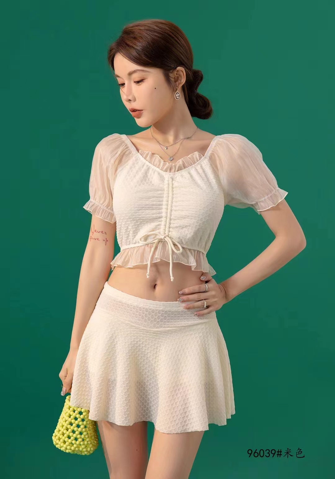 泳衣女2023夏季保守显瘦甜美纯色裙式分体泳衣温泉平角裤泳衣批发
