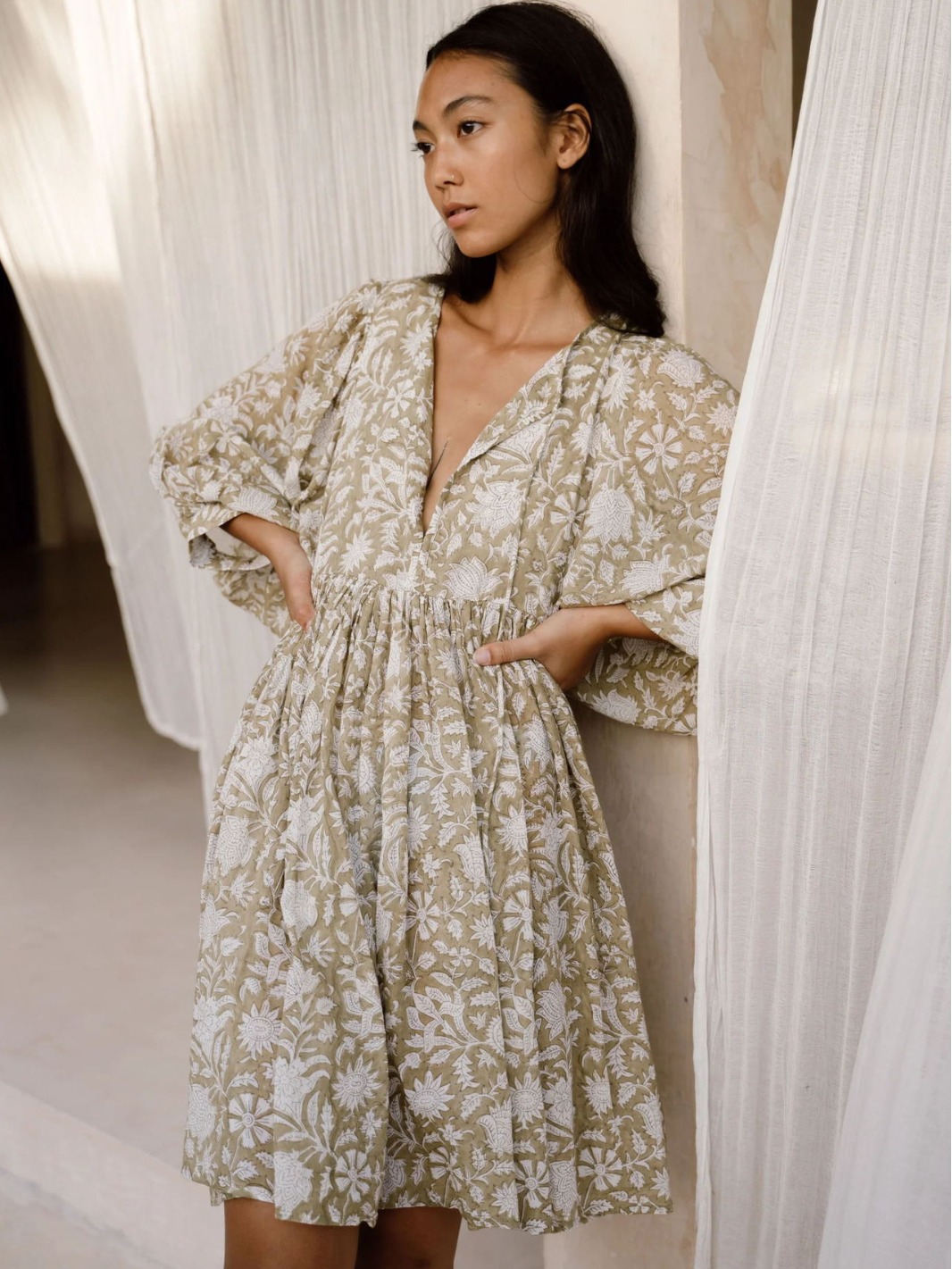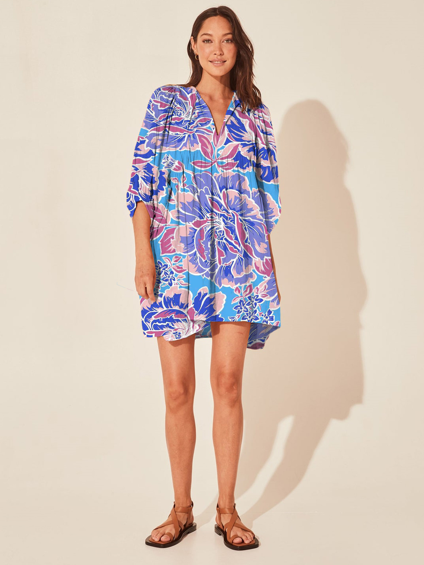 2023夏欧美时尚女装碎花绑绳宽松休闲人棉连衣裙海边度假短裙代发