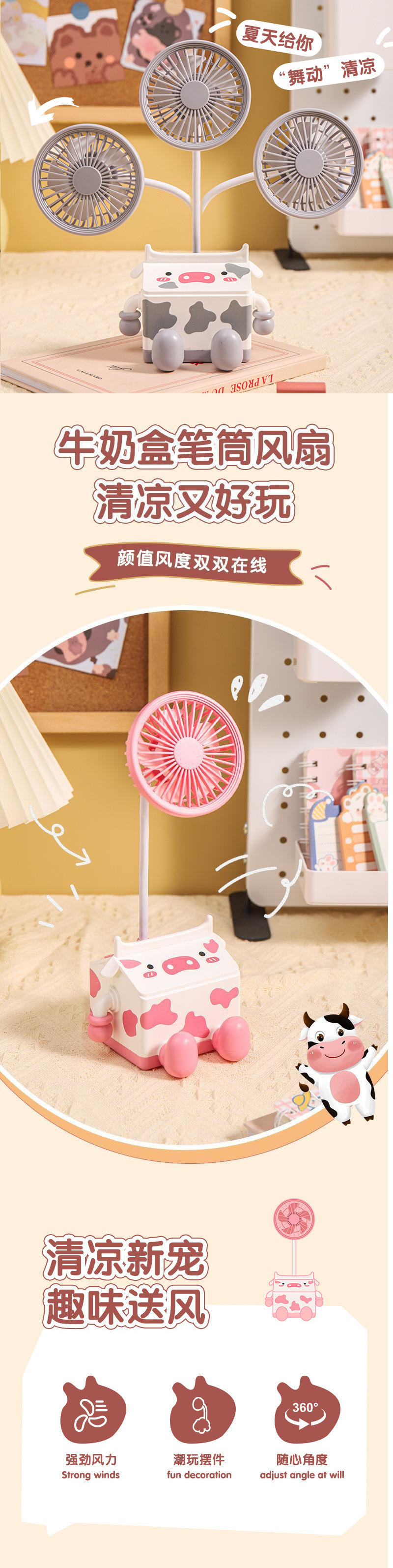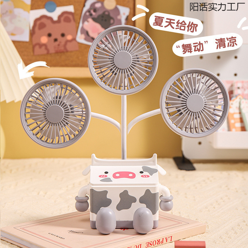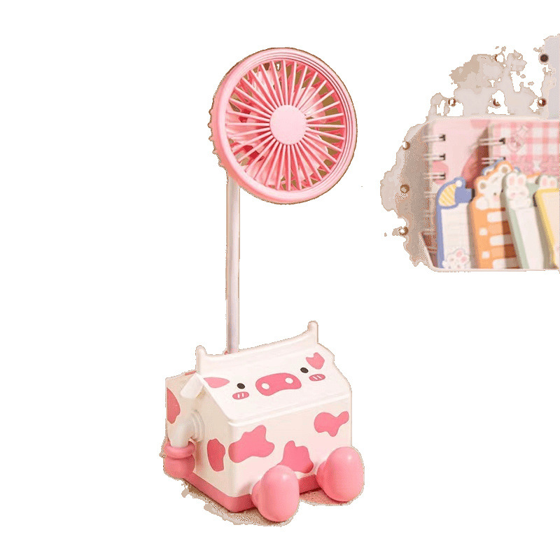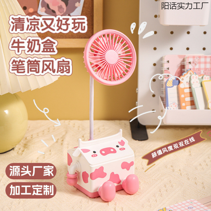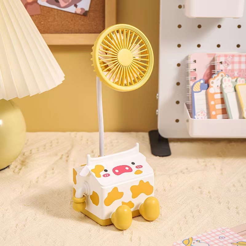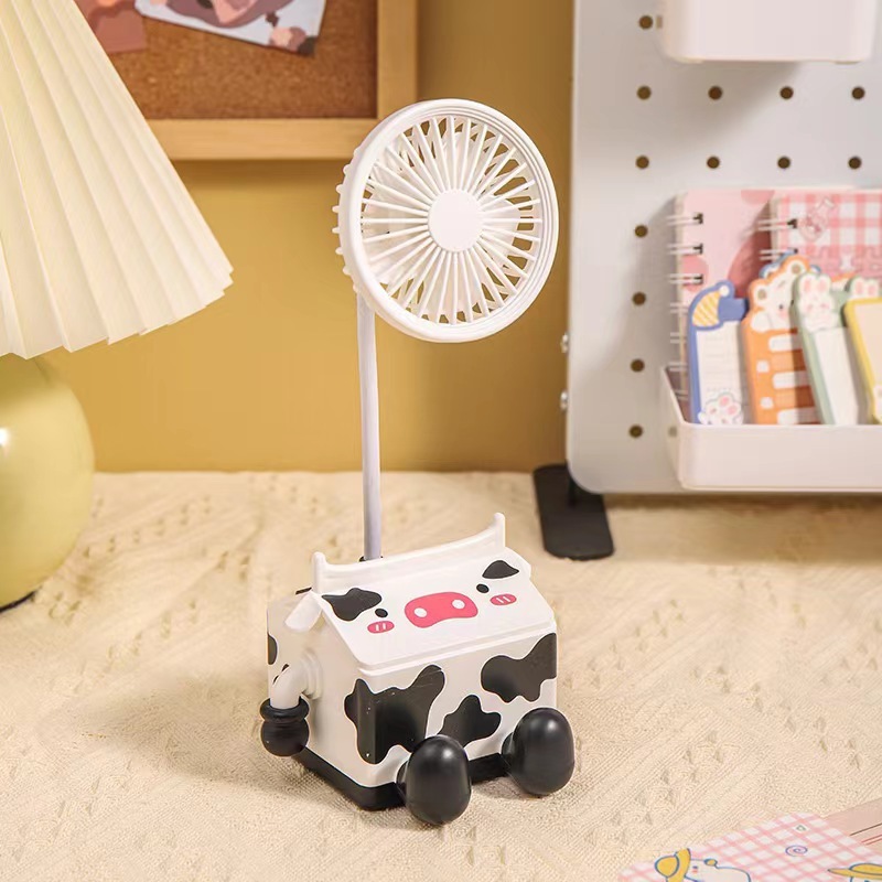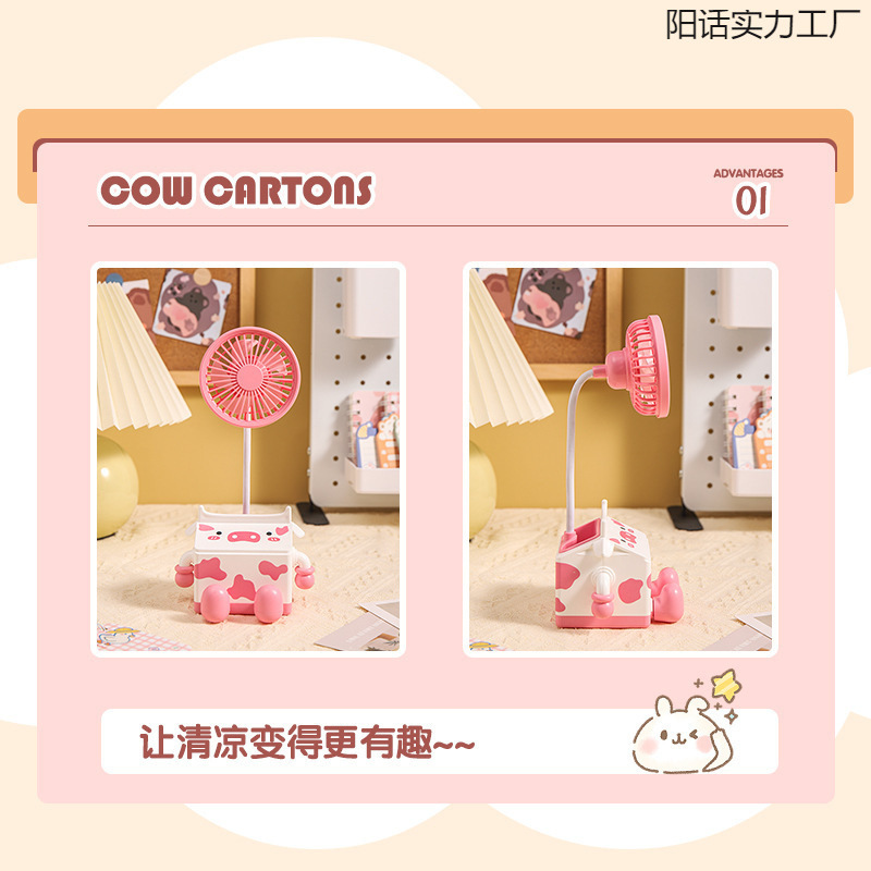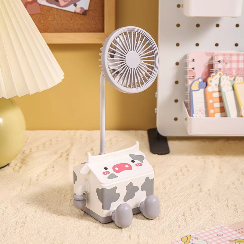 新款萌趣奶牛风扇USB充电学生上课桌面静音带笔筒