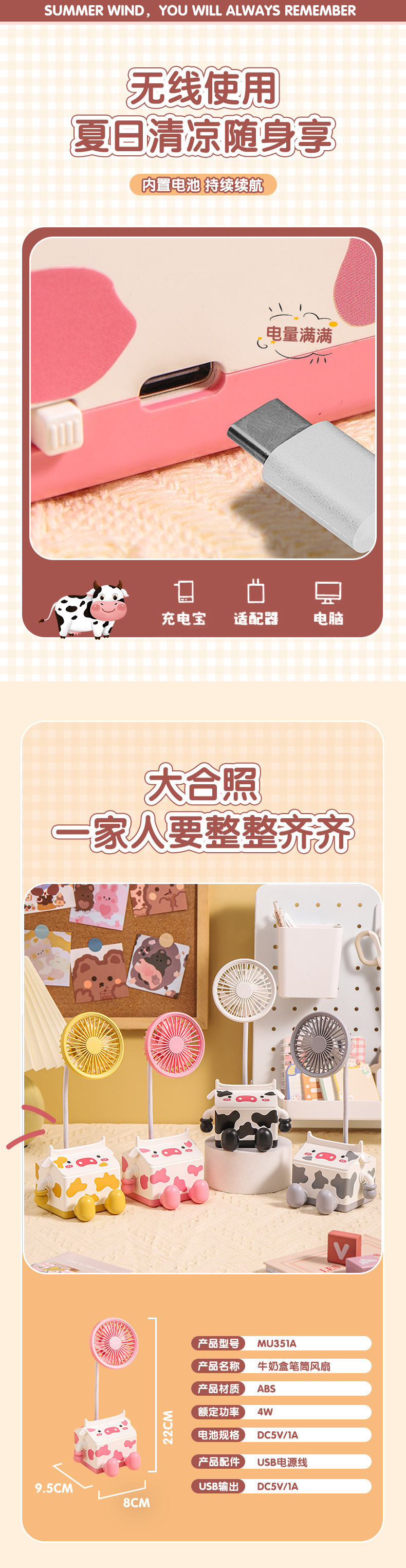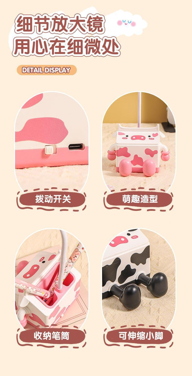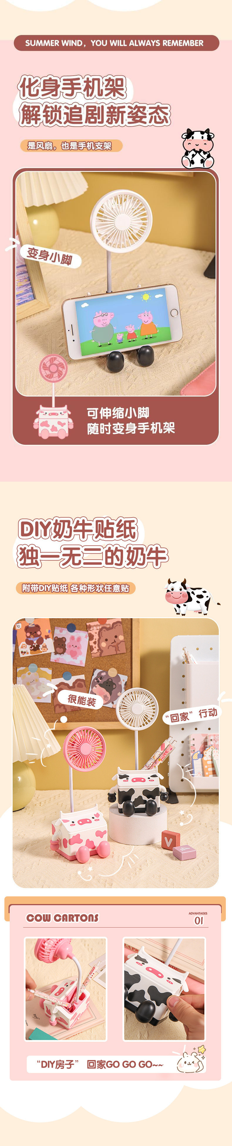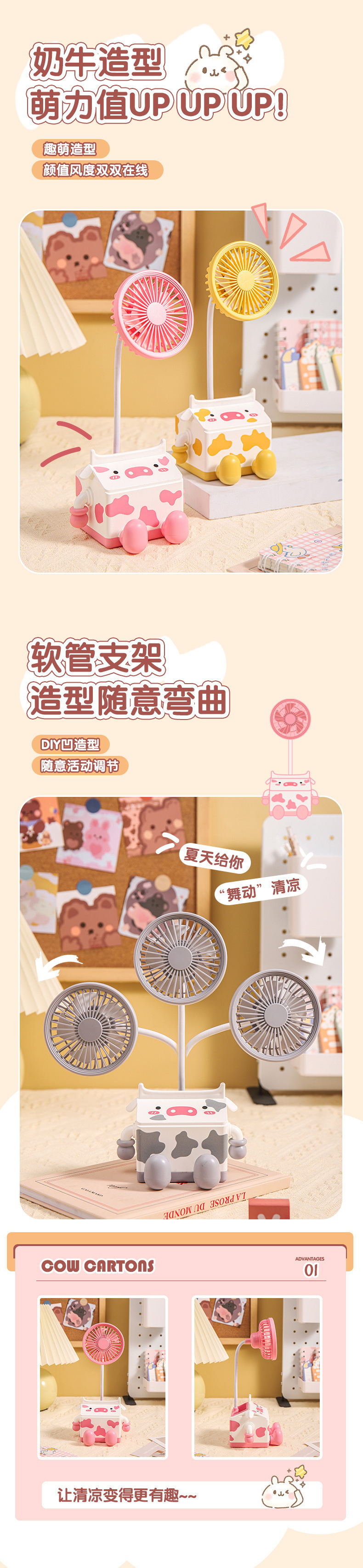 新款萌趣奶牛风扇USB充电学生上课桌面静音带笔筒