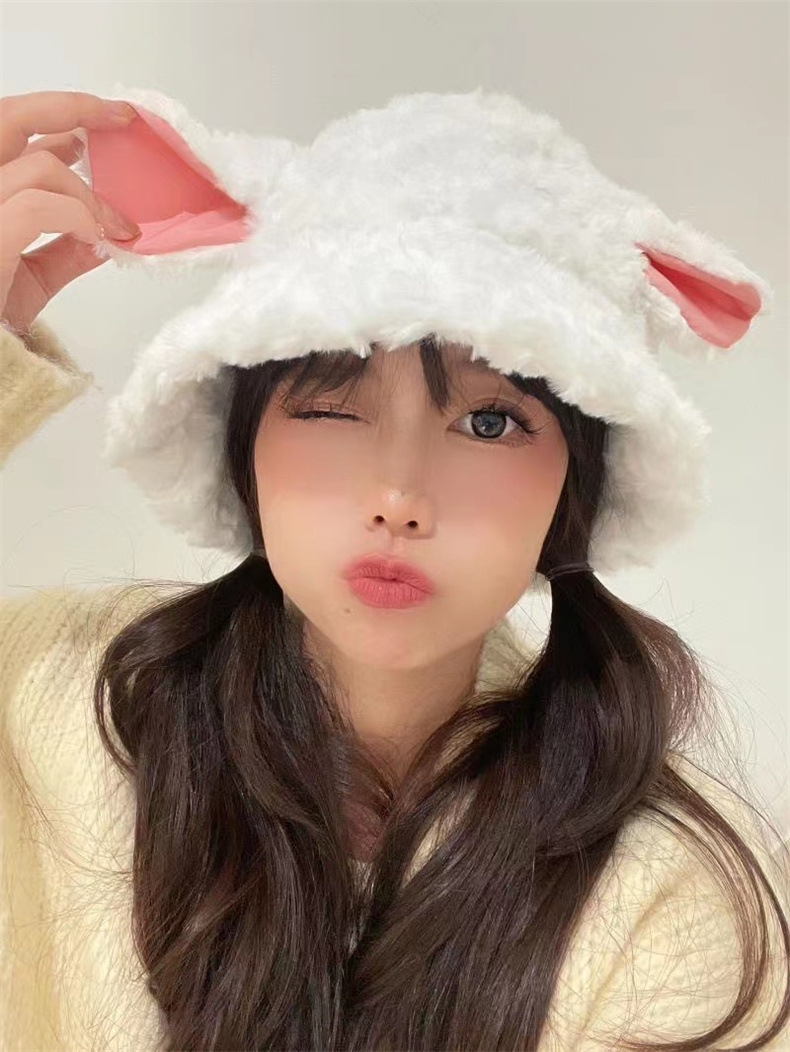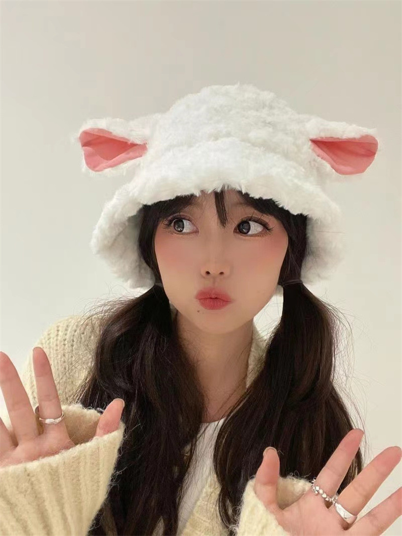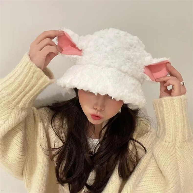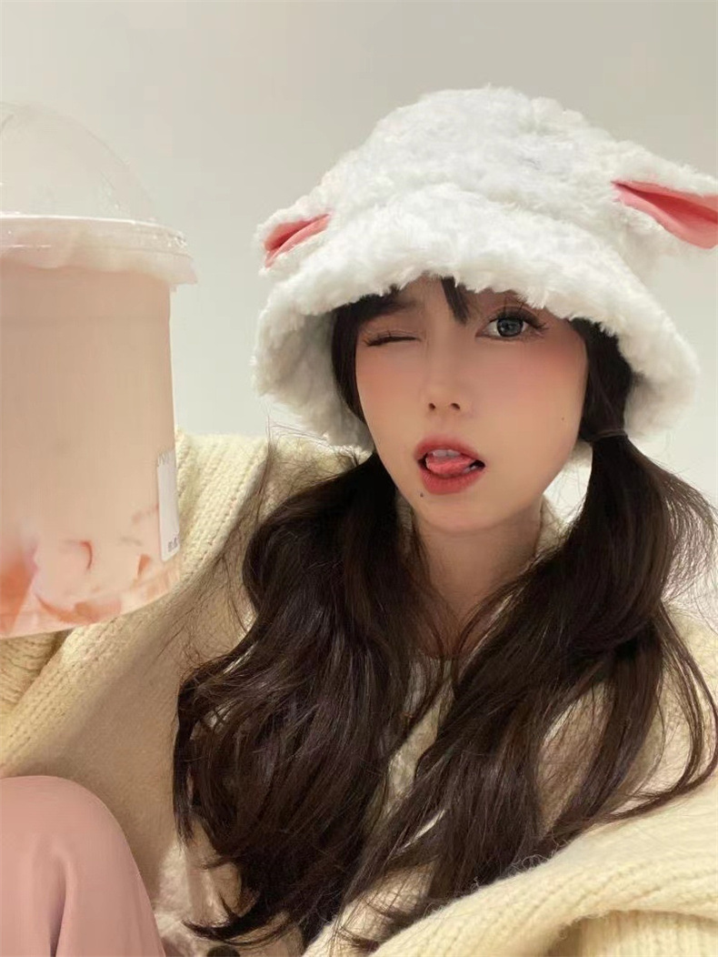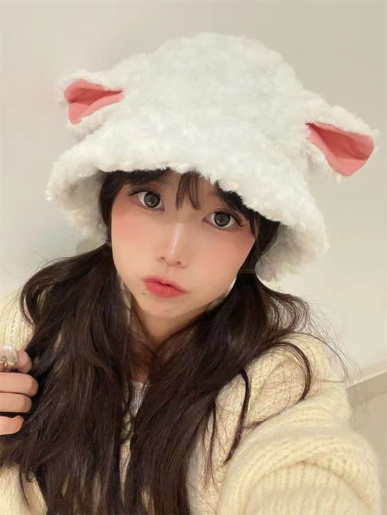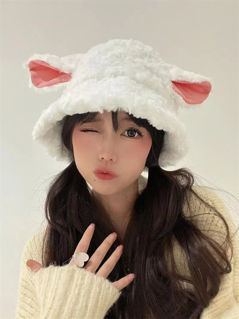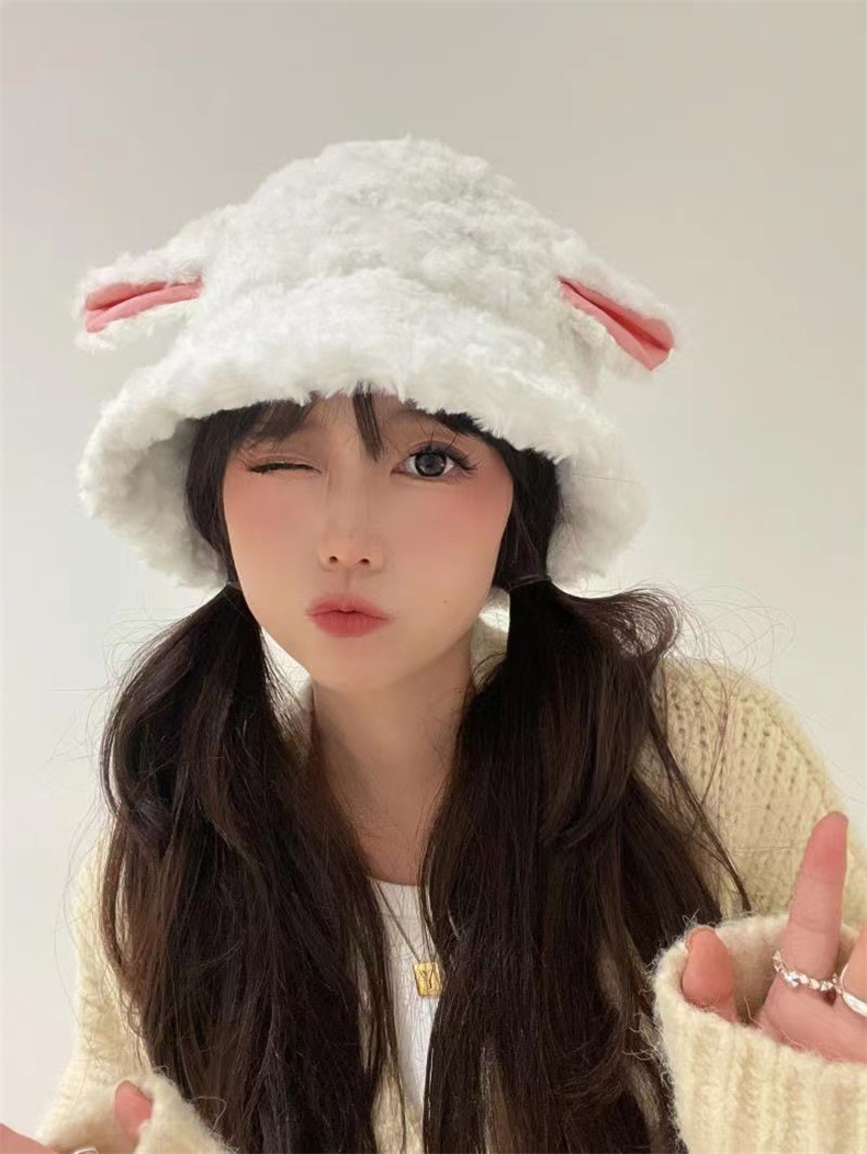 粉色小羊帽秋冬毛绒可爱渔夫帽保暖盆帽咩咩水桶帽子百搭素颜帽女