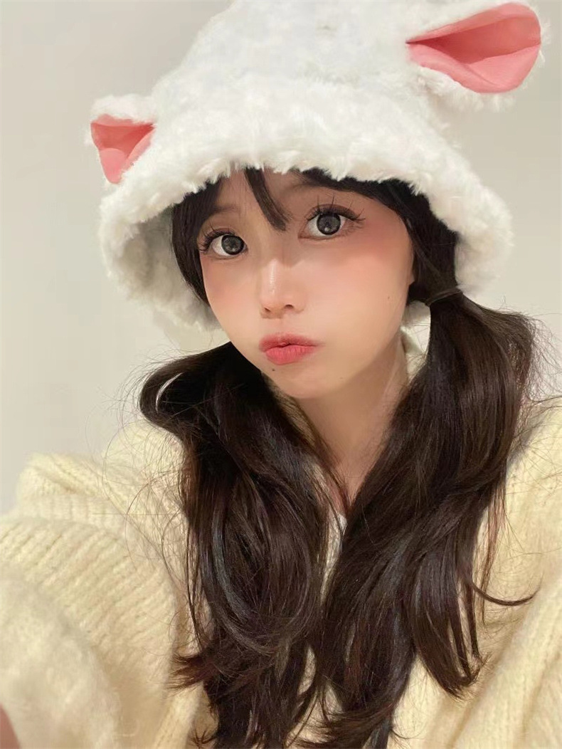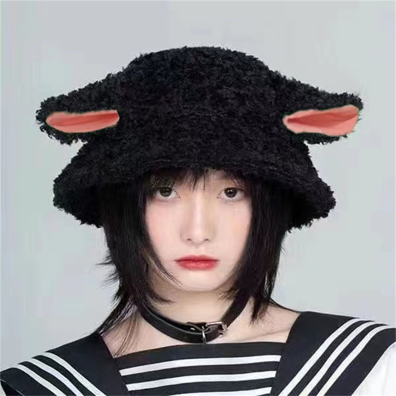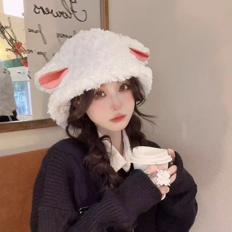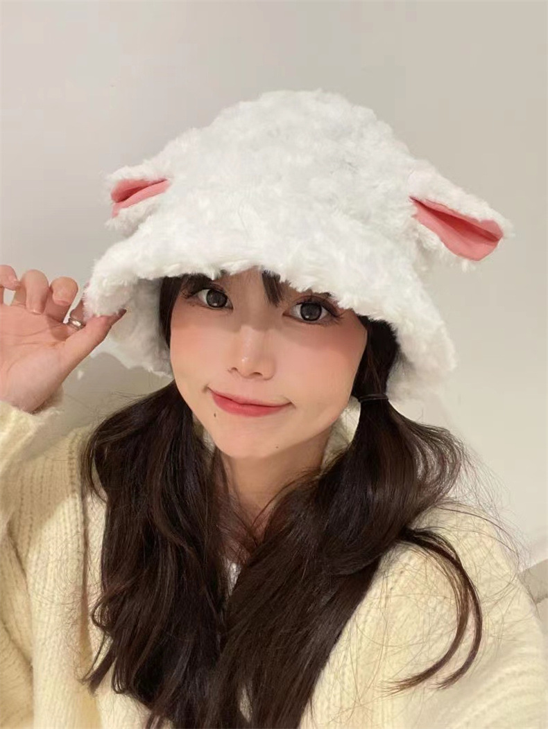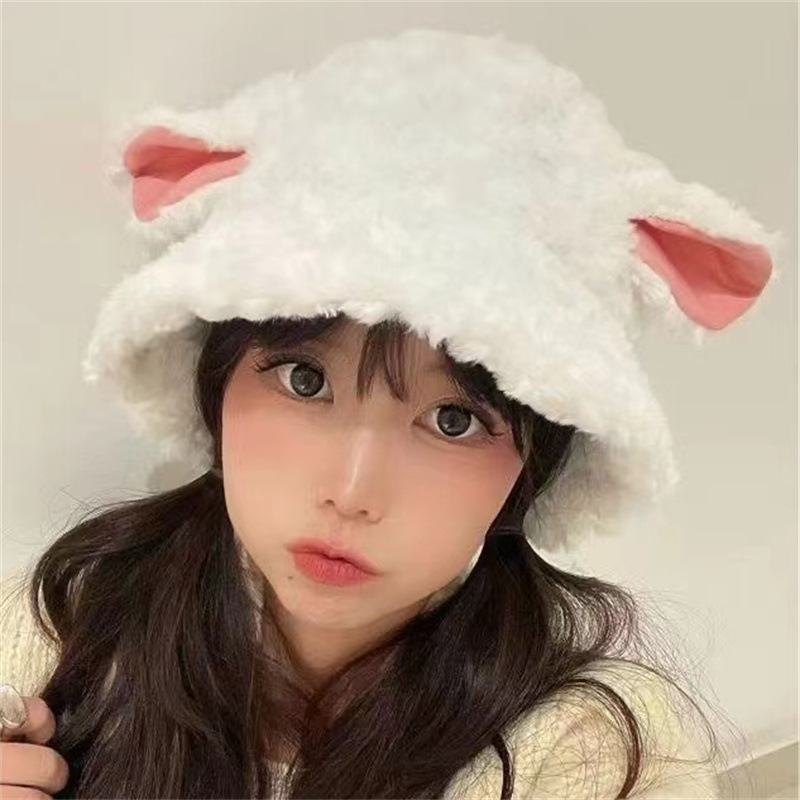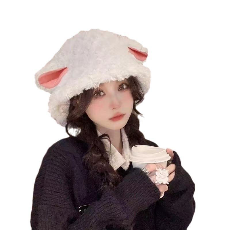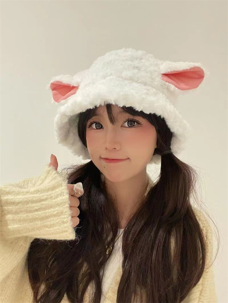 粉色小羊帽秋冬毛绒可爱渔夫帽保暖盆帽咩咩水桶帽子百搭素颜帽女