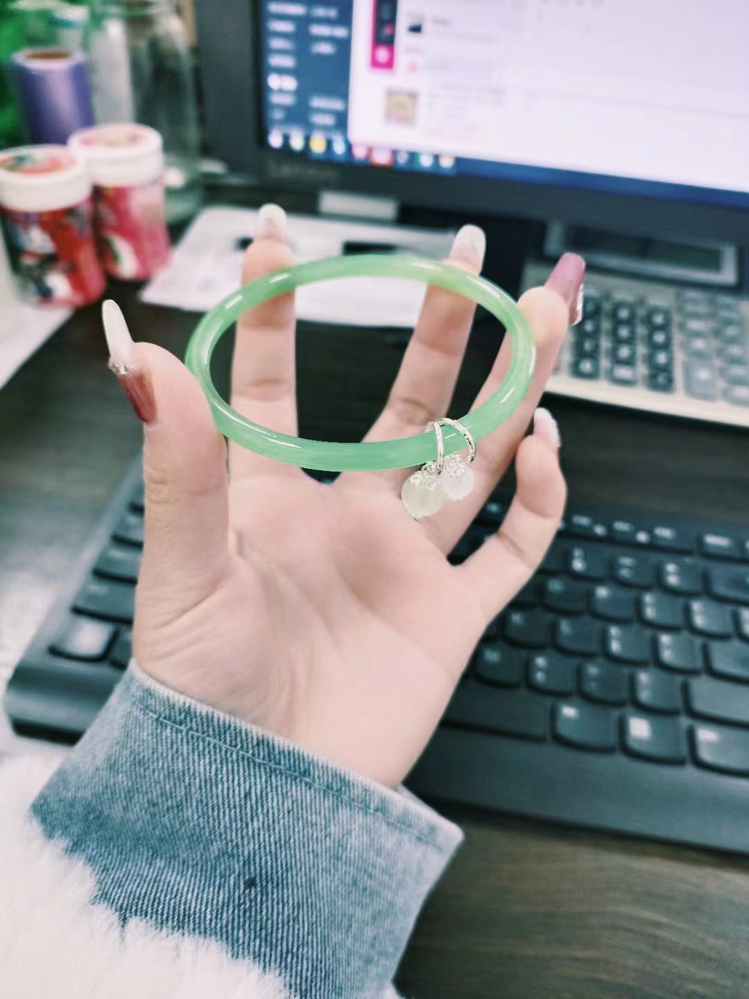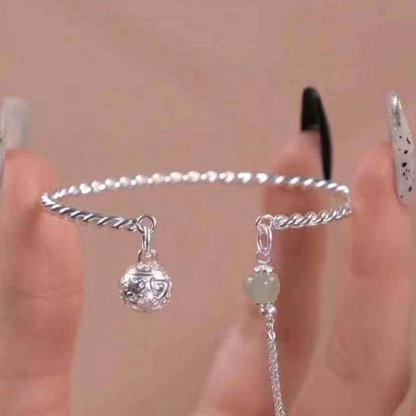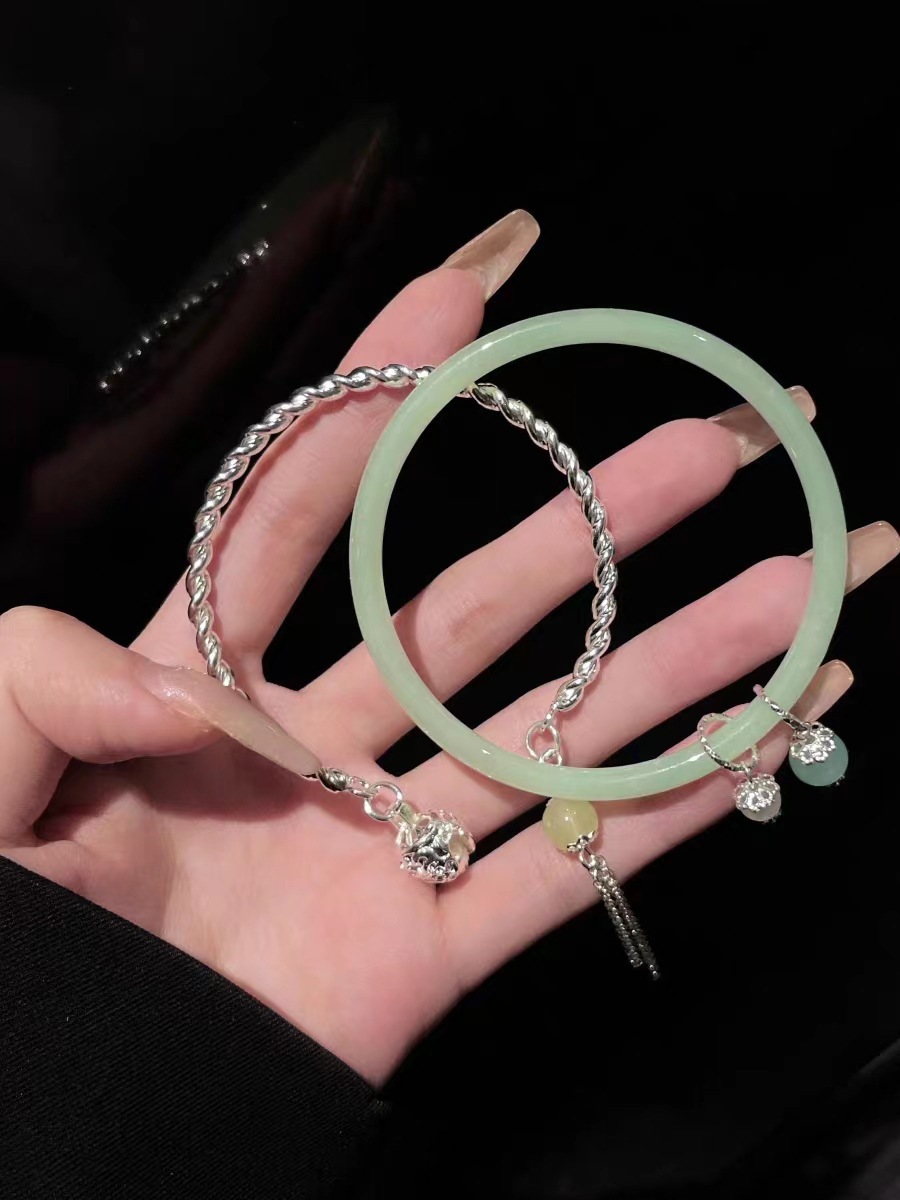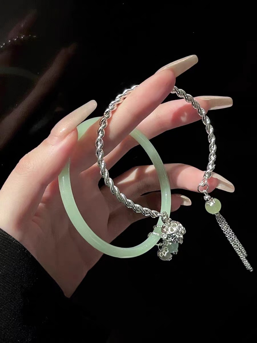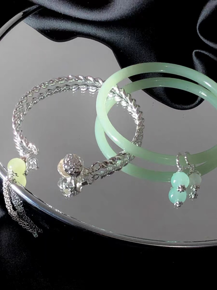 复古风晴水绿仿玉髓开口手镯叮当镯女铃铛甜美ins高级感流苏手链.