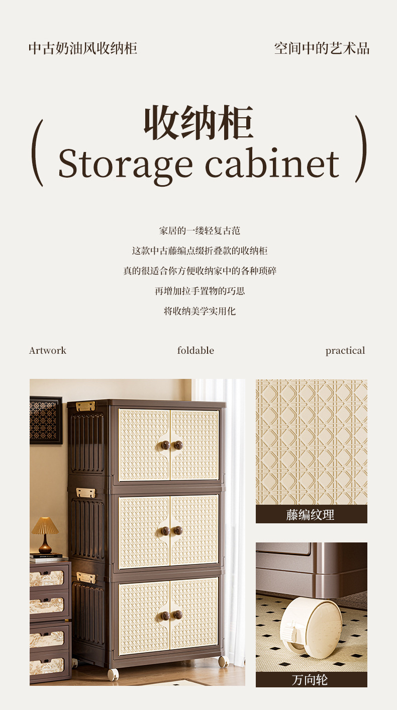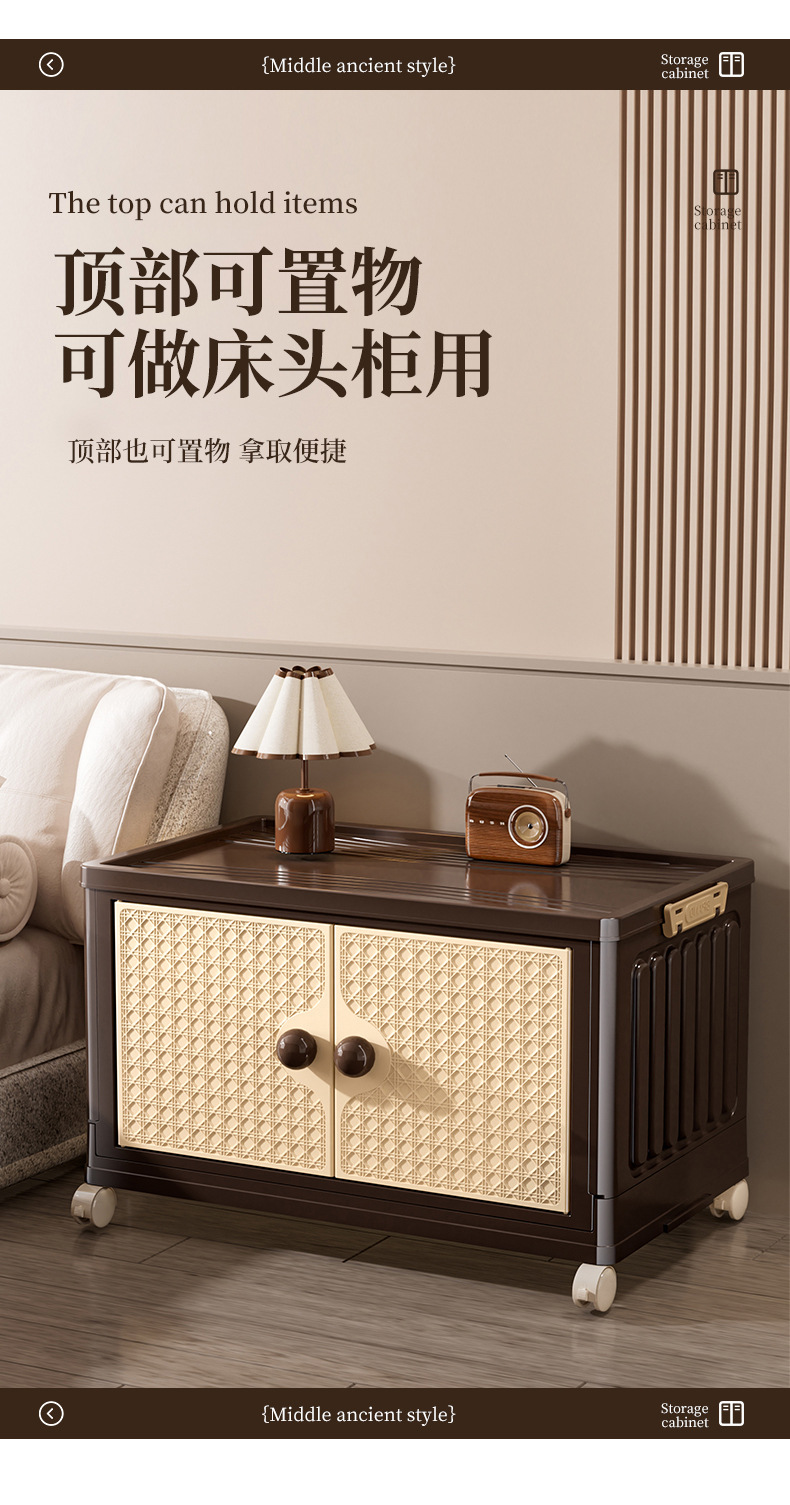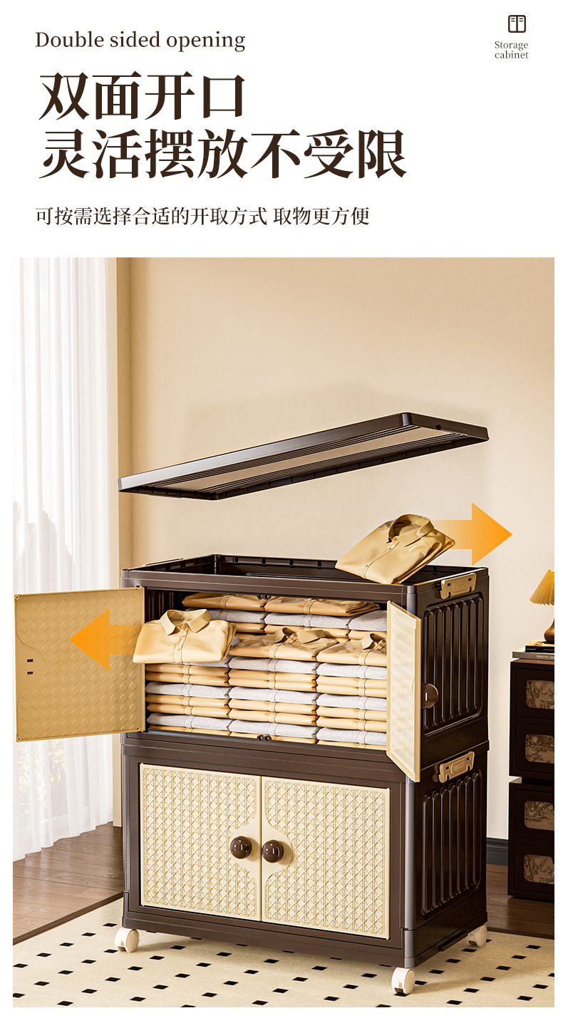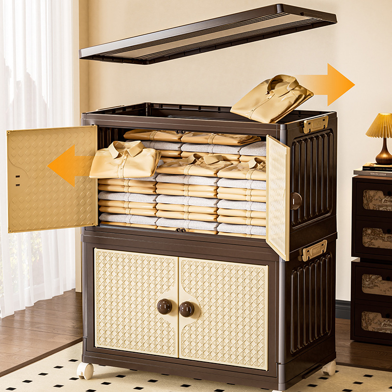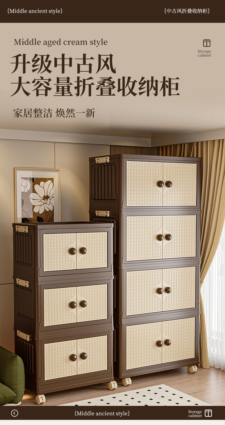 家用收纳柜可折叠带滑轮中古风置物柜大容量卧室多层可叠加储物柜