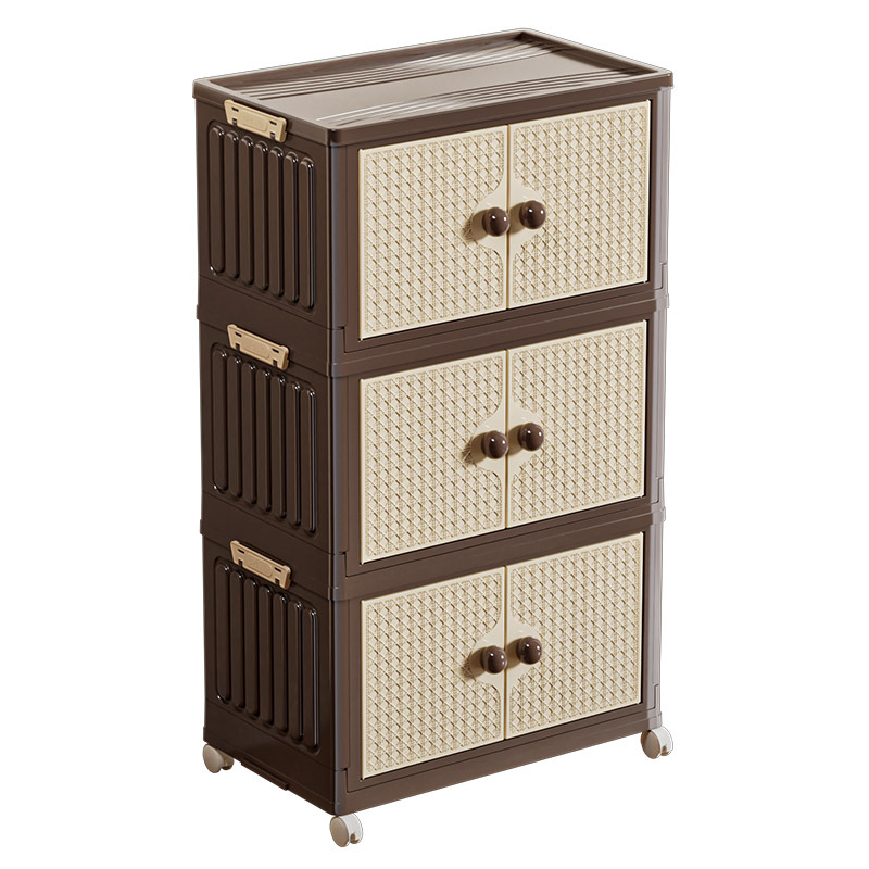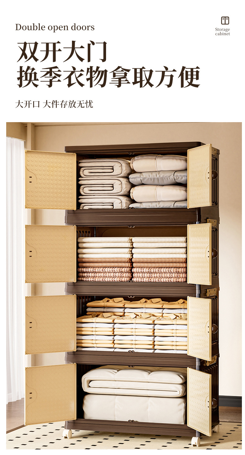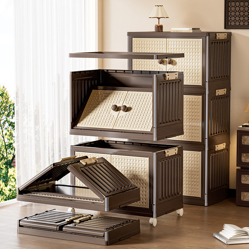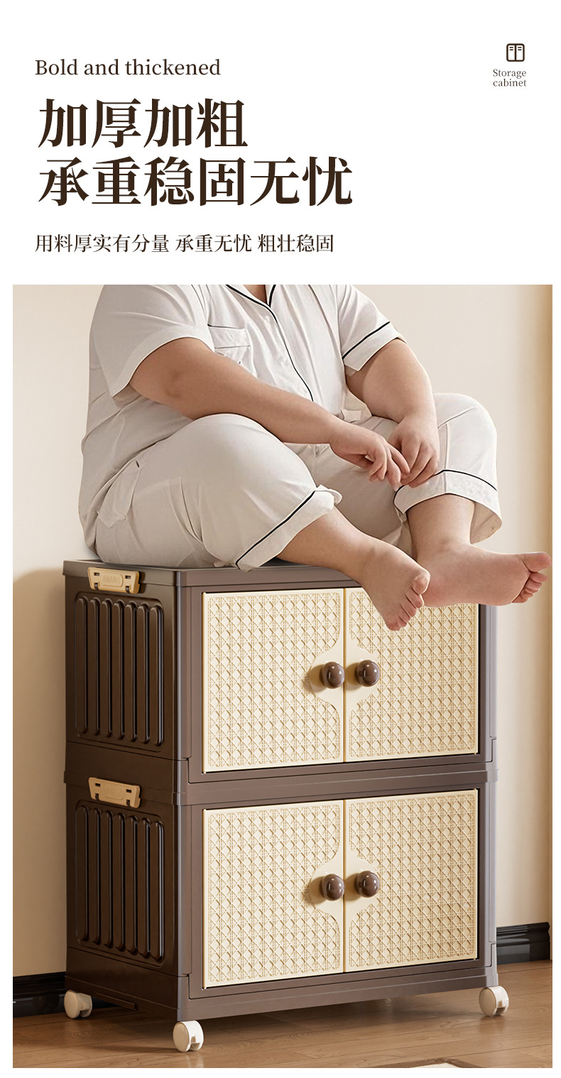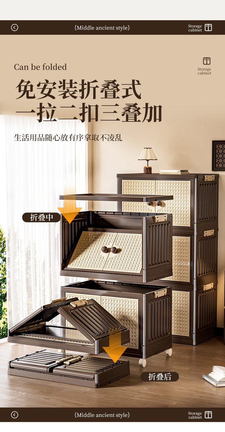 家用收纳柜可折叠带滑轮中古风置物柜大容量卧室多层可叠加储物柜