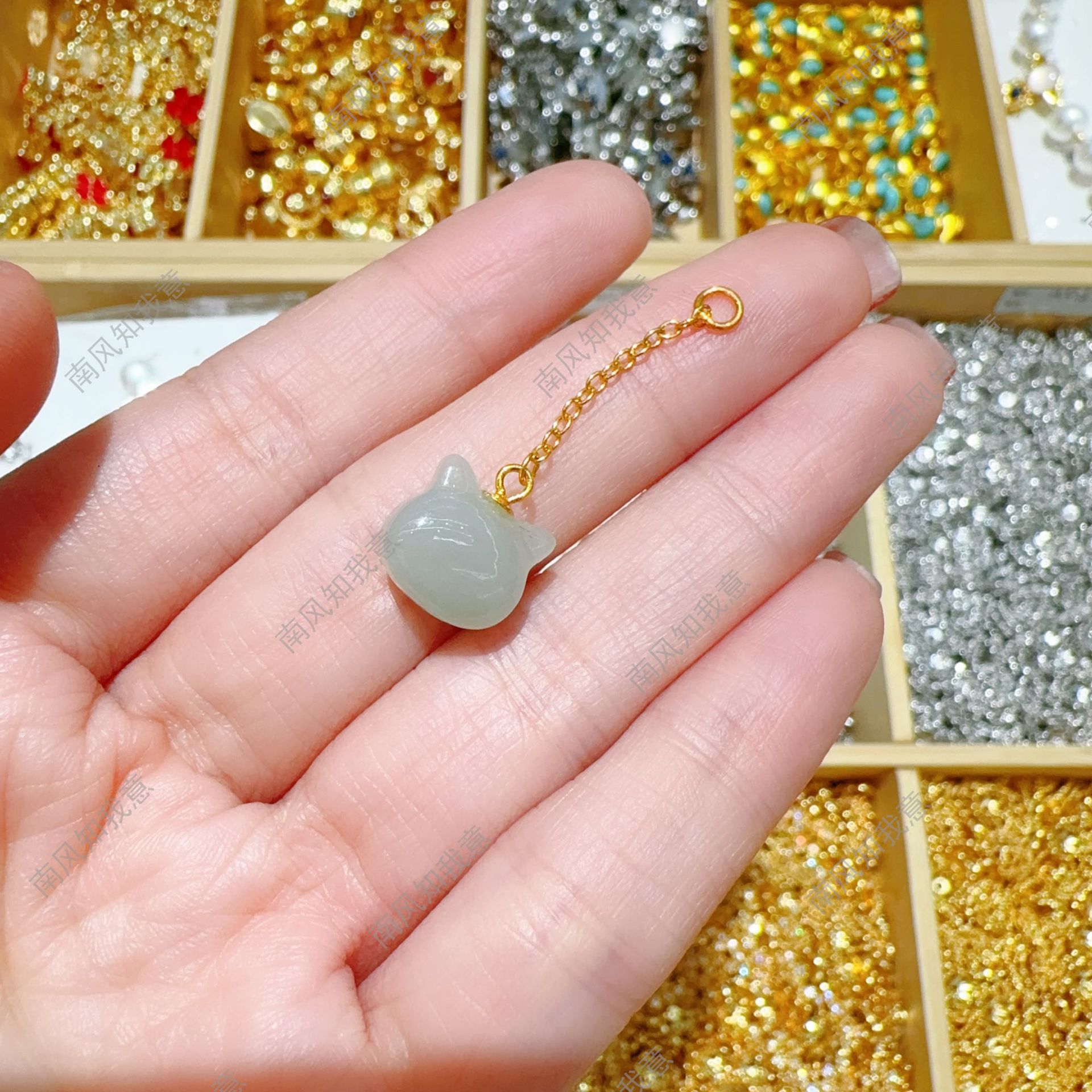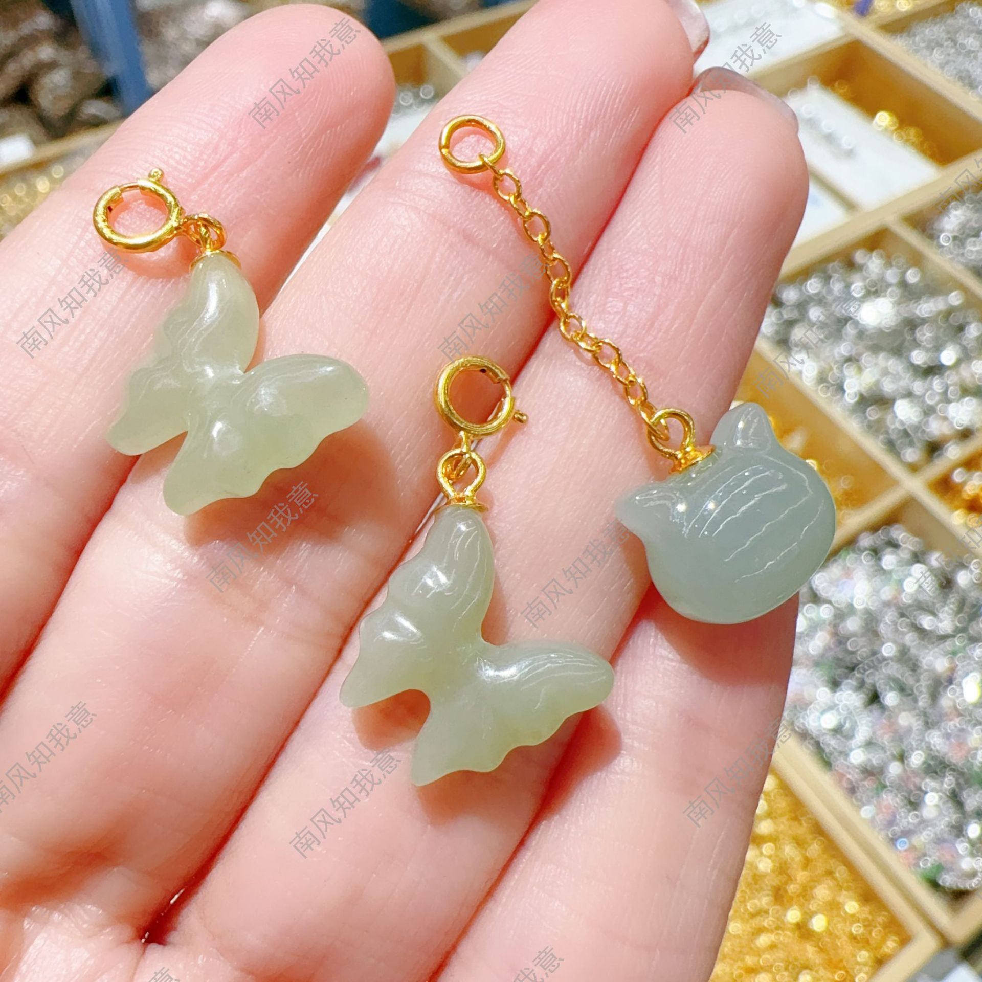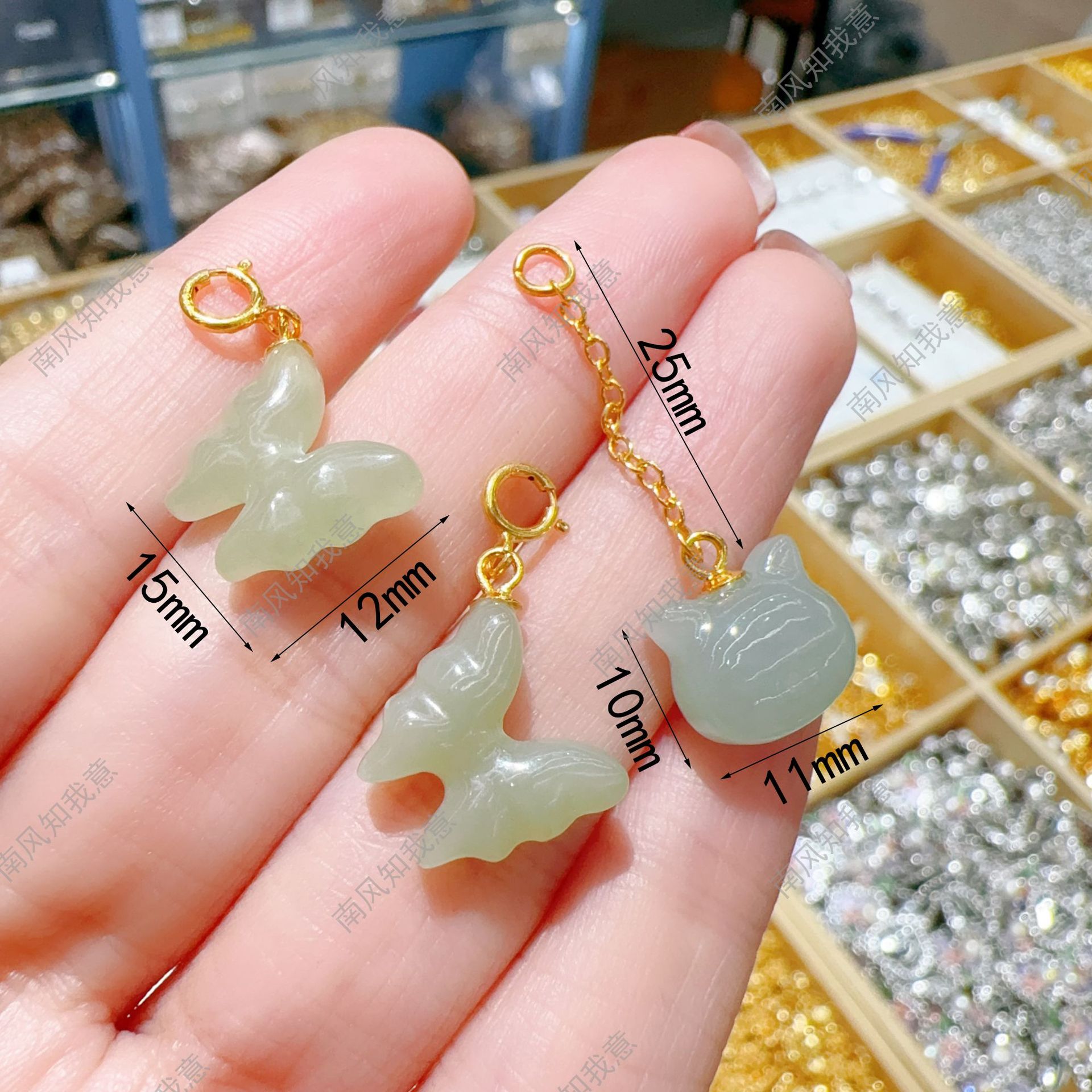S925银天然和田玉吊坠蝴蝶弹簧扣猫猫头链条吊坠古法沙金小众配件