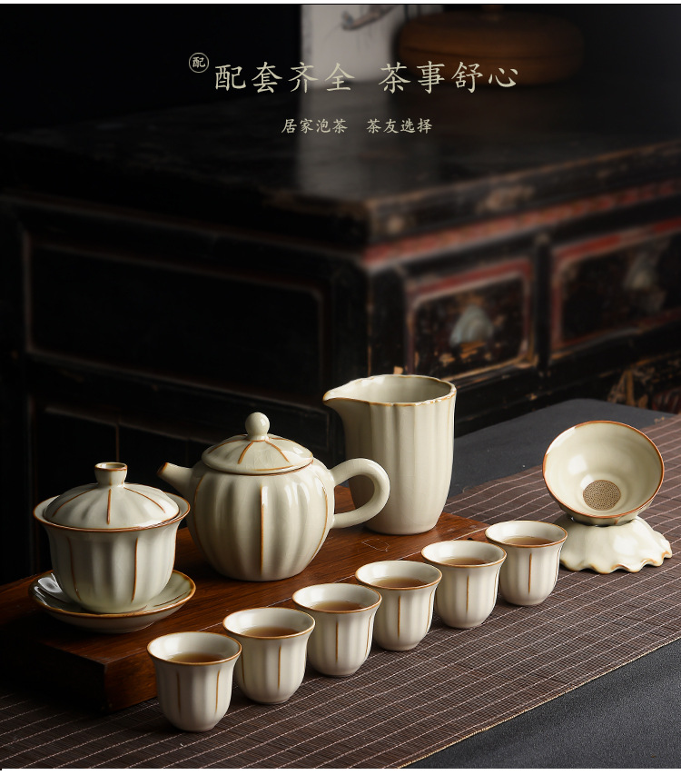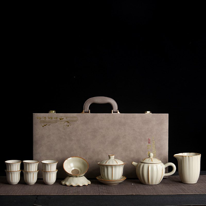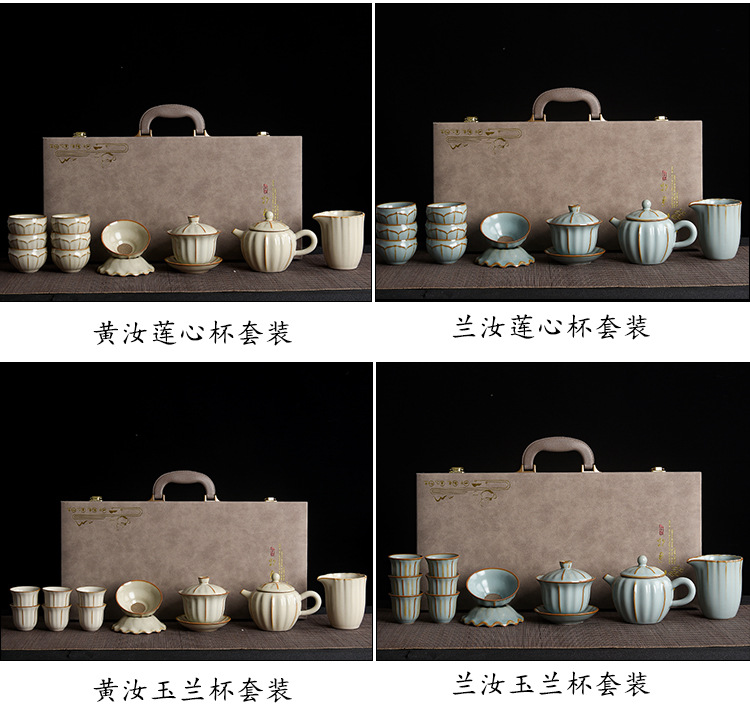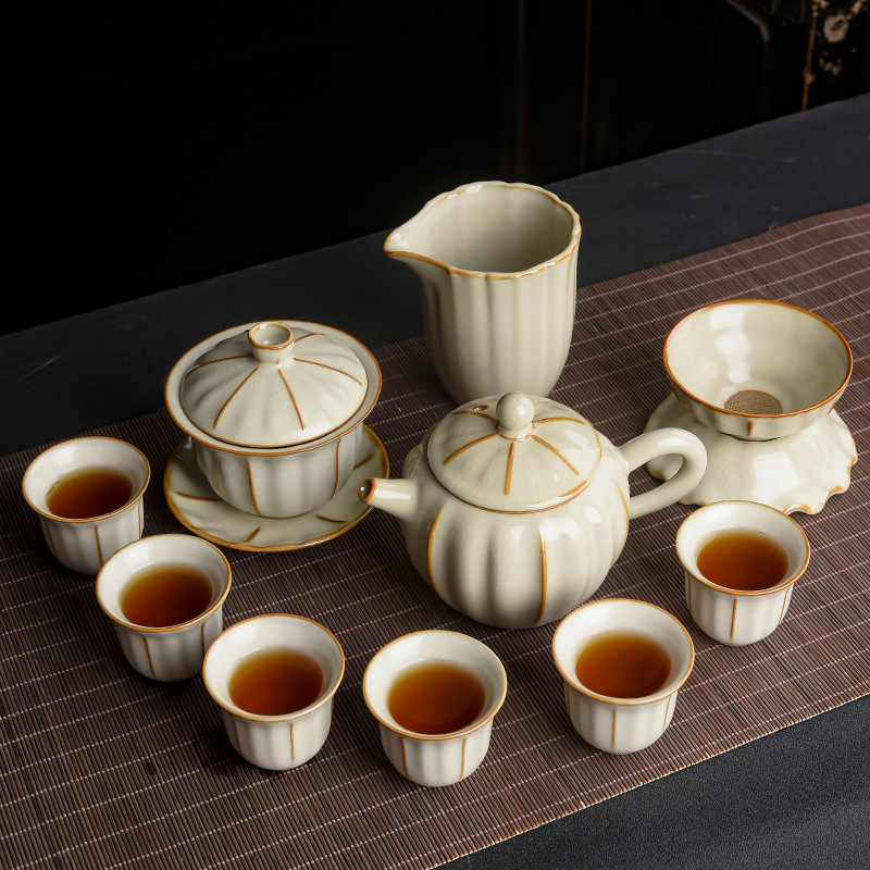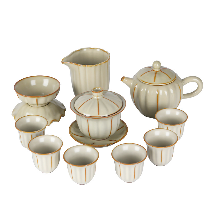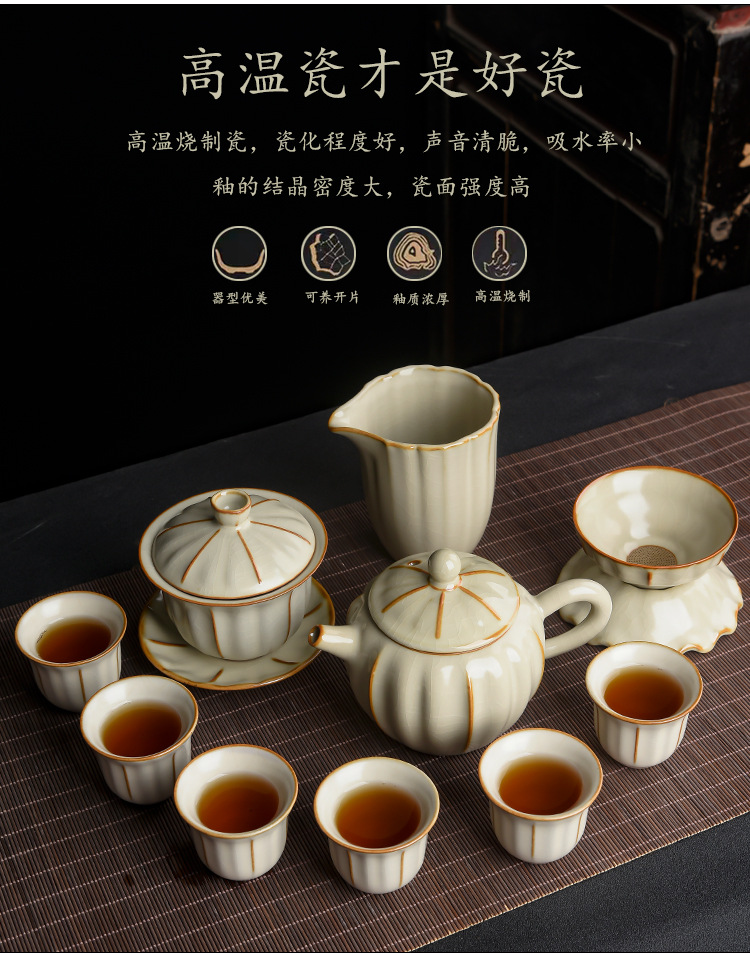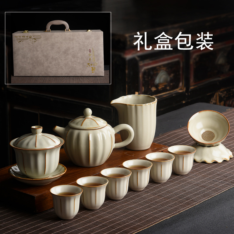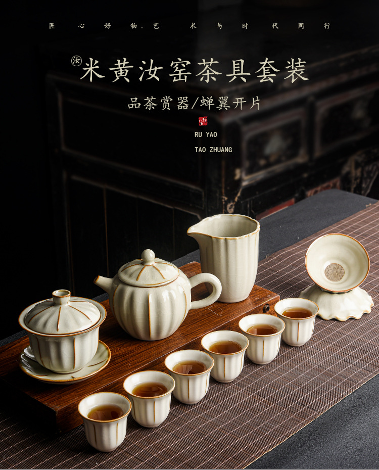 米黄汝窑功夫茶具套装整套批发商务办公室客厅泡茶壶盖碗可印LOGO
