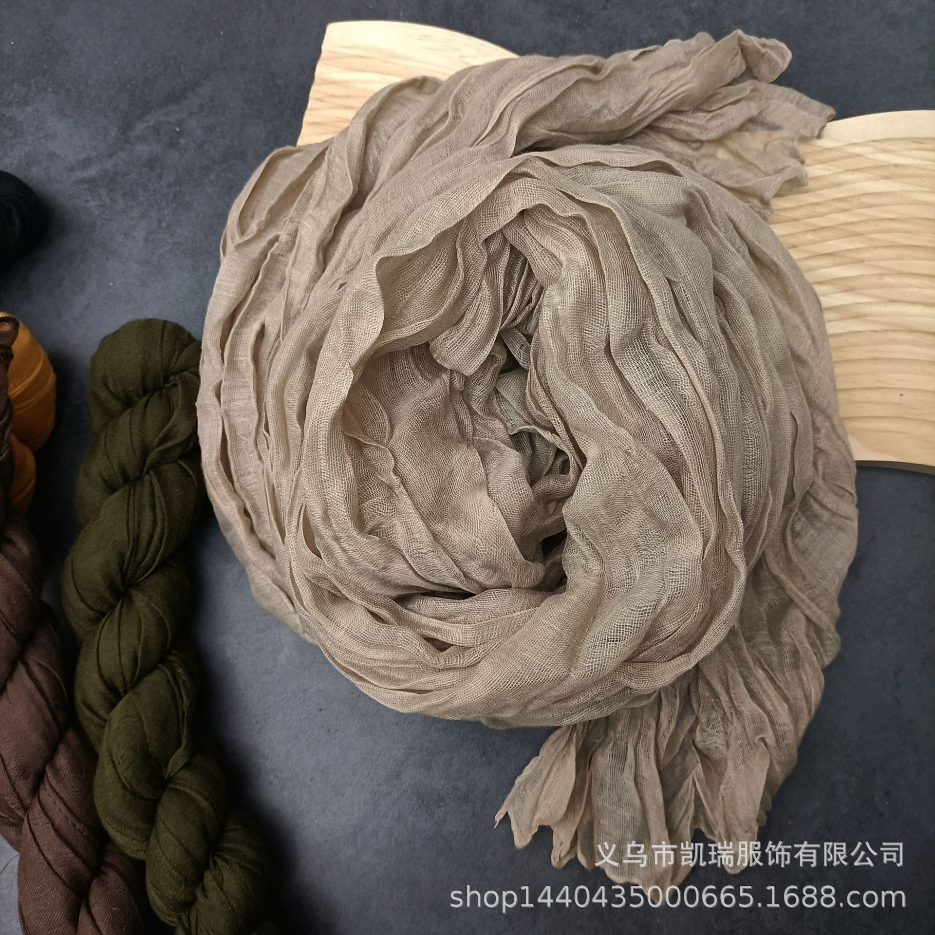 纯色棉麻围巾复古秋冬新款褶皱绿色复古薄长条披肩男女士保暖丝巾