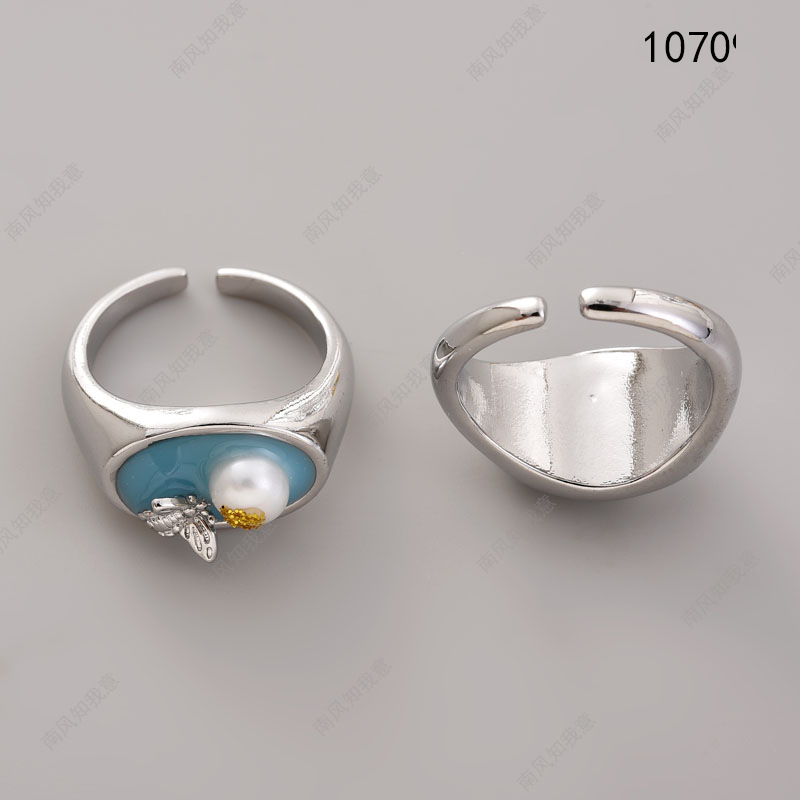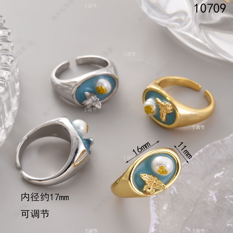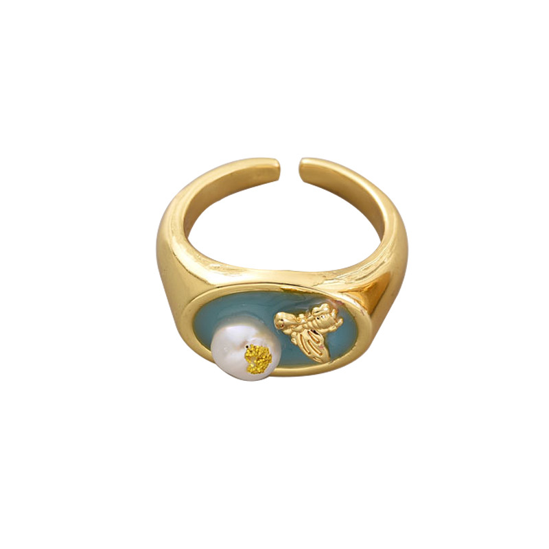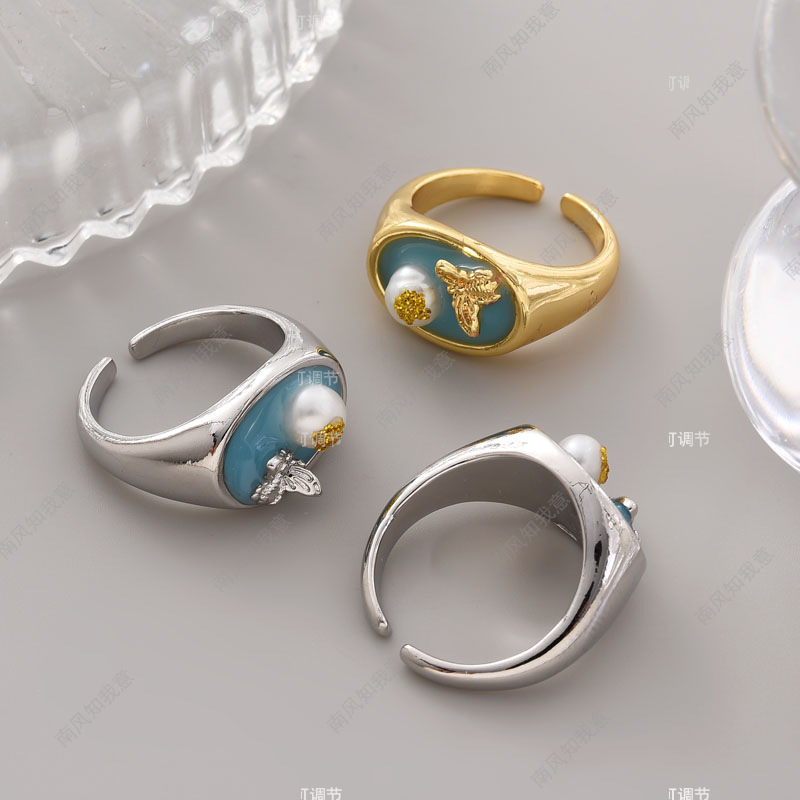 18K铜镀真金可调节开口戒指滴油油画风小蜜蜂珍珠戒指彩绘diy