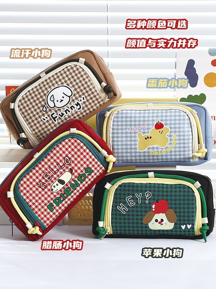 卡通小狗大容量复古格子开窗笔袋男女通用可爱高颜值耐脏文具袋