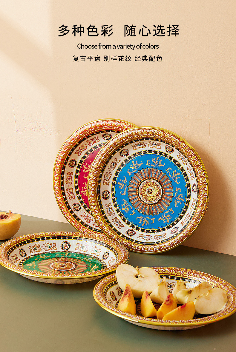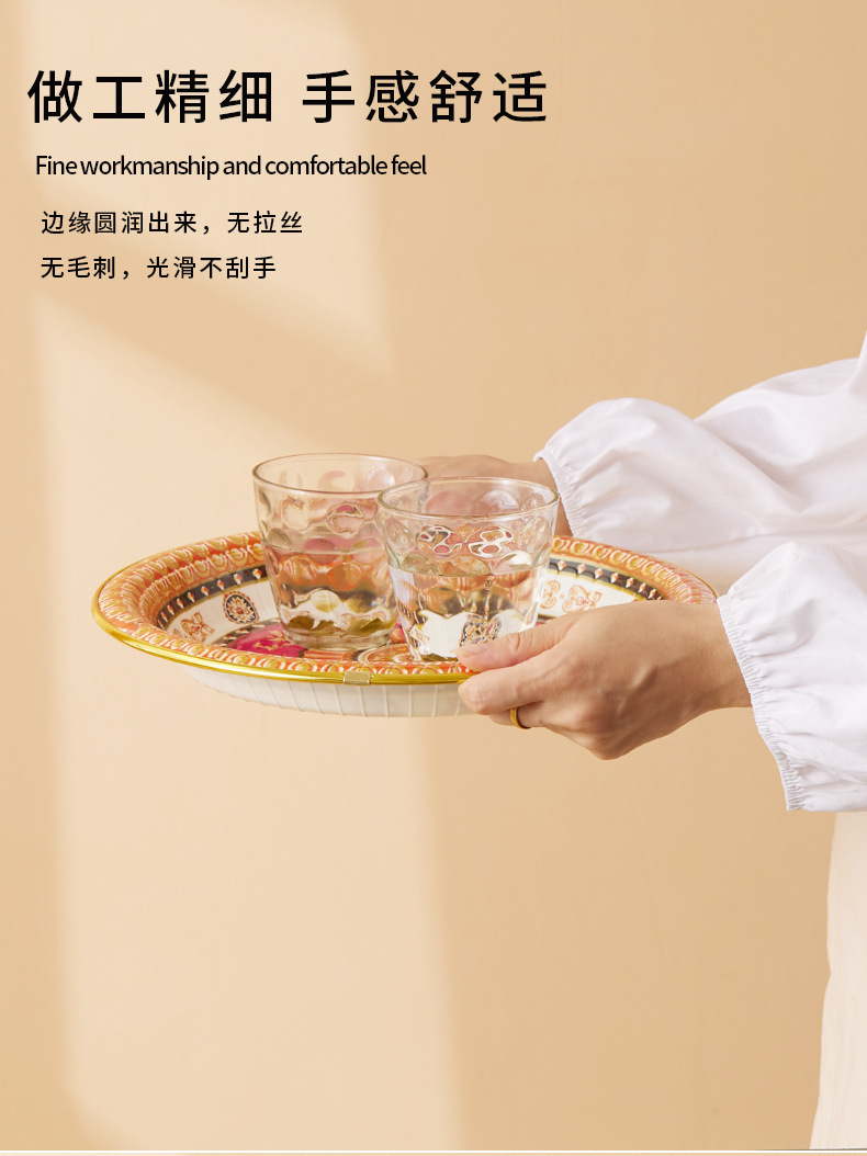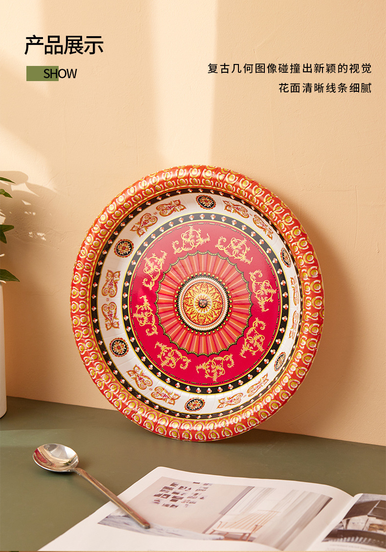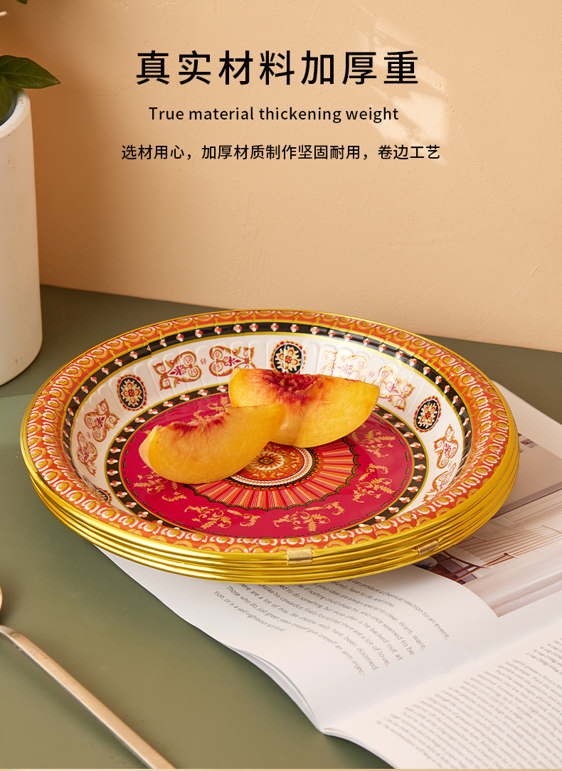 金边零食塑料托盘水果盆地毯花色彩家用点心盘轻奢复古圆形果盘包