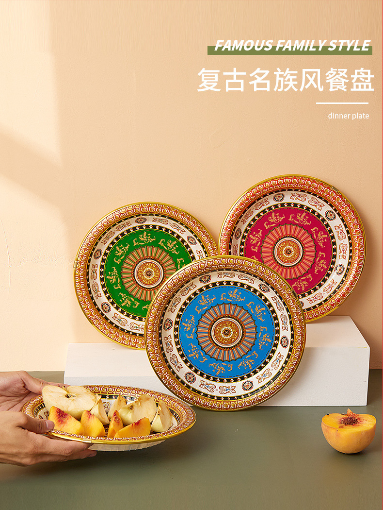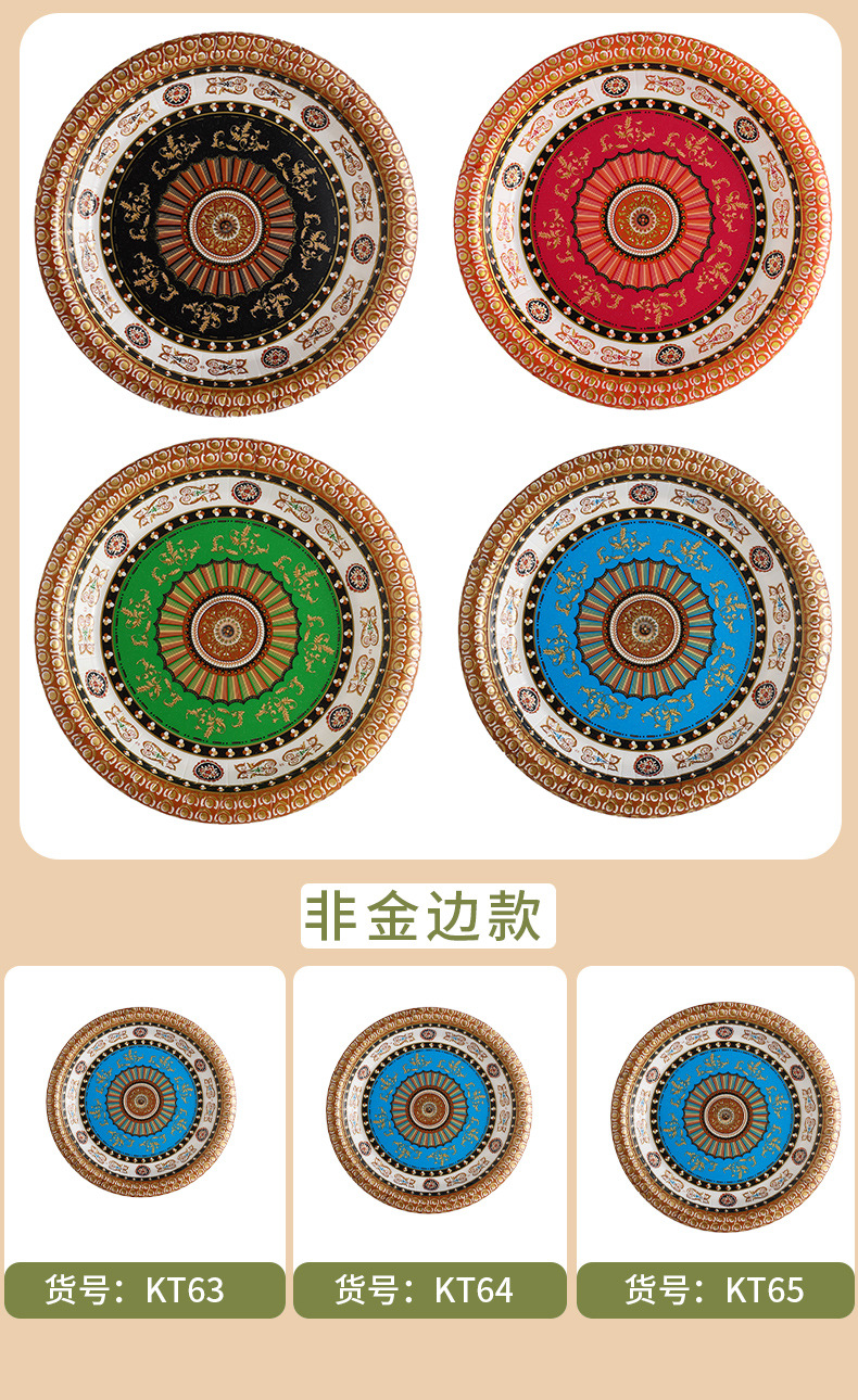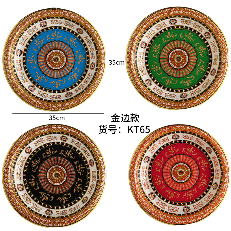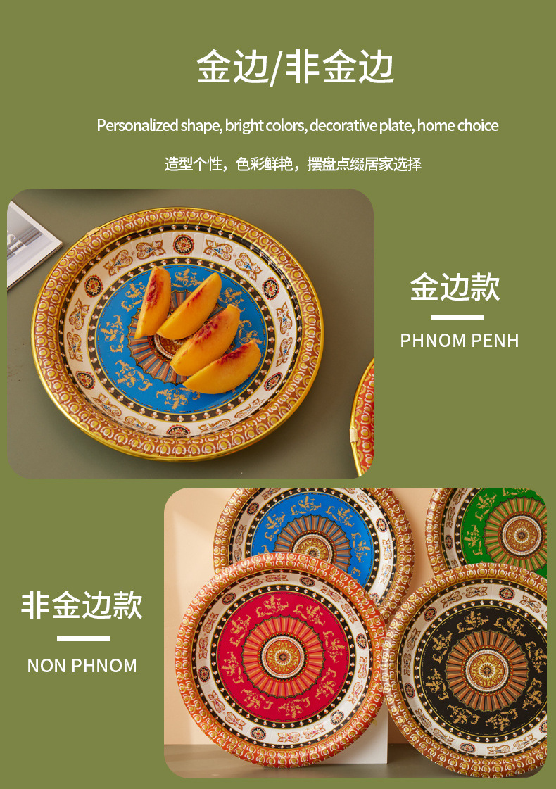 金边零食塑料托盘水果盆地毯花色彩家用点心盘轻奢复古圆形果盘包