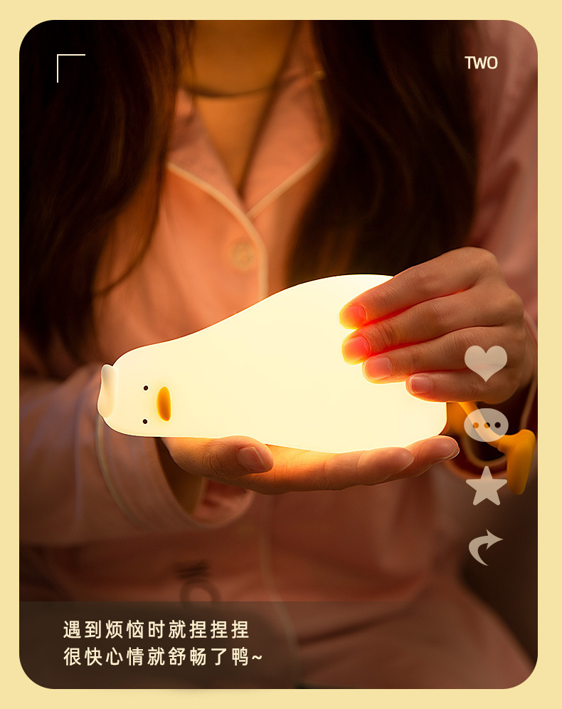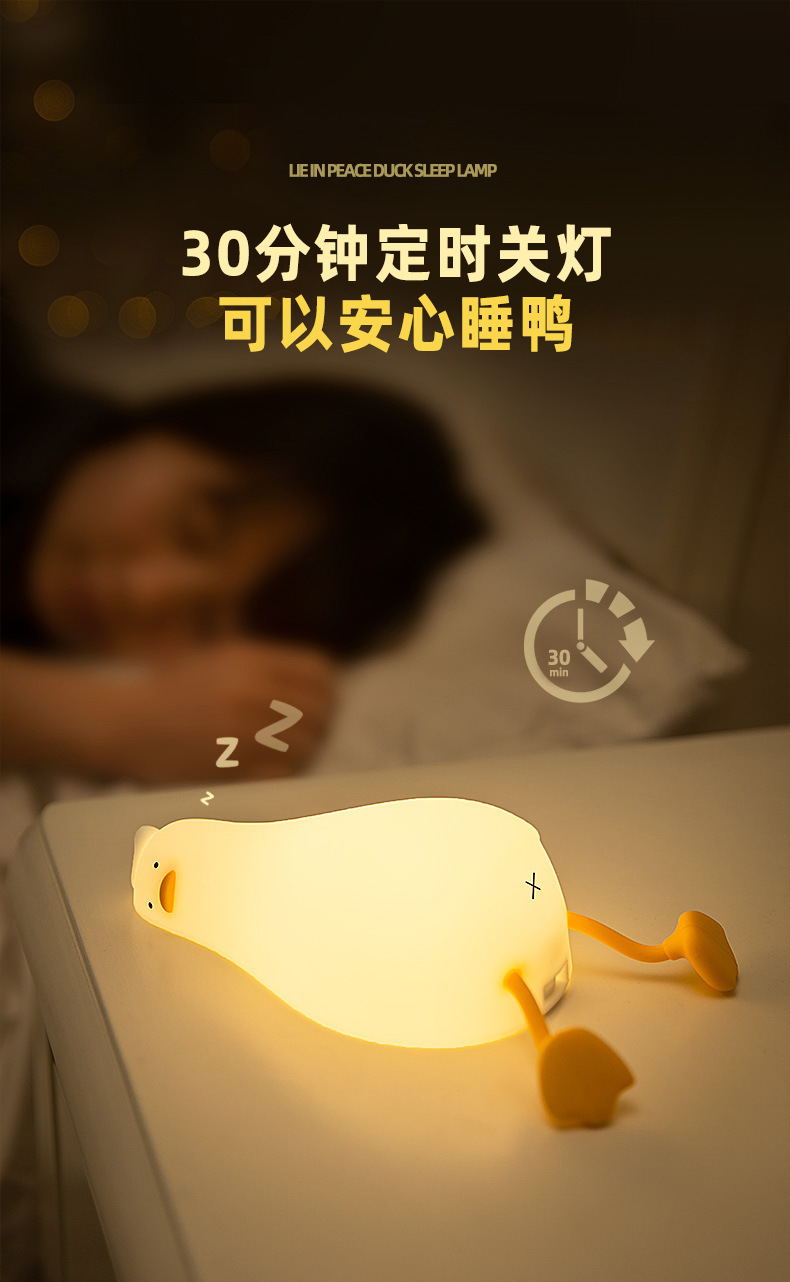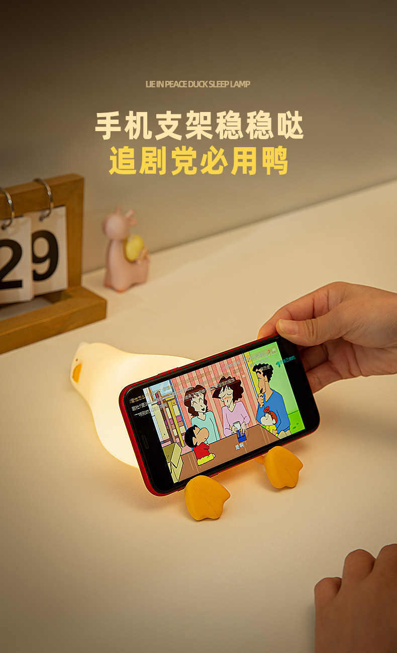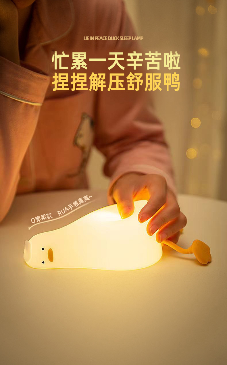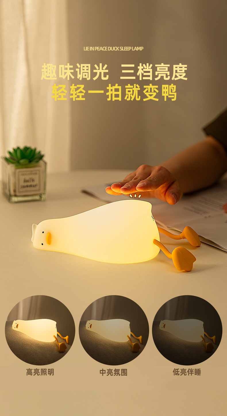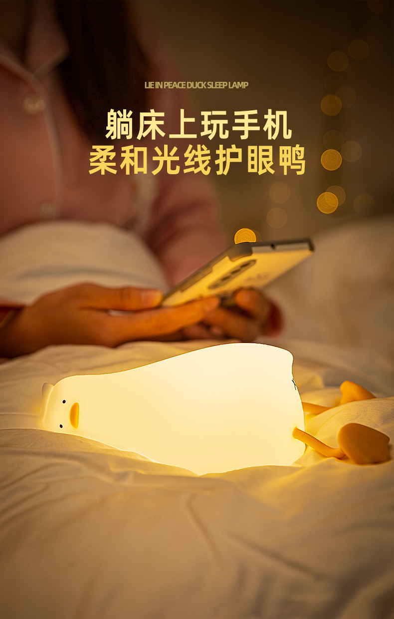 躺平鸭小夜灯翻身鸭硅胶LED 充电床头伴睡拍拍灯手机支架创意夜灯