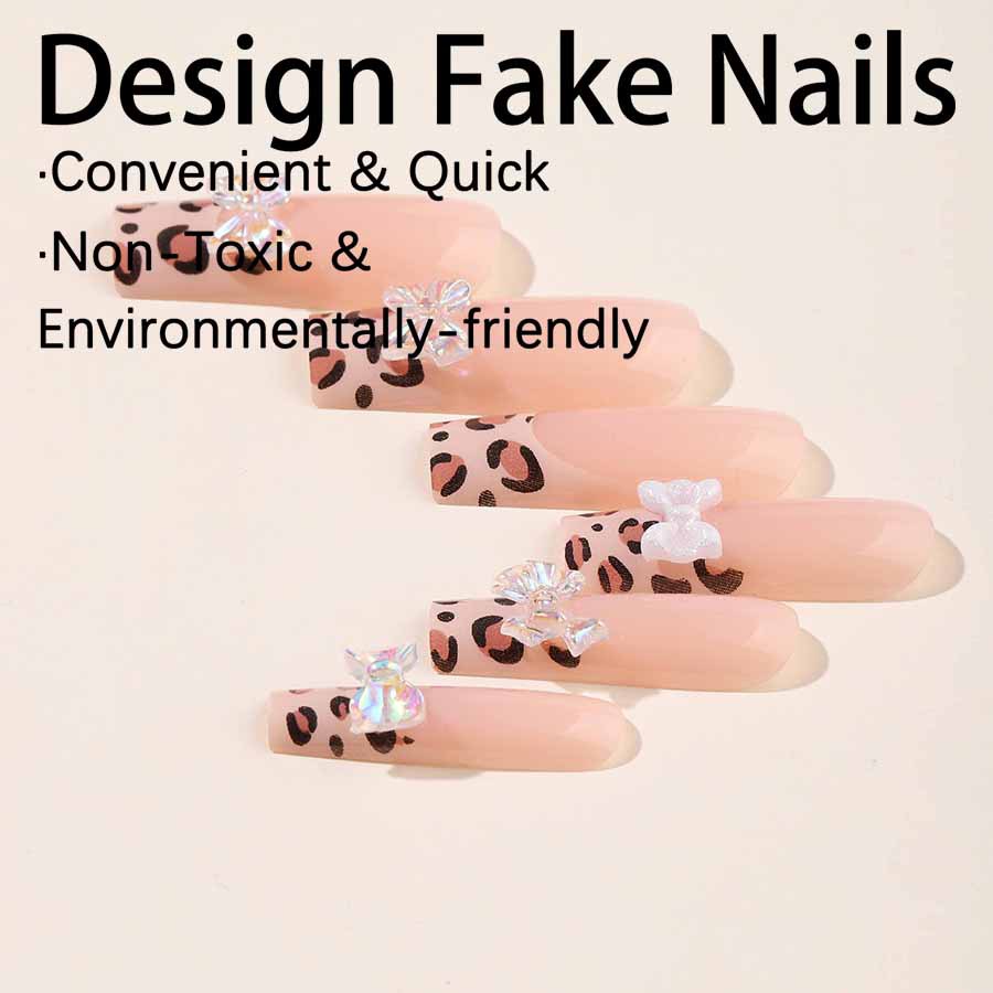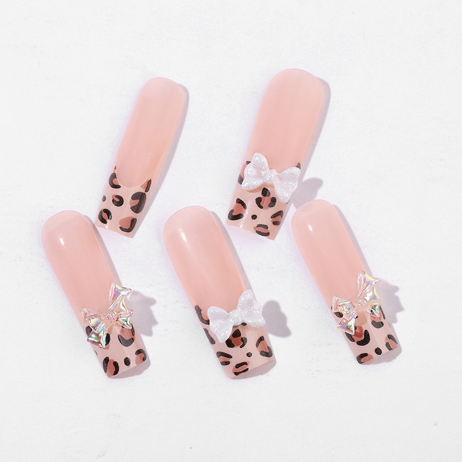 跨境专供美甲贴片法式豹纹蝴蝶结穿戴甲甲片批发长款指甲贴片成品