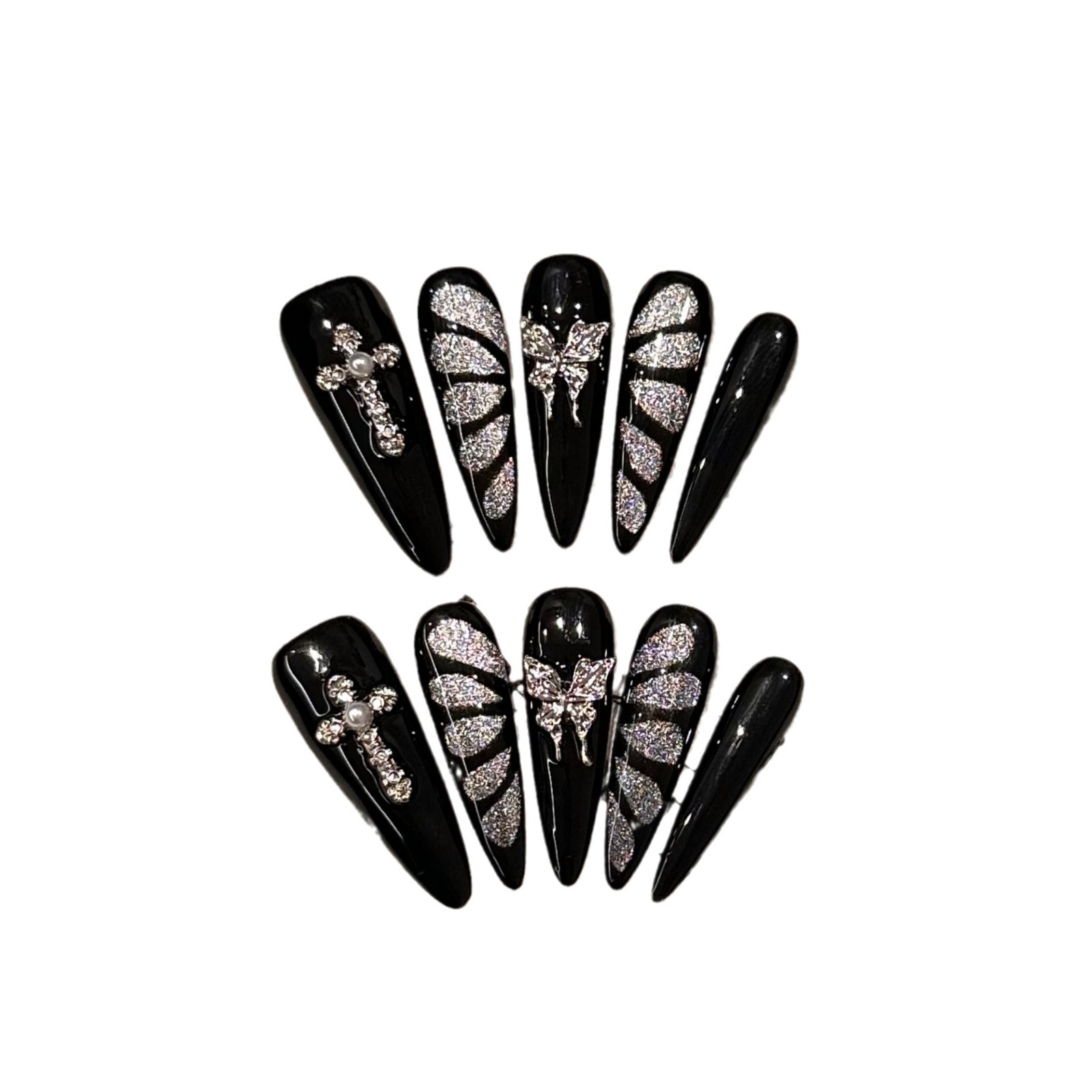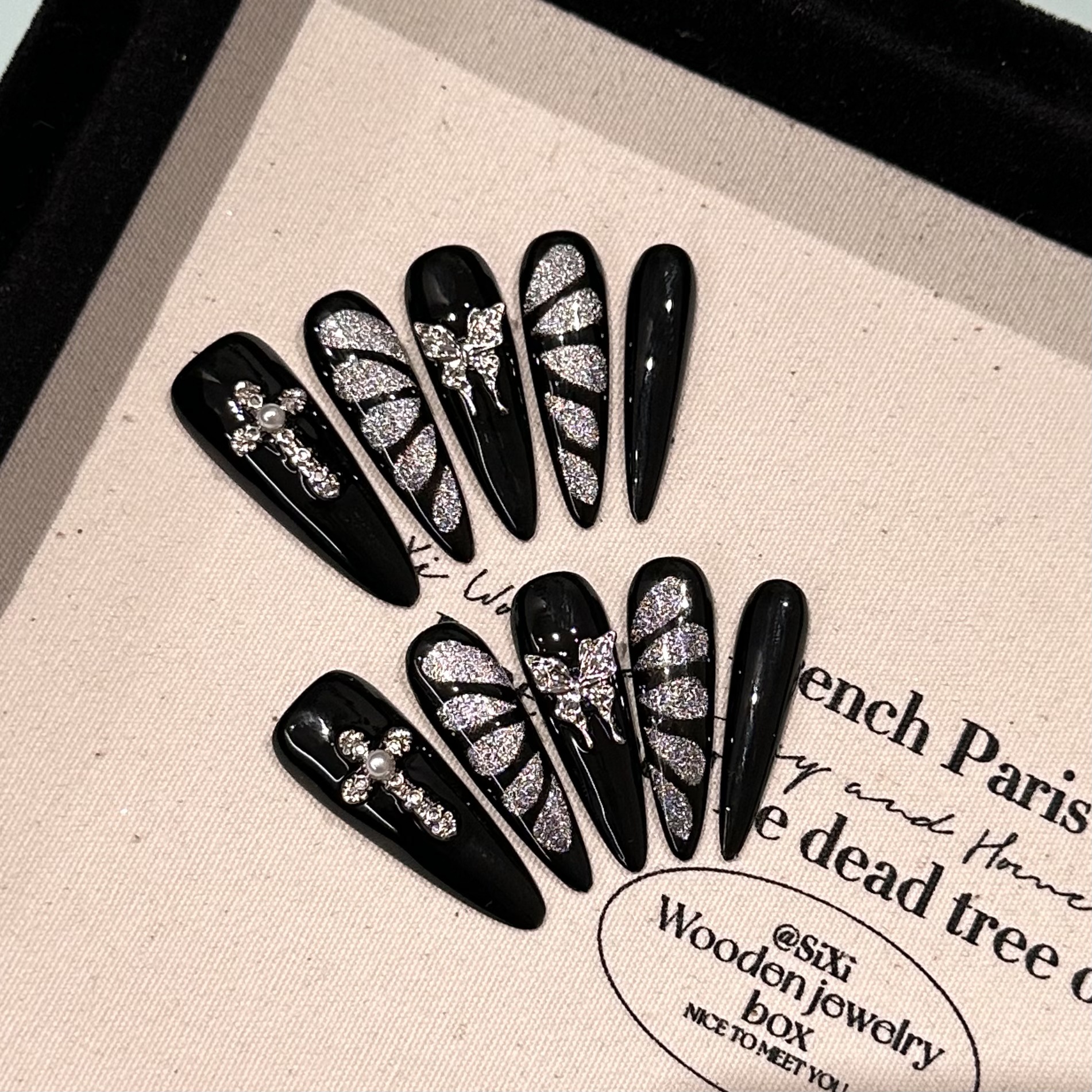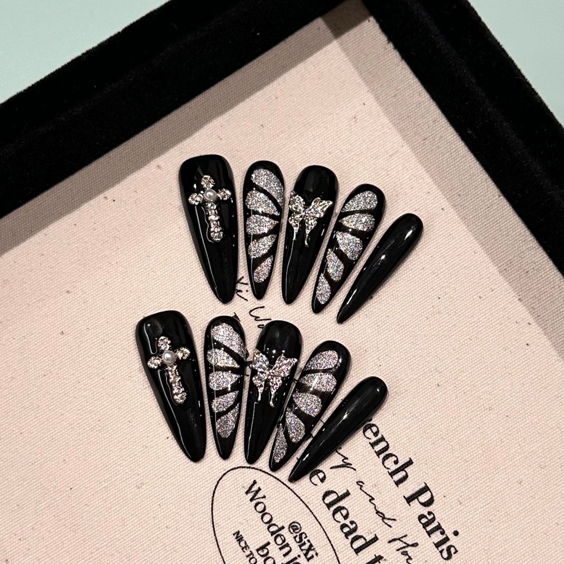 手工穿戴甲片高级感暗黑色银色猫眼美甲破茧蝴蝶轻奢气质显白指甲