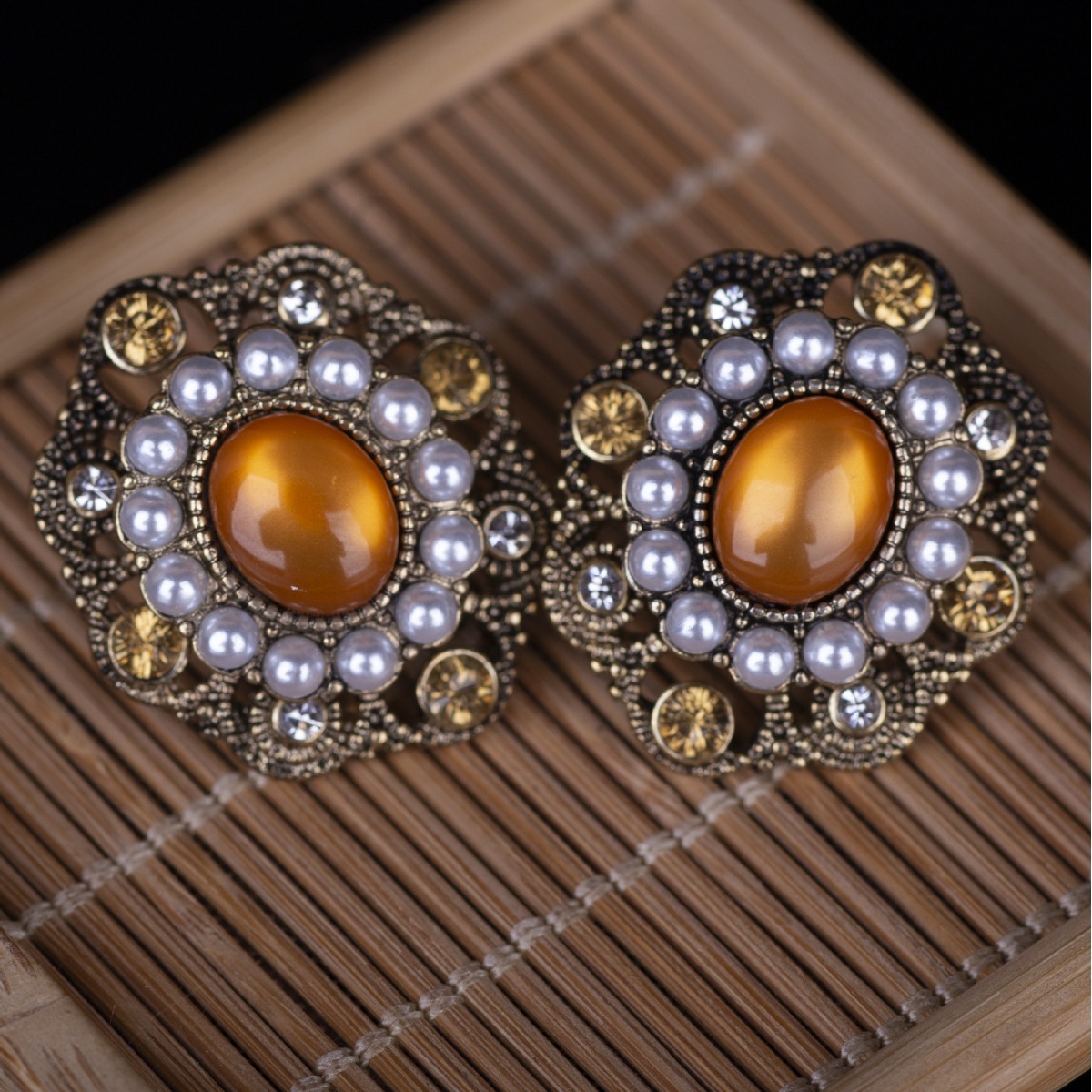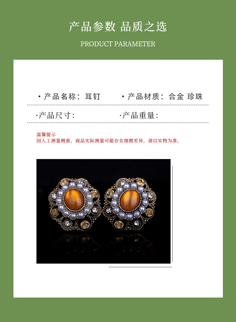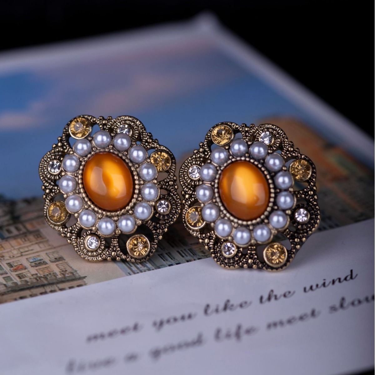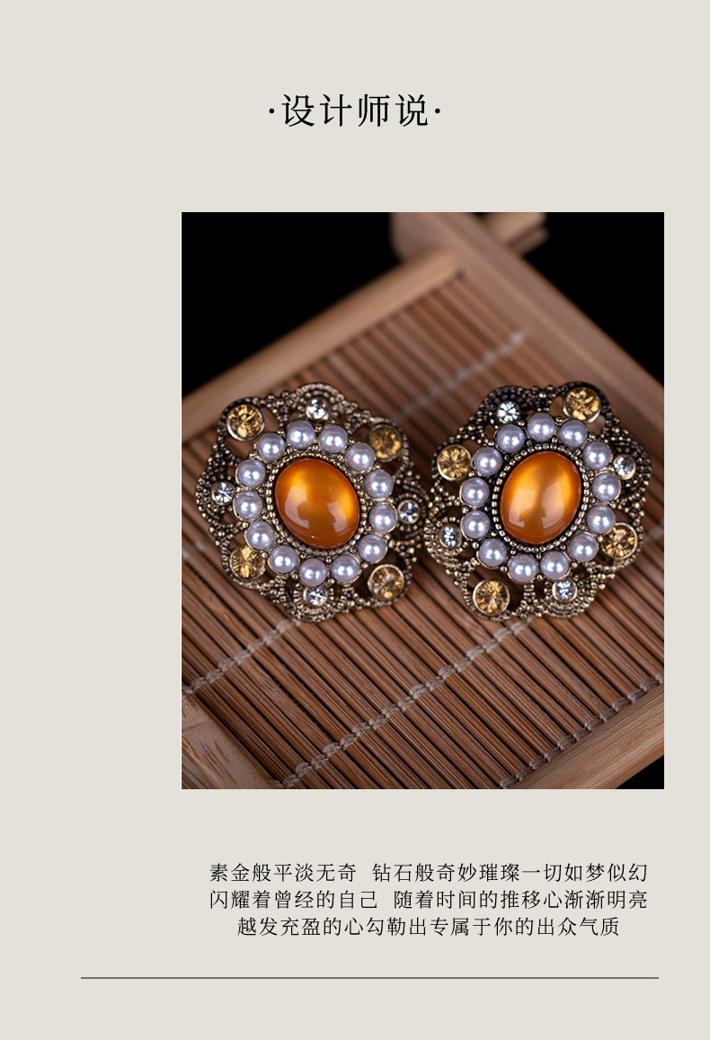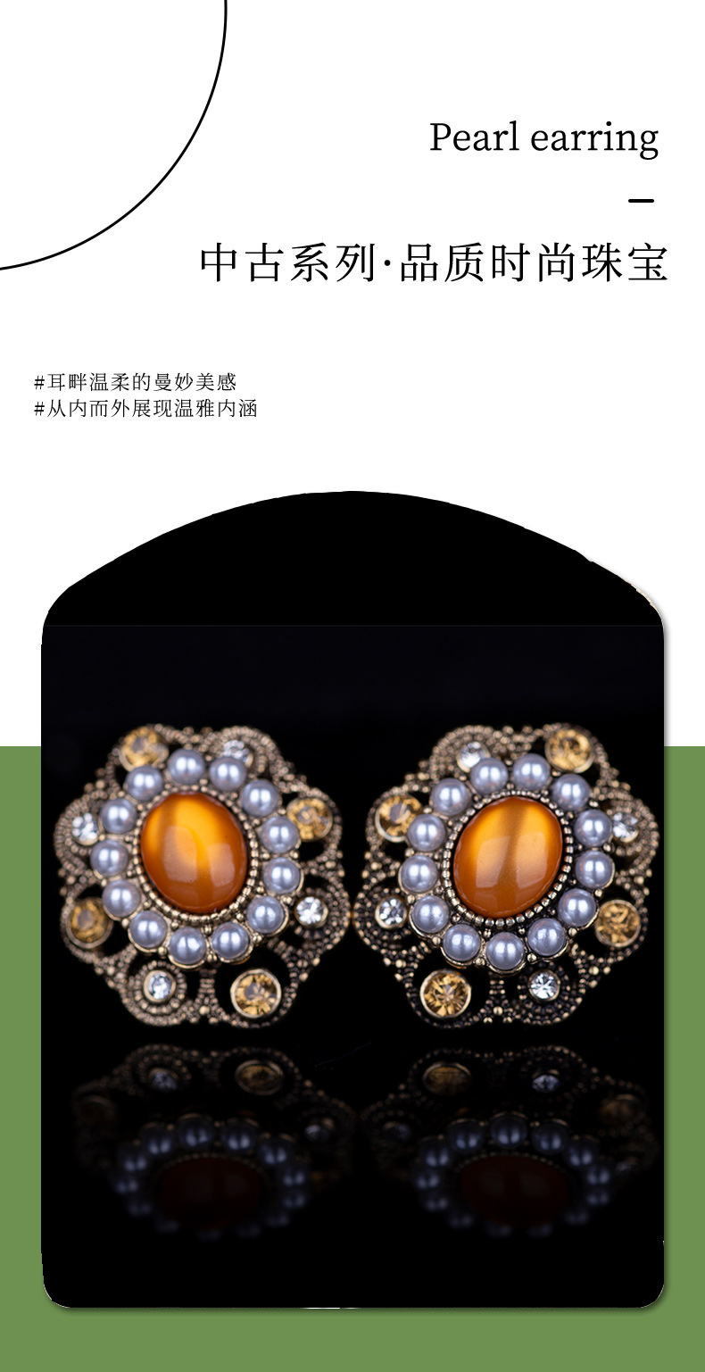 美拉德椭圆棕色虎眼石耳钉时尚百搭镶钻珍珠粉色猫眼石耳钉耳饰品
