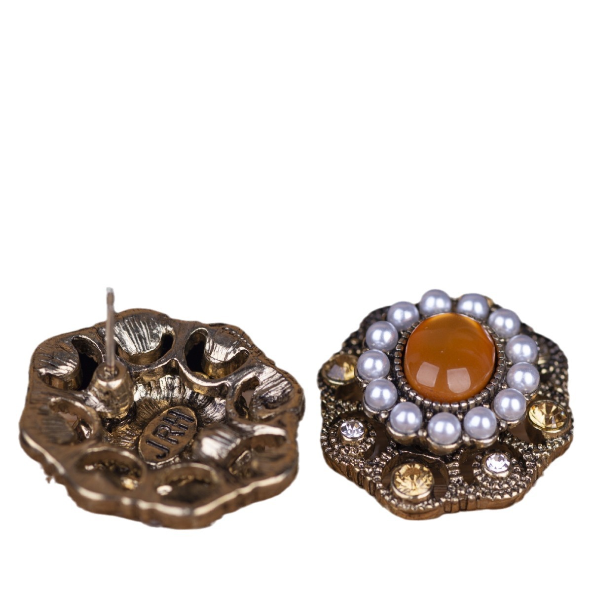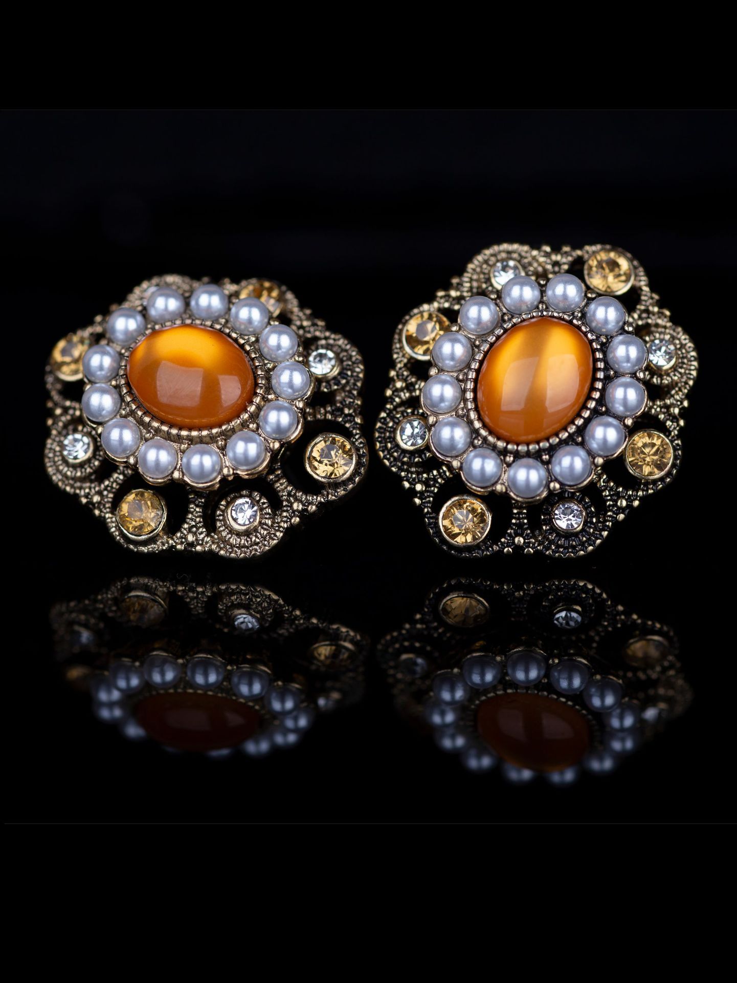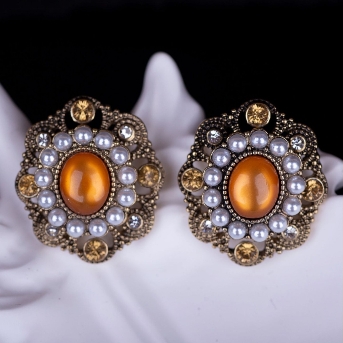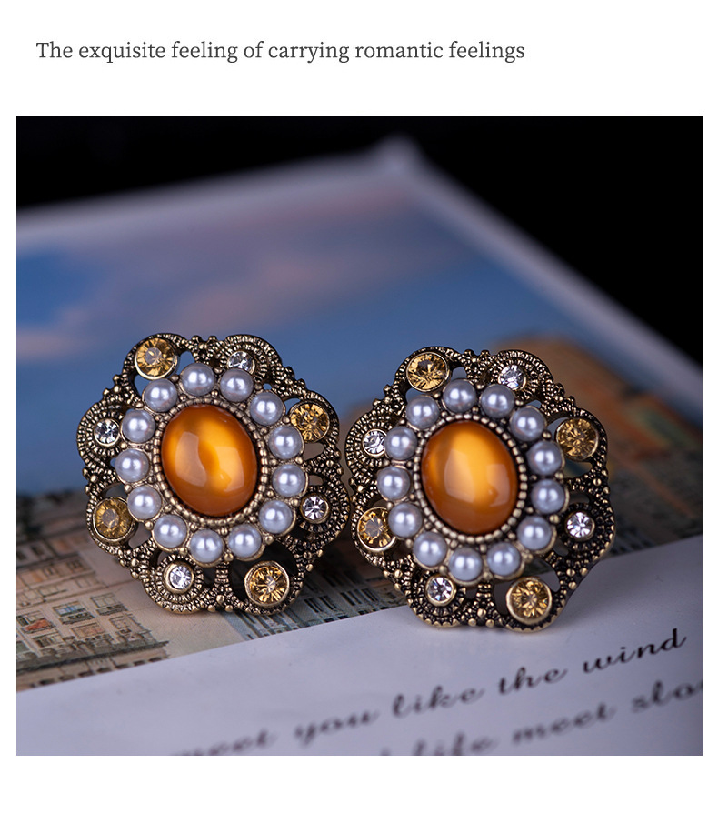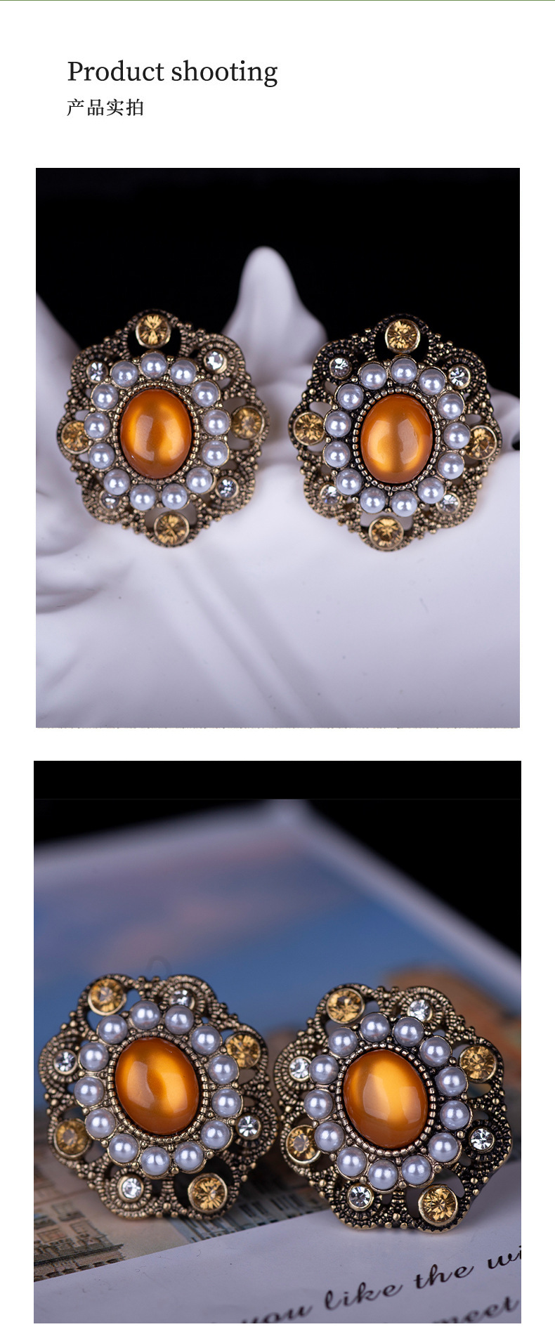 美拉德椭圆棕色虎眼石耳钉时尚百搭镶钻珍珠粉色猫眼石耳钉耳饰品