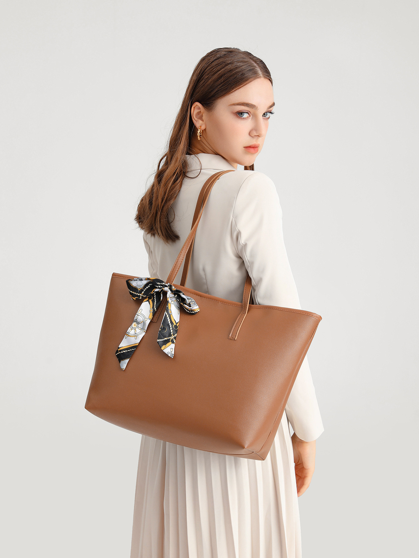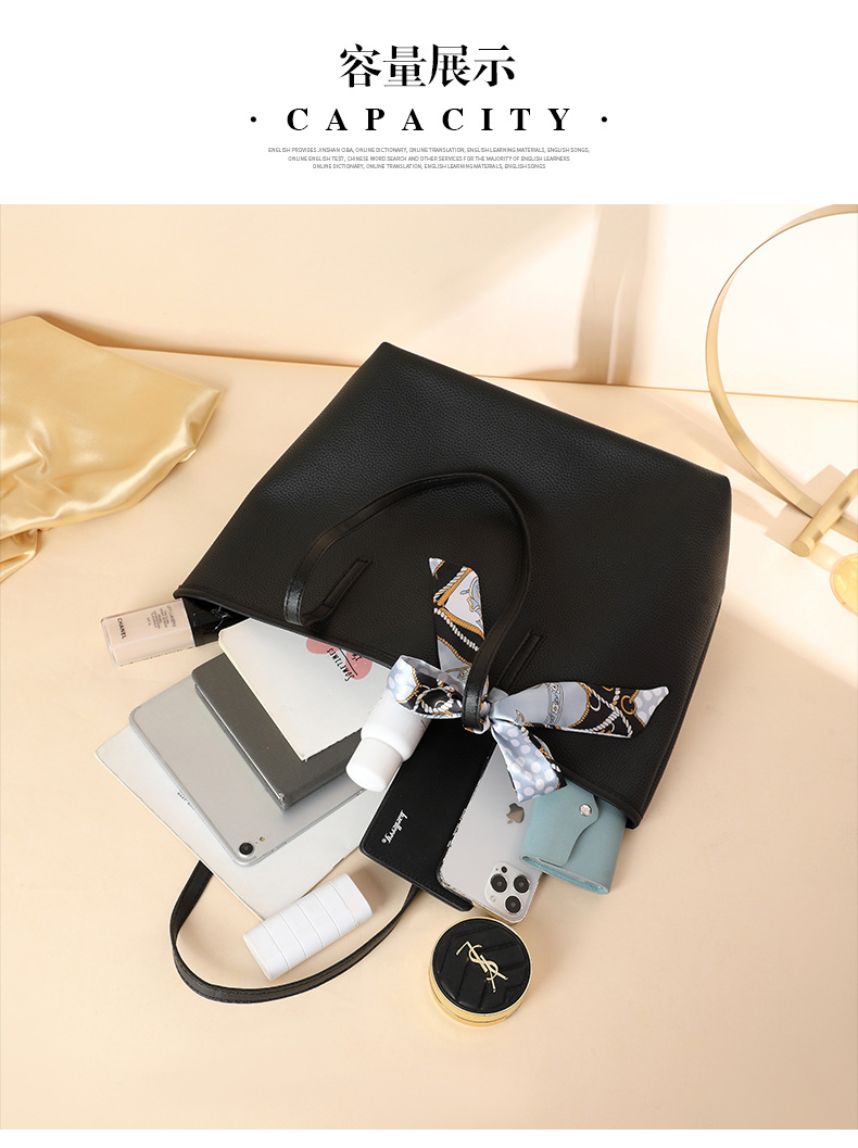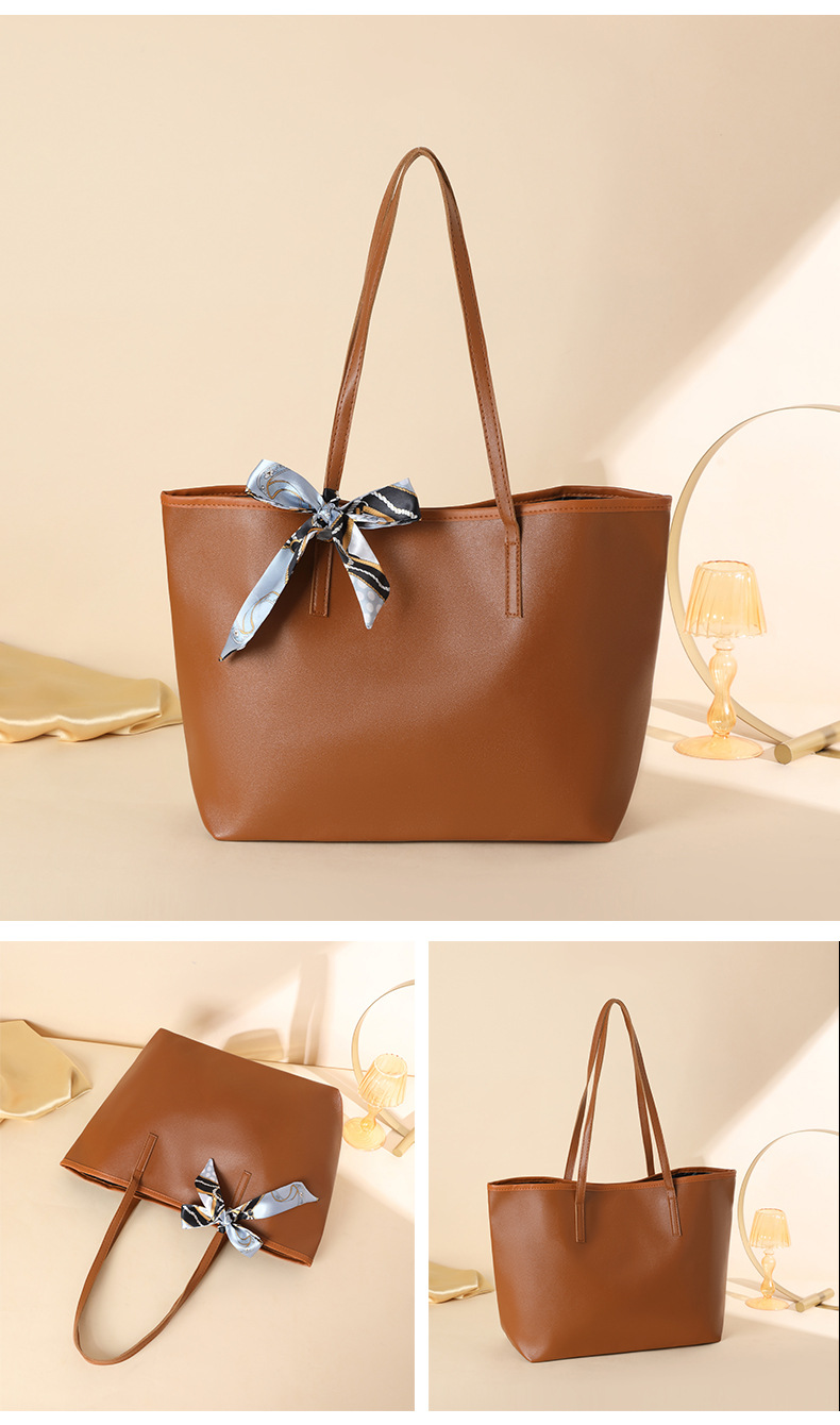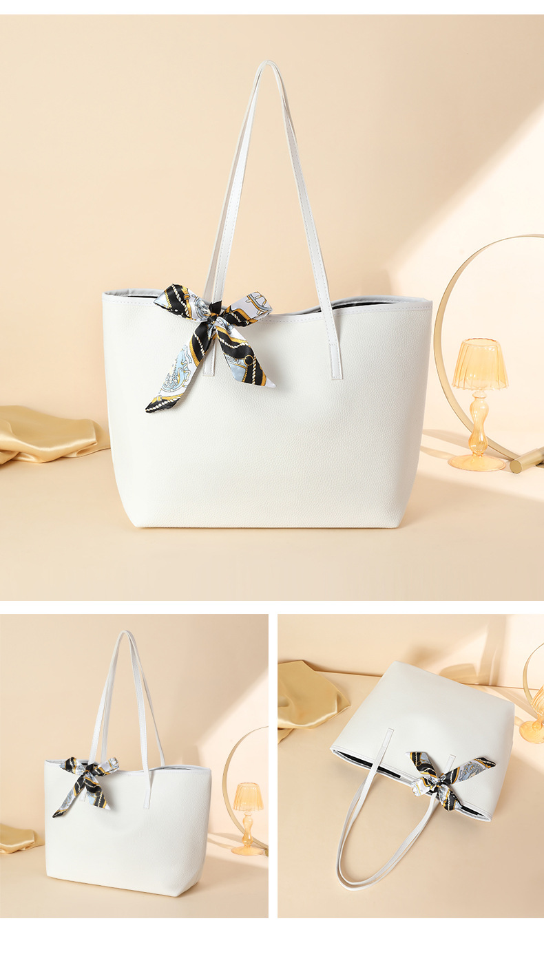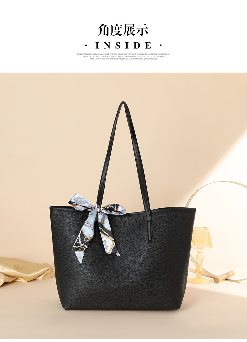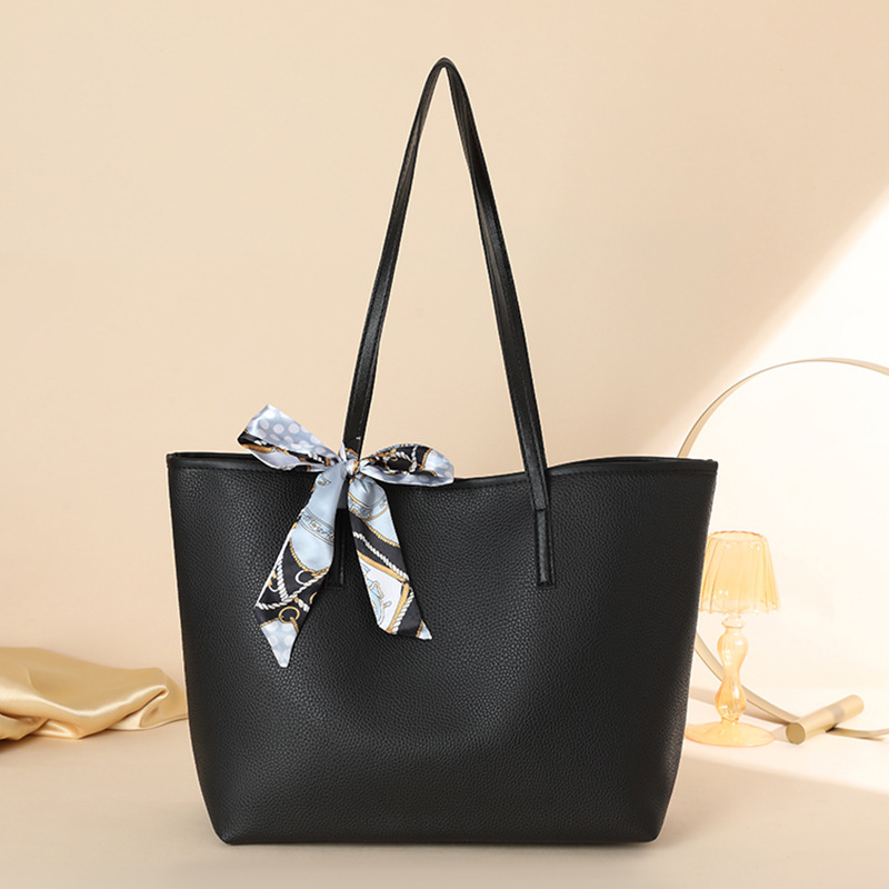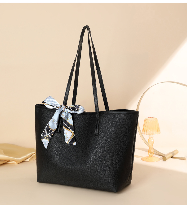 外贸时尚简约大容量托特包2024新款荔枝纹丝巾装饰纯色女士单肩包