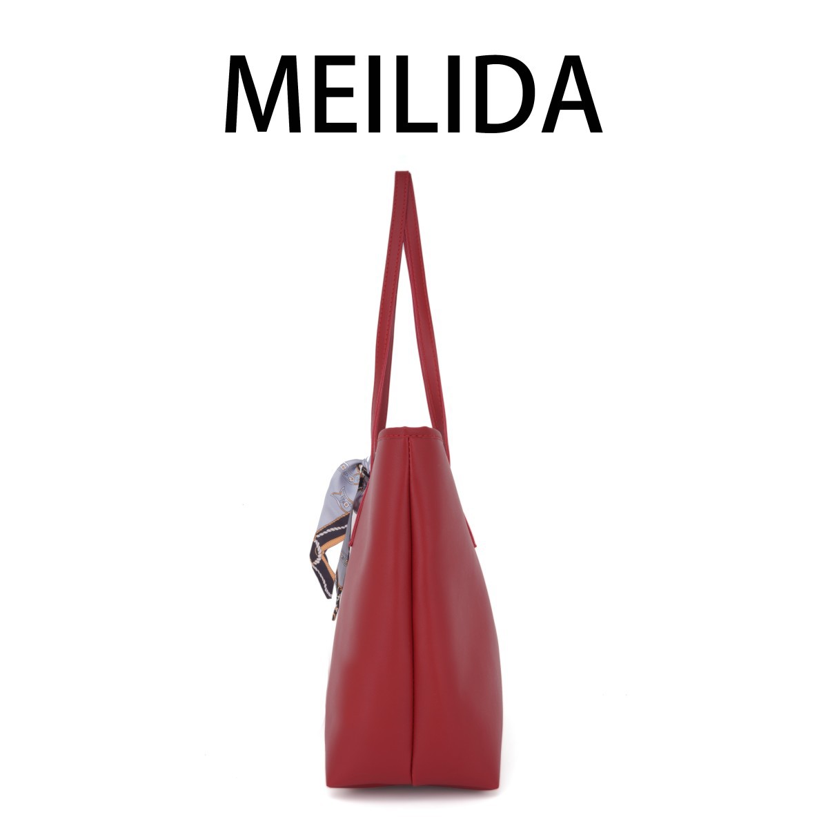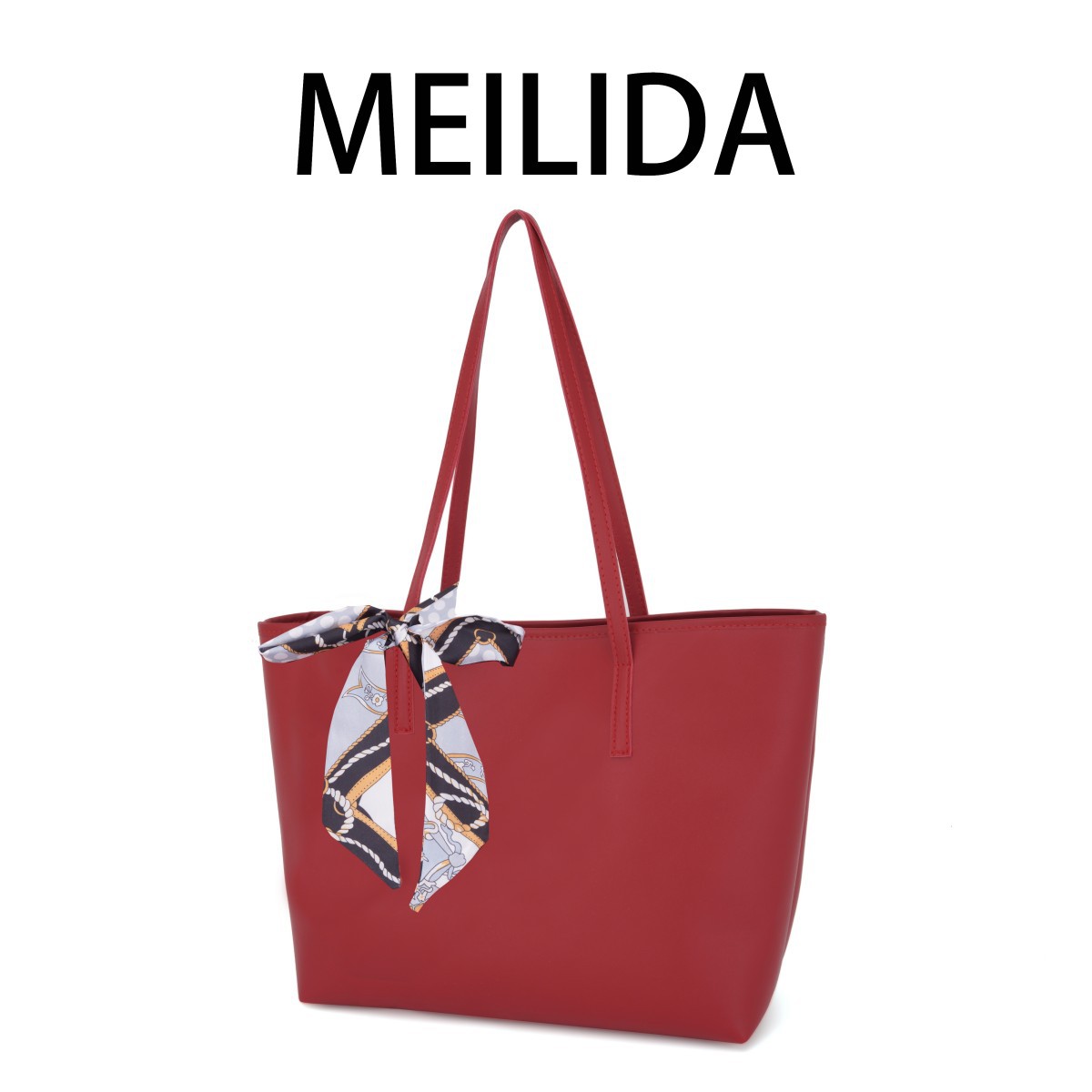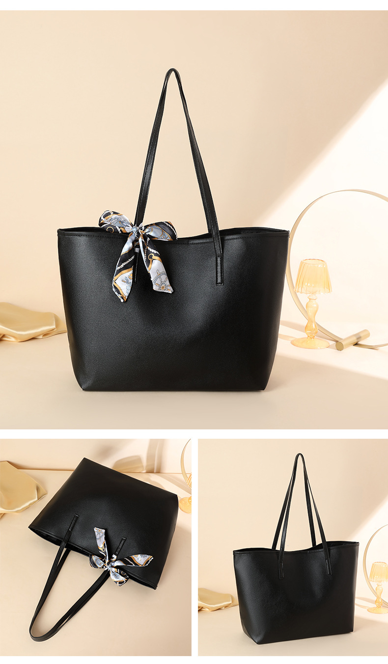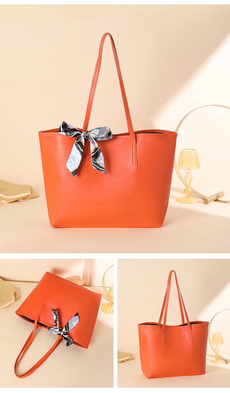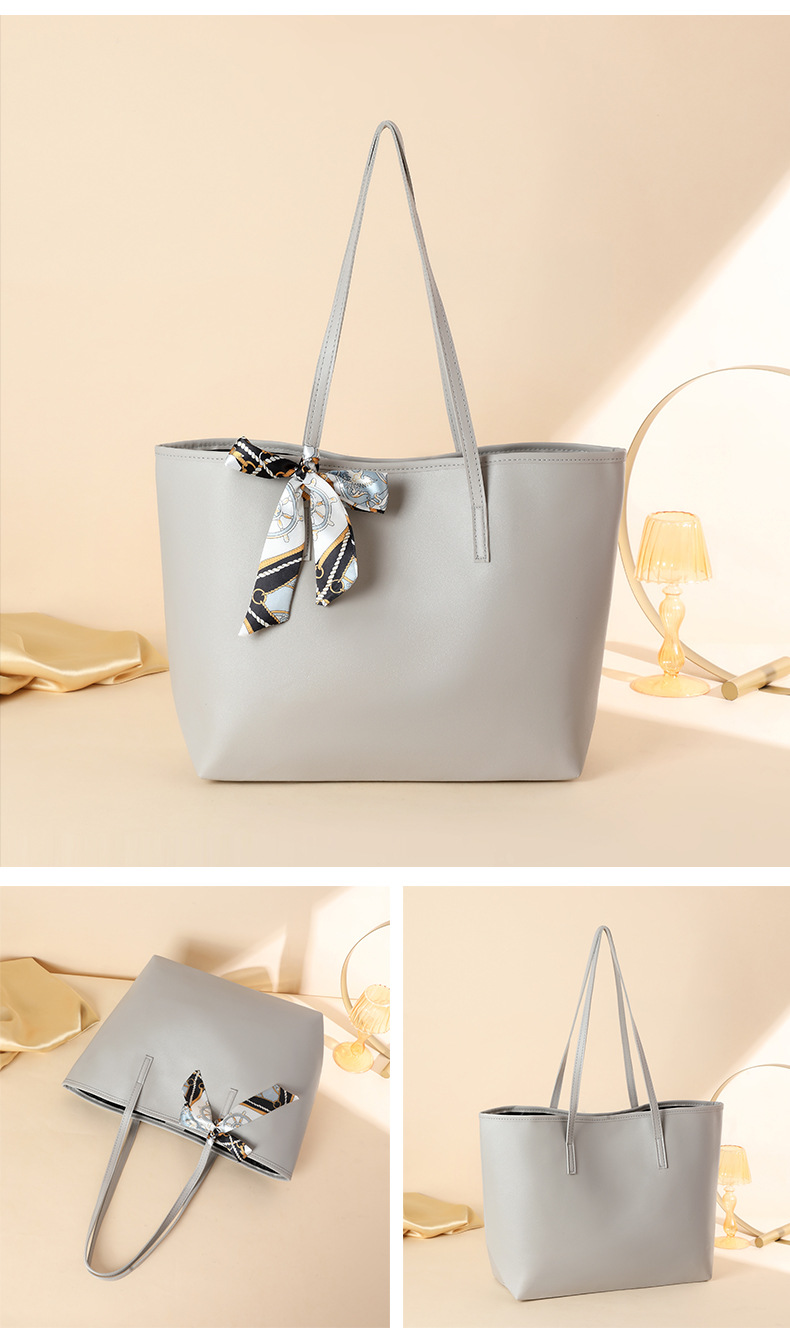 外贸时尚简约大容量托特包2024新款荔枝纹丝巾装饰纯色女士单肩包