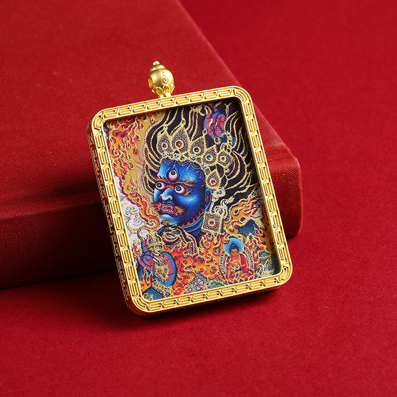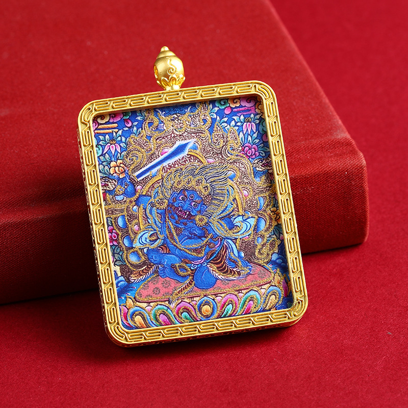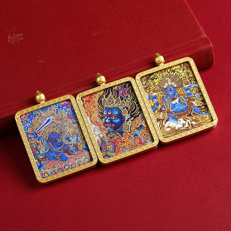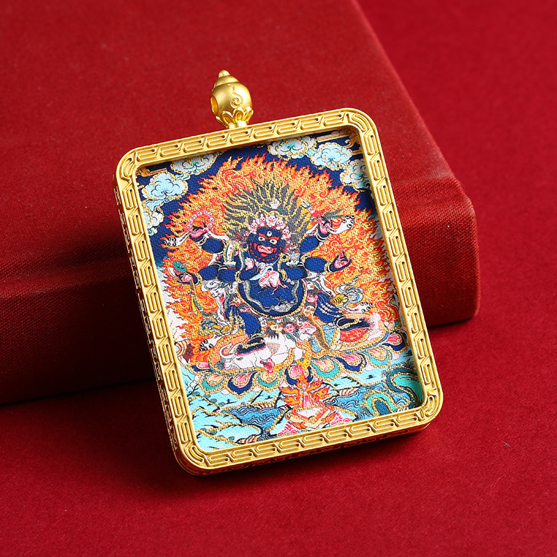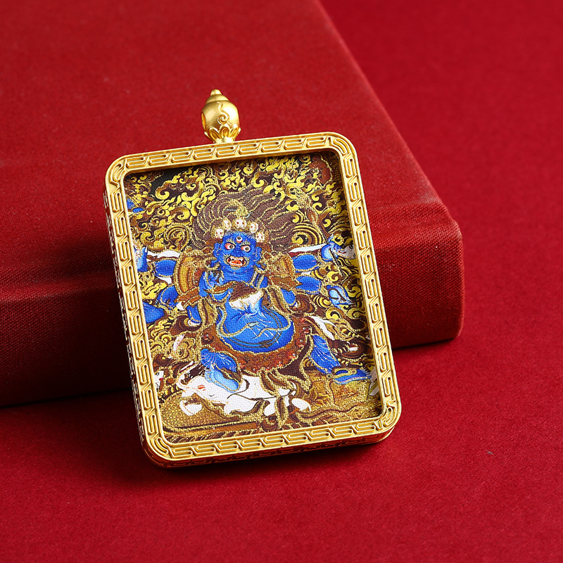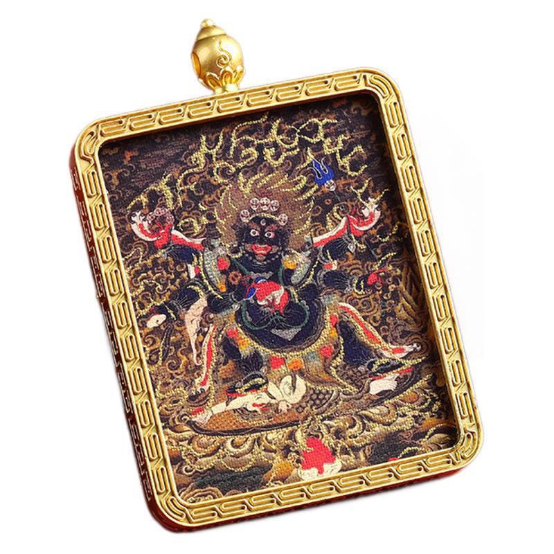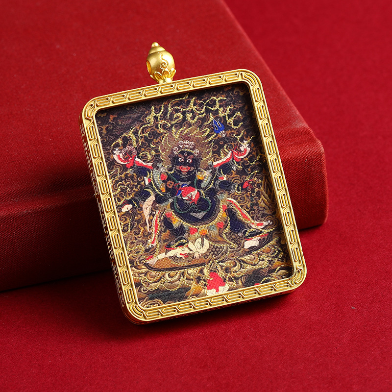 手绘描金大黑天黑财神龙五爷立体唐卡藏式嘎乌盒杠吊坠随身佛吊