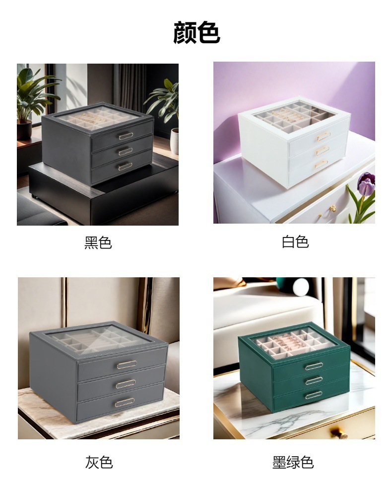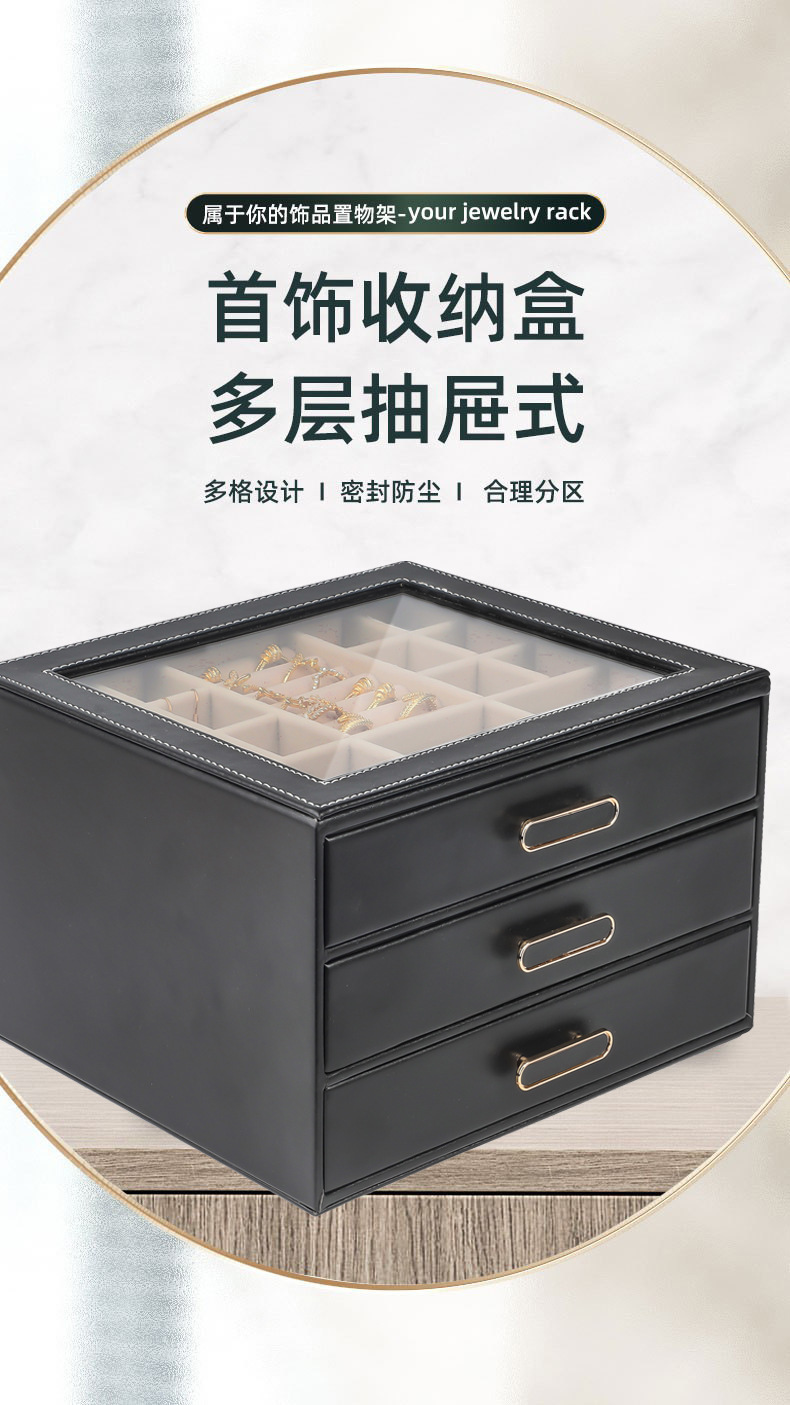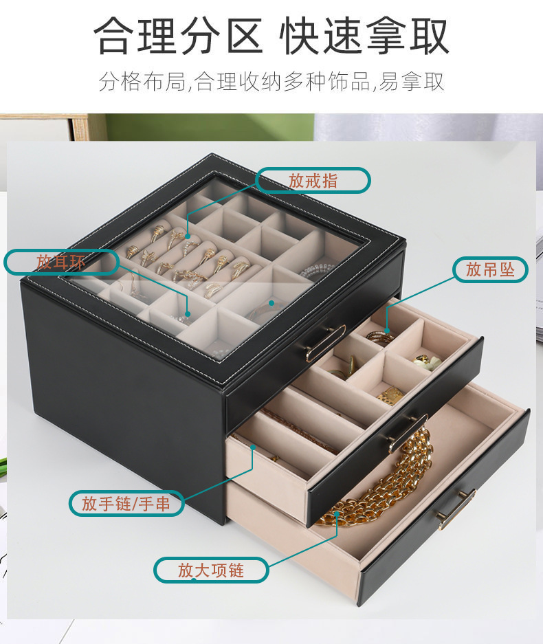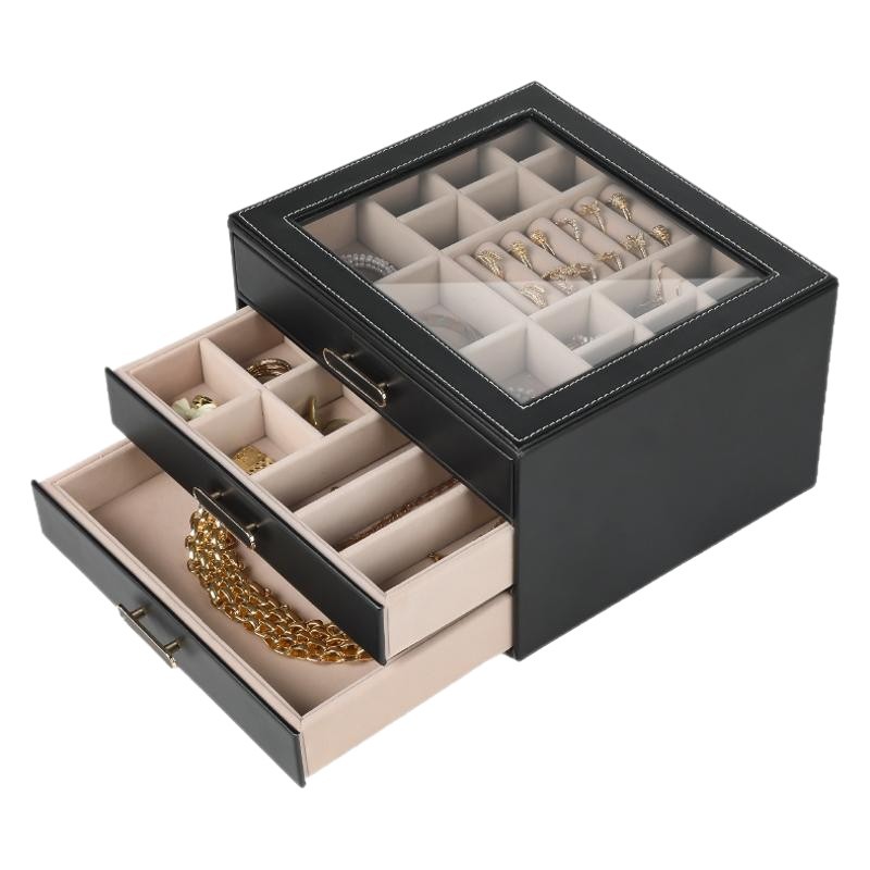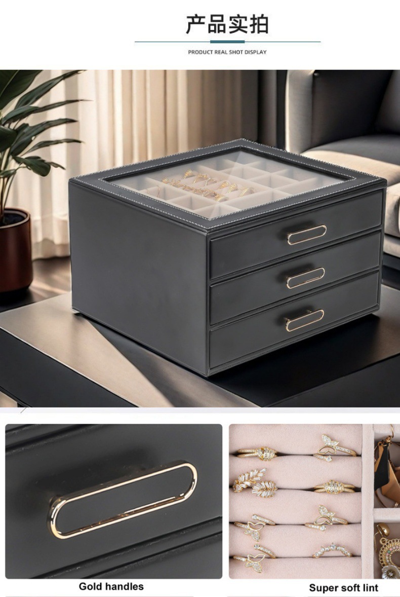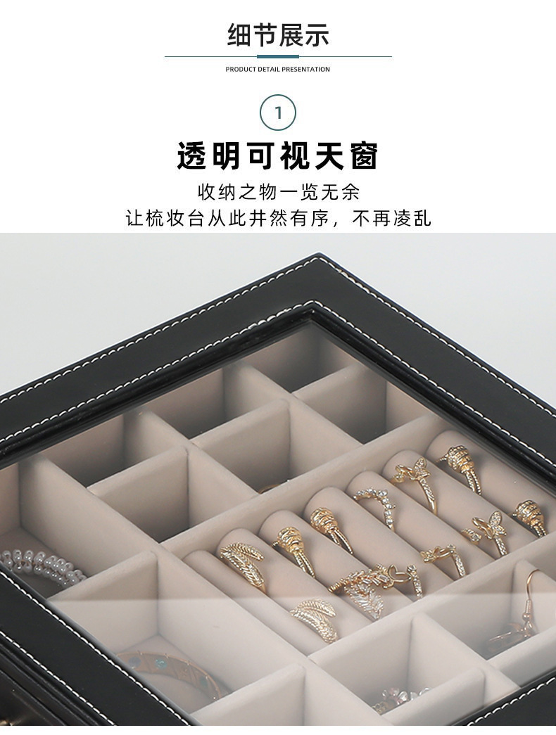 大容量三层首饰盒收纳盒透视款百宝耳环收纳饰品盒子PU材质戒指盒