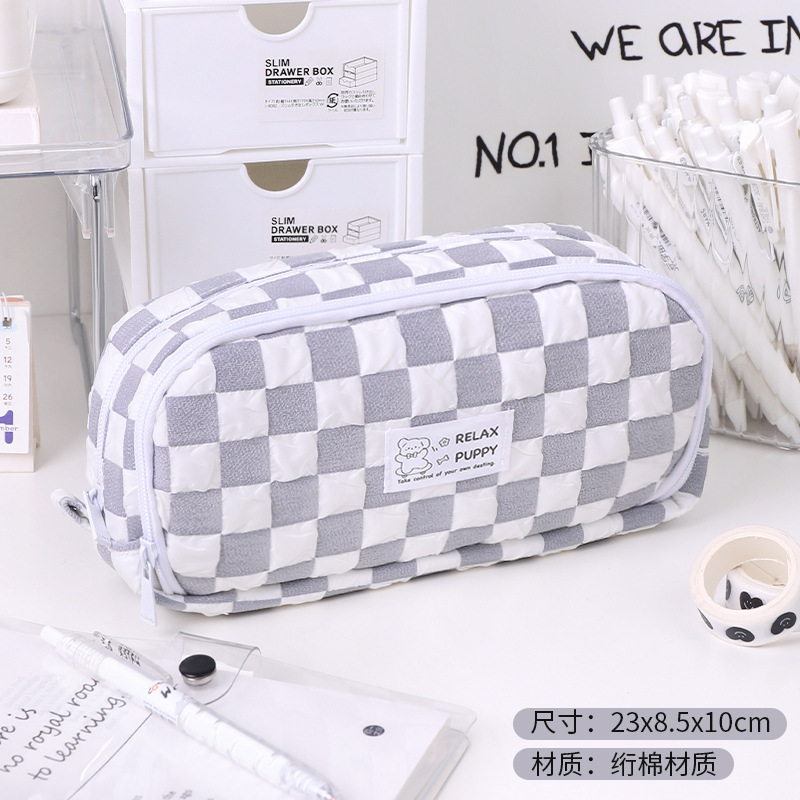 手提简约大容量棋盘格笔袋 2022日系女孩高颜值收纳文具袋铅笔盒
