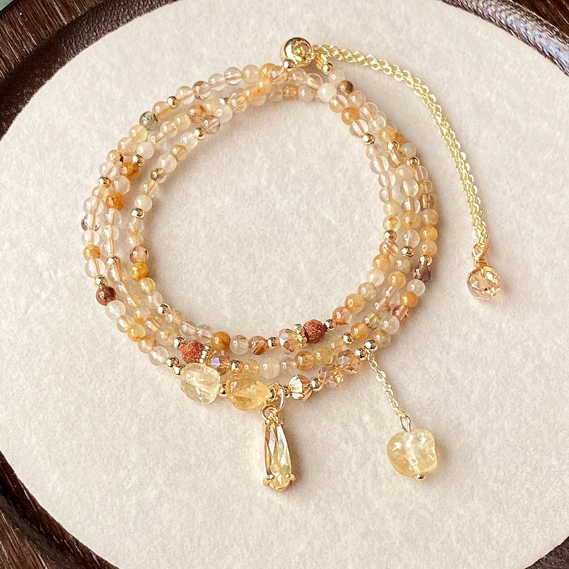 天然水晶珠宝多层 焦糖色黄兔毛黄水晶 发晶三圈手串手链手饰批发