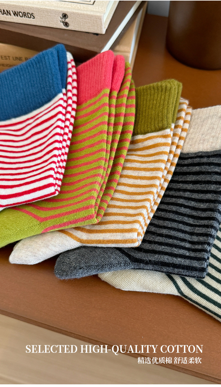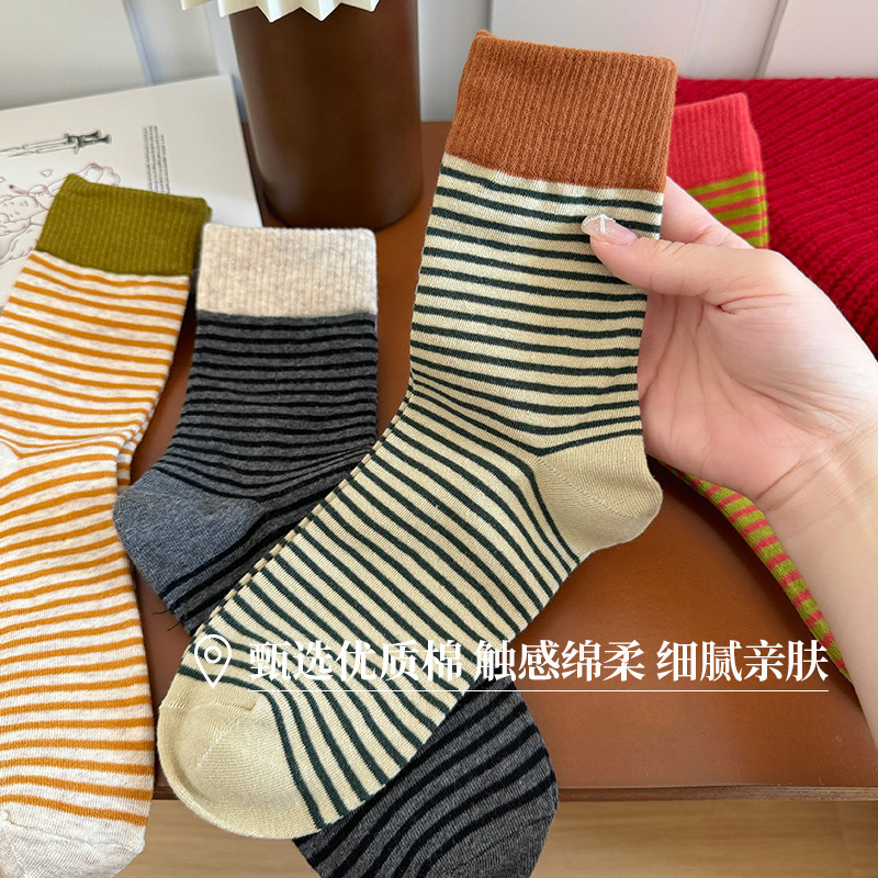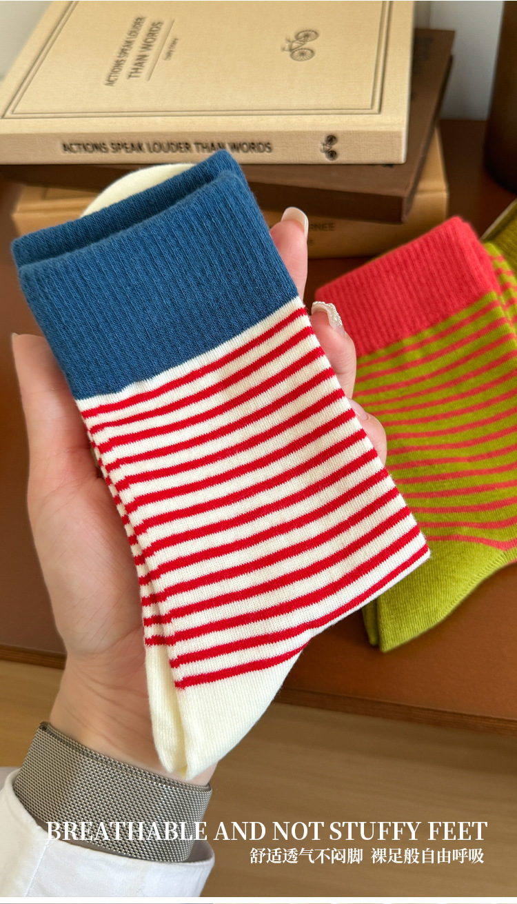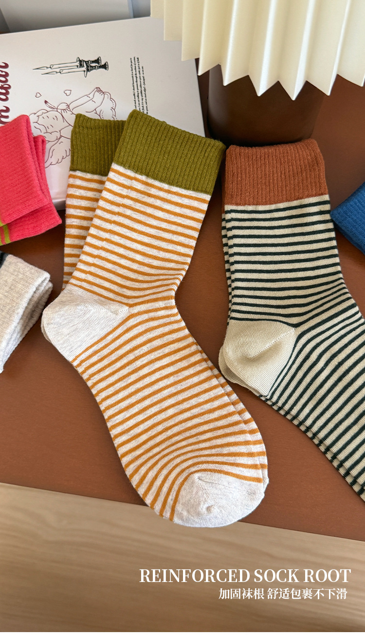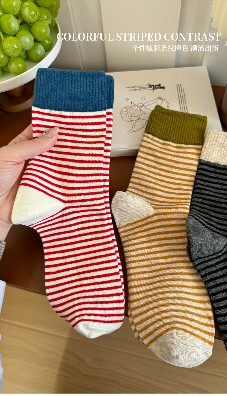 韩版撞色条纹袜子女秋款中筒袜ins潮网红港维斯长筒袜女冬季棉袜