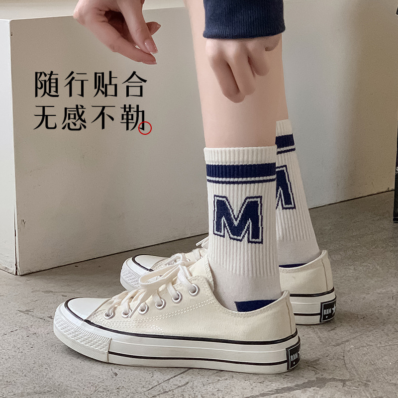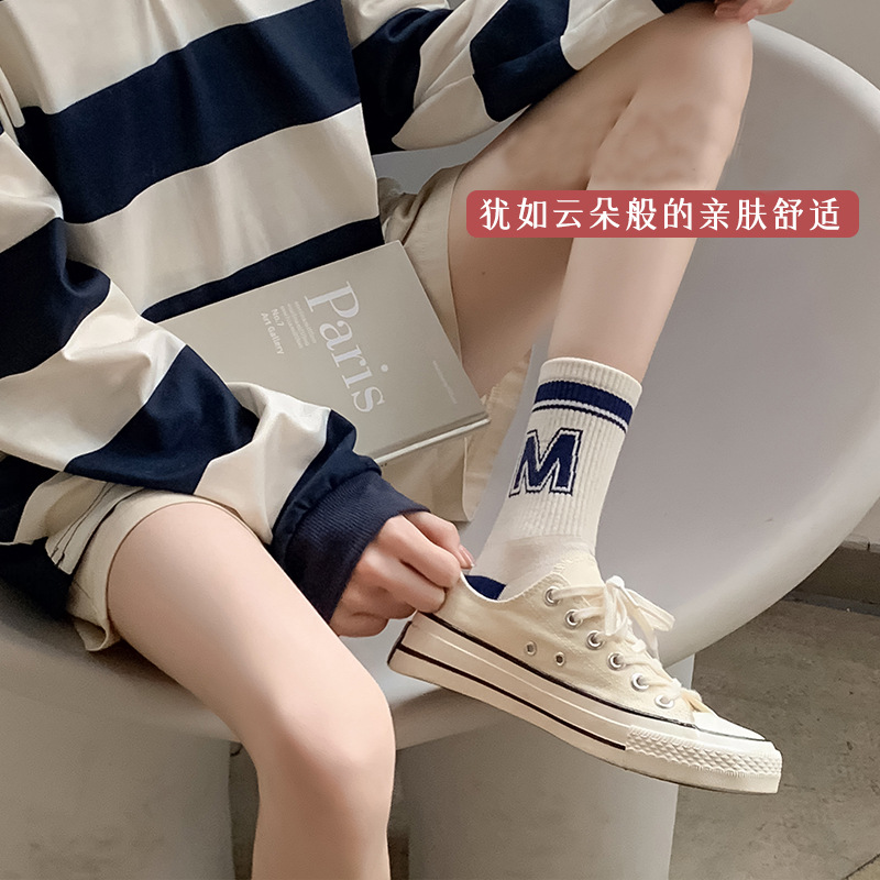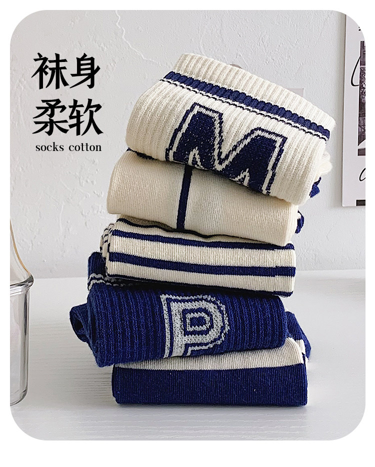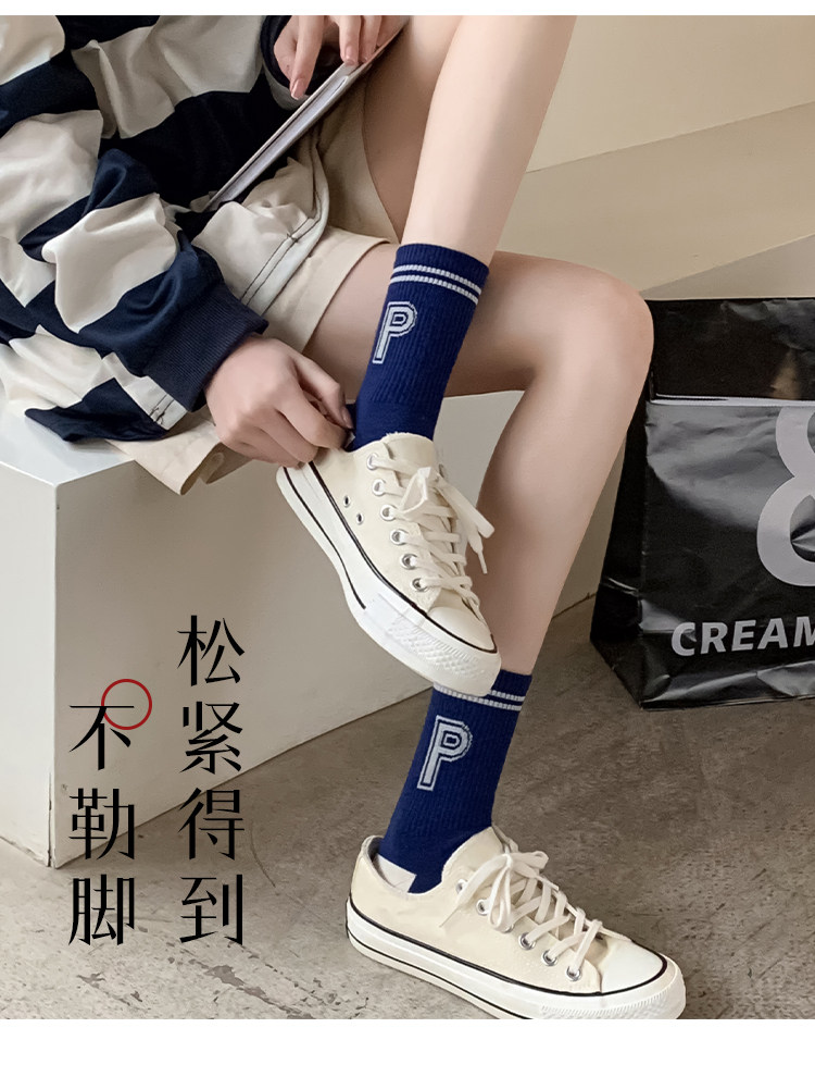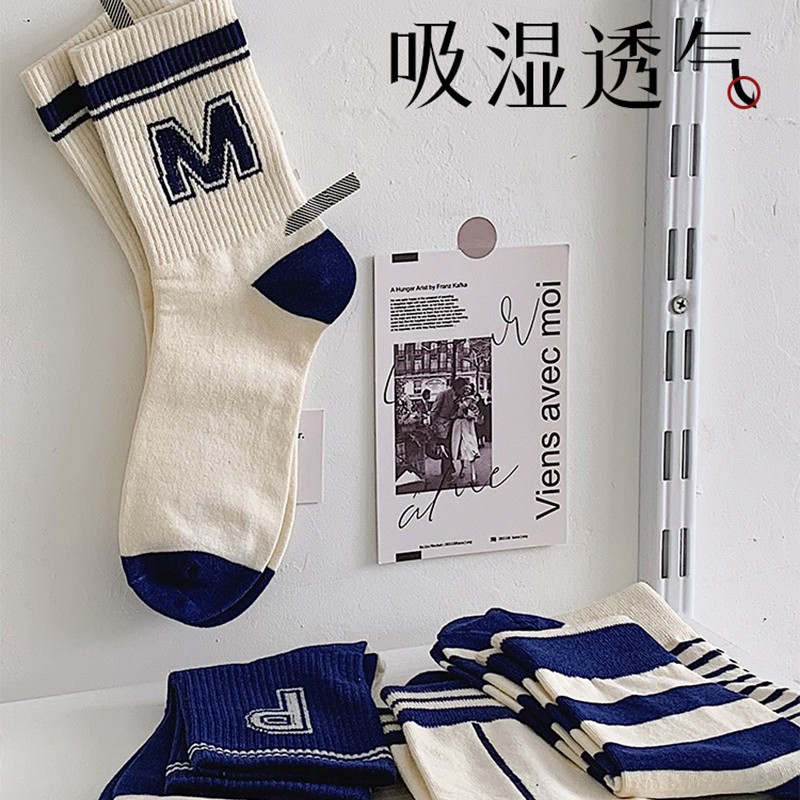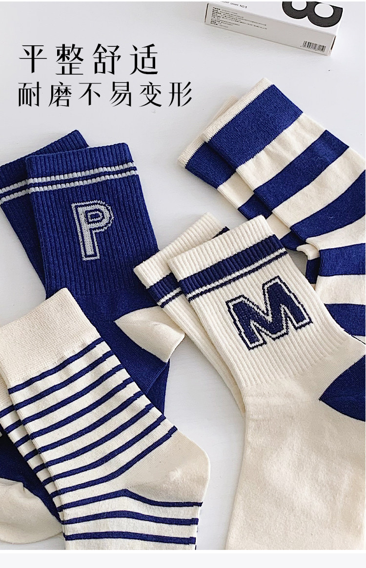 大P袜子女潮M字中筒袜百搭条纹P克莱茵蓝色运动春秋冬季棉袜