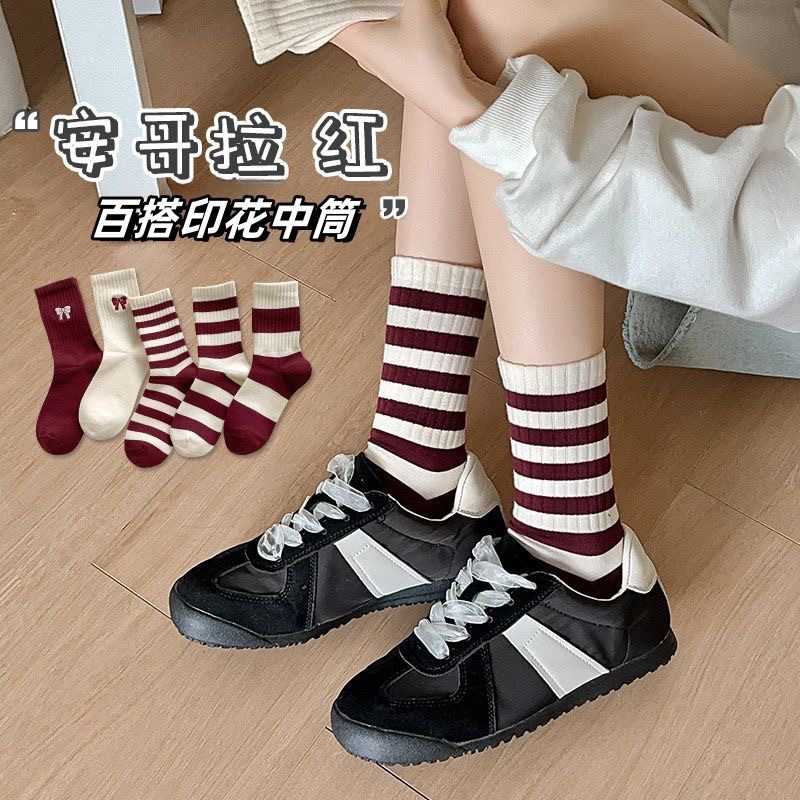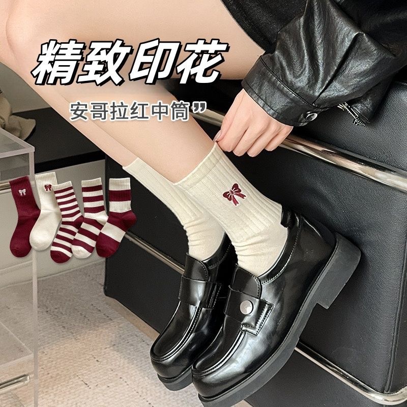 安可拉红袜子女蝴蝶结无骨中筒条纹提花堆堆袜秋冬ins潮网红长袜